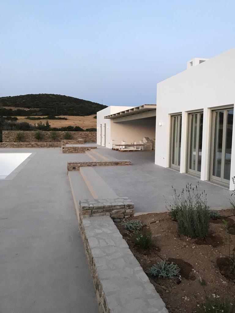 Σεβόμενος τα δέντρα και την μοναδική θέα, ο αρχιτέκτονας σχεδίασε το σχήμα της βίλλας γύρω από έναν κέδρο που βρίσκεται στην μέση της ιδιοκτησίας, δημιουργώντας έτσι μία αυλή που μπορεί να χωρέσει άνετα 10 άτομα για δείπνο. Μία ταράτσα που προσφέρει θέα στη θάλασσα και το ηλιοβασίλεμα, είναι προσβάσιμη μέσω του μεγάλου υπνοδωματίου στον πρώτο όροφο, ή μέσω μιας σειράς σκαλοπατιών από την αυλή. Η αμμουδερή παραλία είναι μόλις δέκα λεπτά περπάτημα, και το κύριο χωριό της Αντιπάρου με τα εστιατόριά του και τα καφέ του είναι επίσης σε κοντινή απόσταση.
