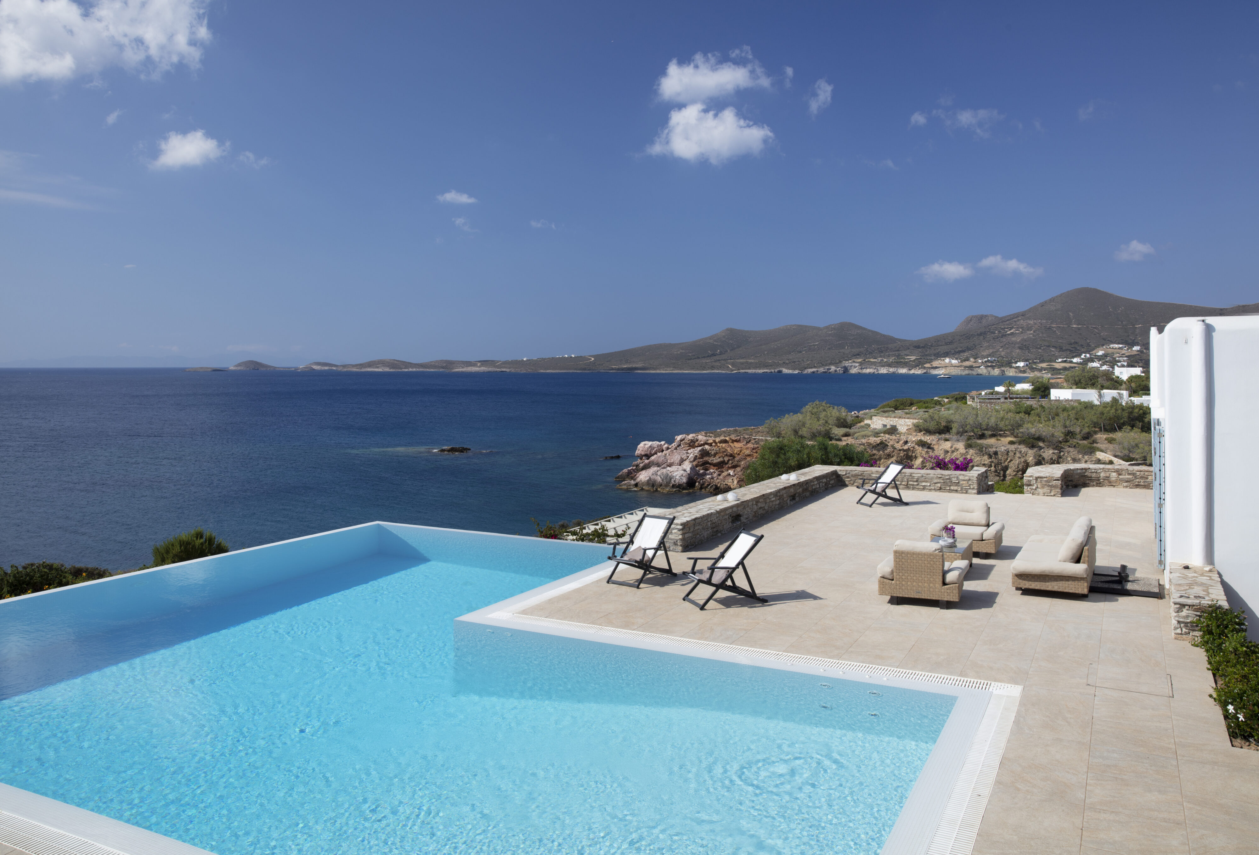 Elegant yet simple in design, this Cycladic-style villa sits just back from the popular sandy Soros Beach, while maintaining an easy sense of privacy for its guests. Sleeping up to 10 guests in six bedrooms, life at Allium centers around its sublime L-shaped infinity pool, which seems to drop dramatically into the deep blue of the Aegean below. With various lounging and dining areas outside, this villa is made for relaxed, alfresco living with friends or family.