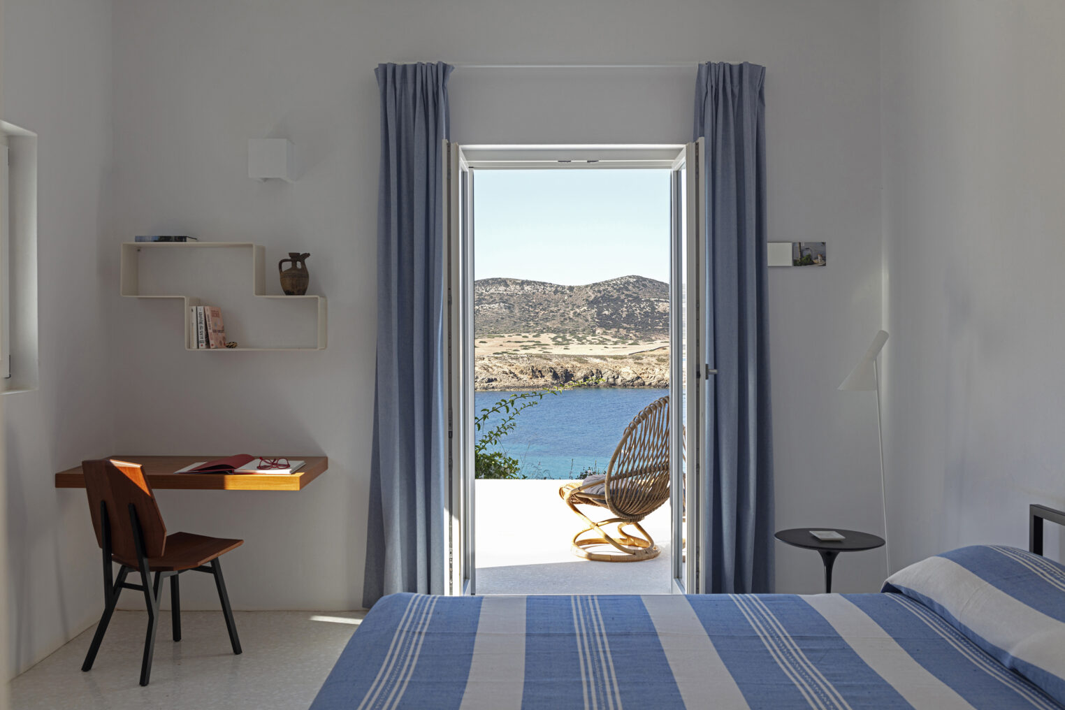 Located on the south-west of Antiparos, looking out towards the ancient site of Despotiko, APS is a compact, Cycladic-inspired villa that is much more spacious than its compact exterior suggests. Sleeping up to 12 in six bedrooms, guests will love the house’s rooftop living space, with its expansive sea and sunset views, as well as the gallerist owner’s impressive art collection. Sheltered from the northern winds, APS is a 15-minute walk from a sandy beach, or guests can take a dip off the rocks just beneath the house.