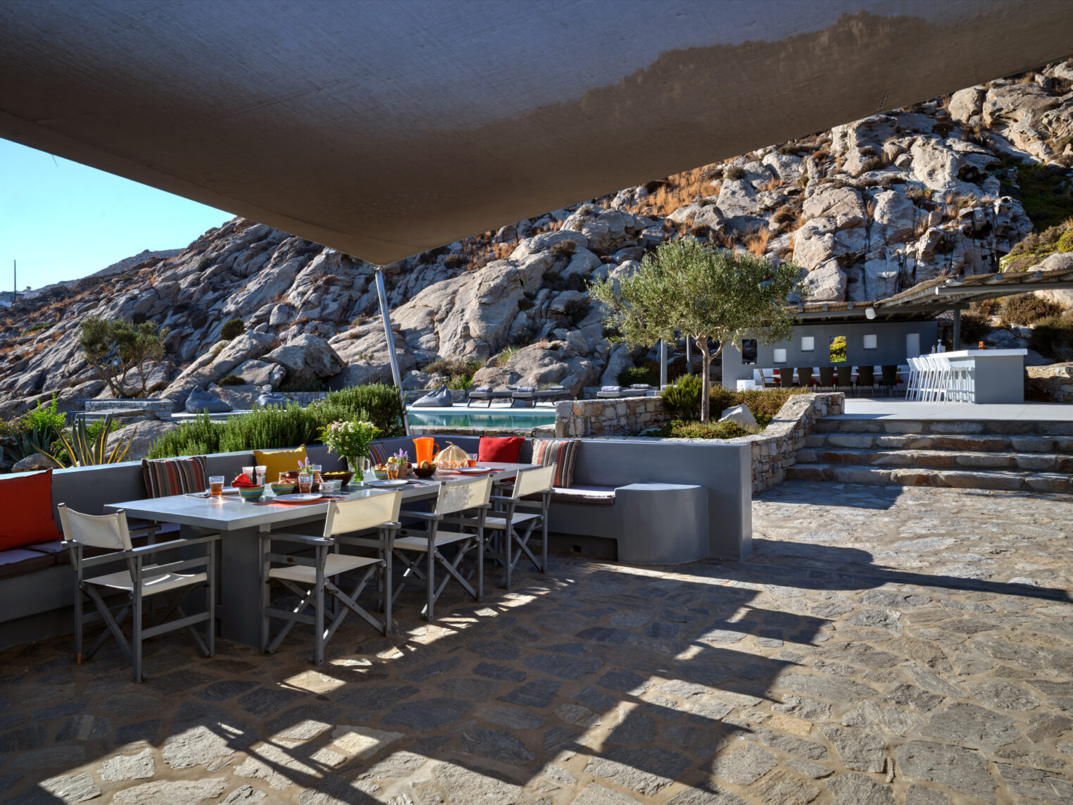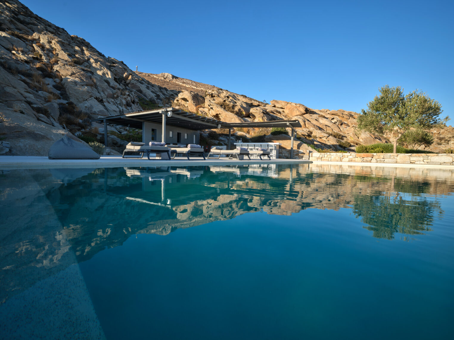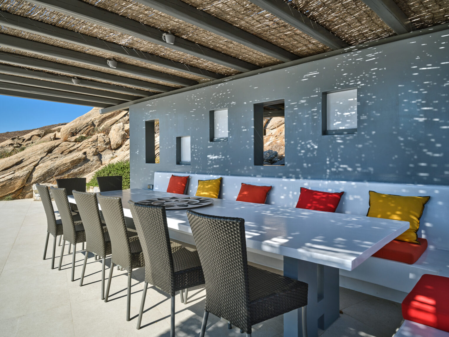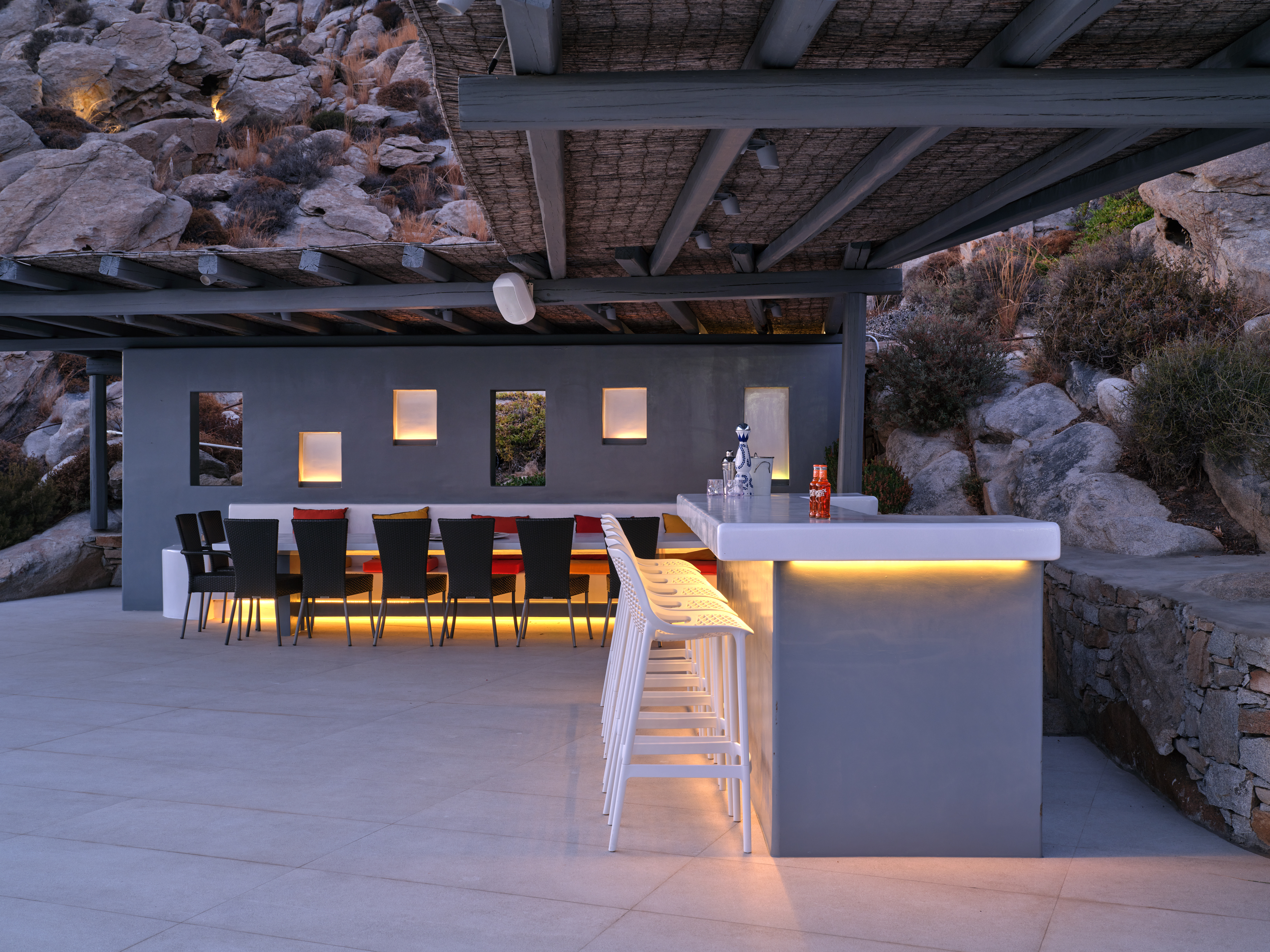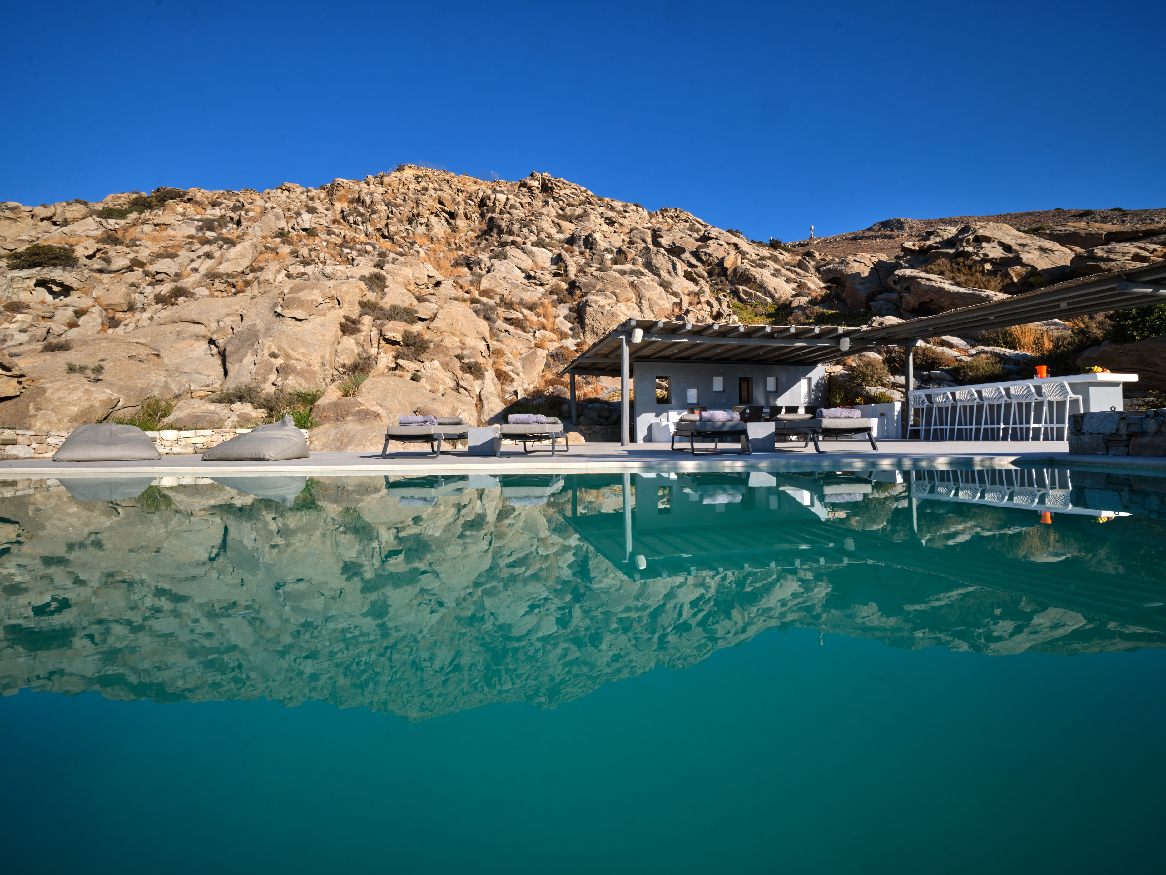 Enjoy stunning rocky surroundings and the infinity pool with outdoor dining areas that can accommodate 14 guests on each side. Relax poolside on ten comfortable chairs, sip drinks at the sixseat bar, and listen to your favorite music. Shaded lounge areas, three outdoor showers, and a BBQ are also available.The house offers ample opportunities to dine. To have and to host, they say. Invite your friends for a quiet evening outside, or hold a formal dinner in the spacious indoor dining room with a reclaimed wooden table.