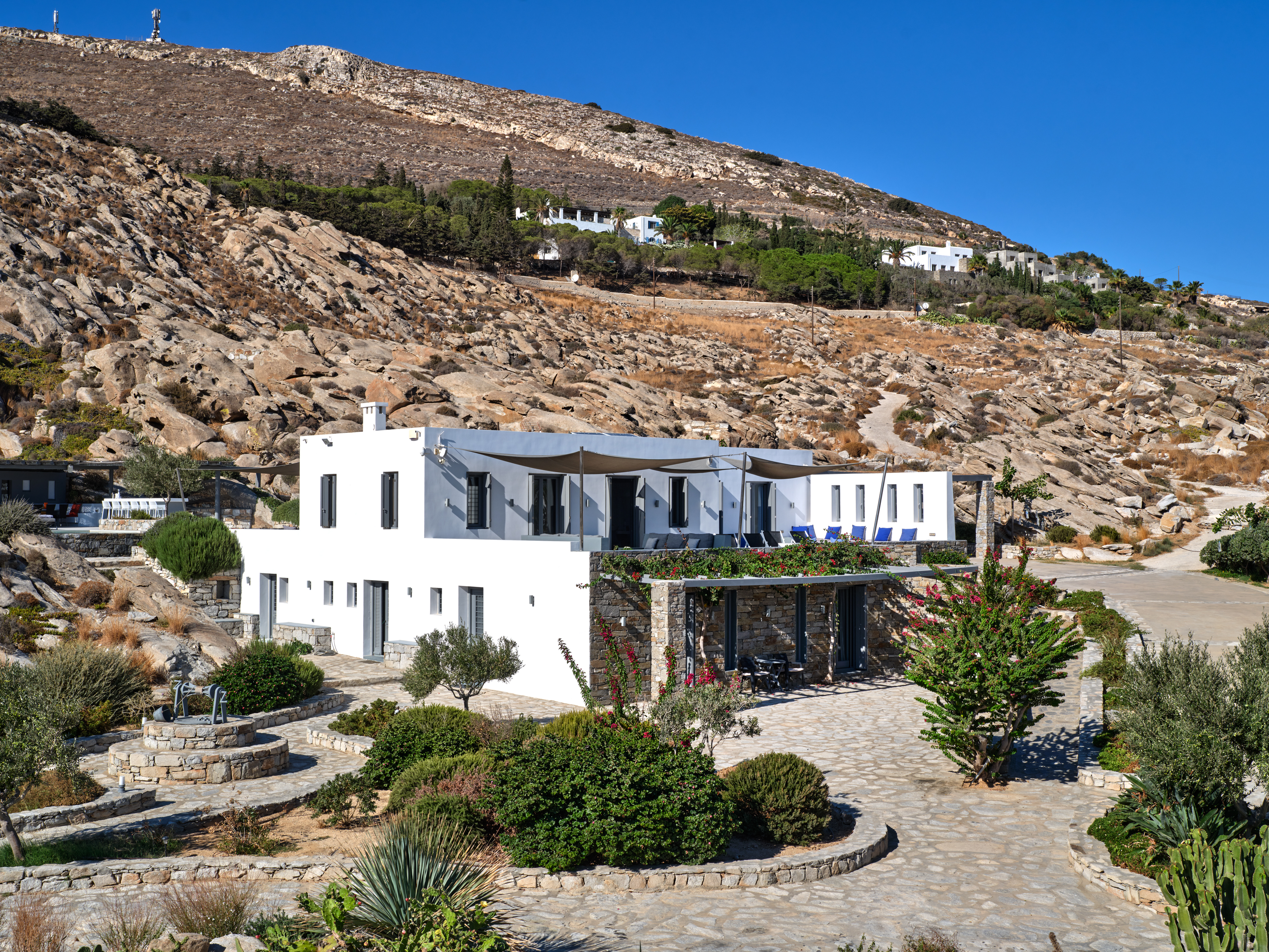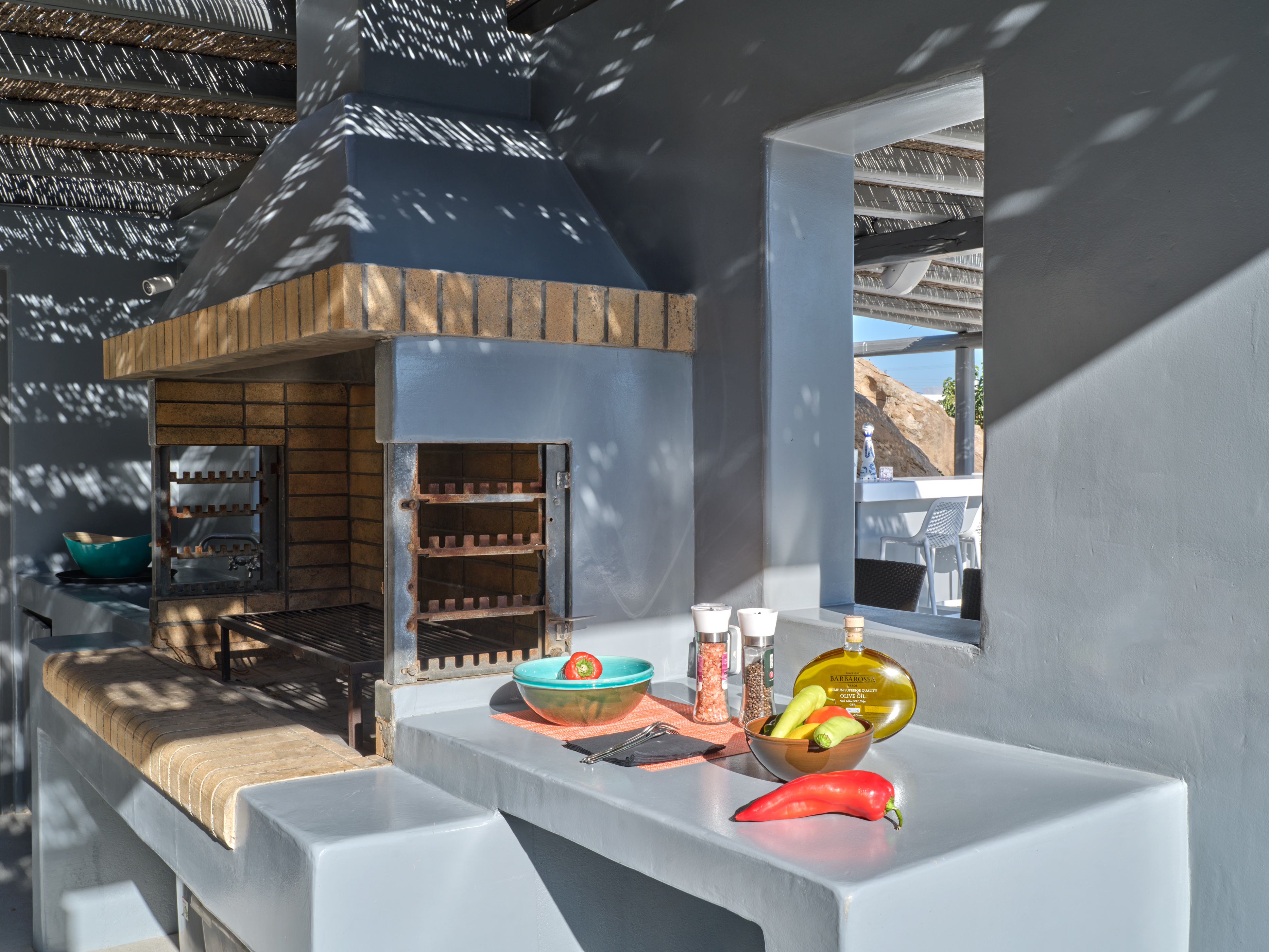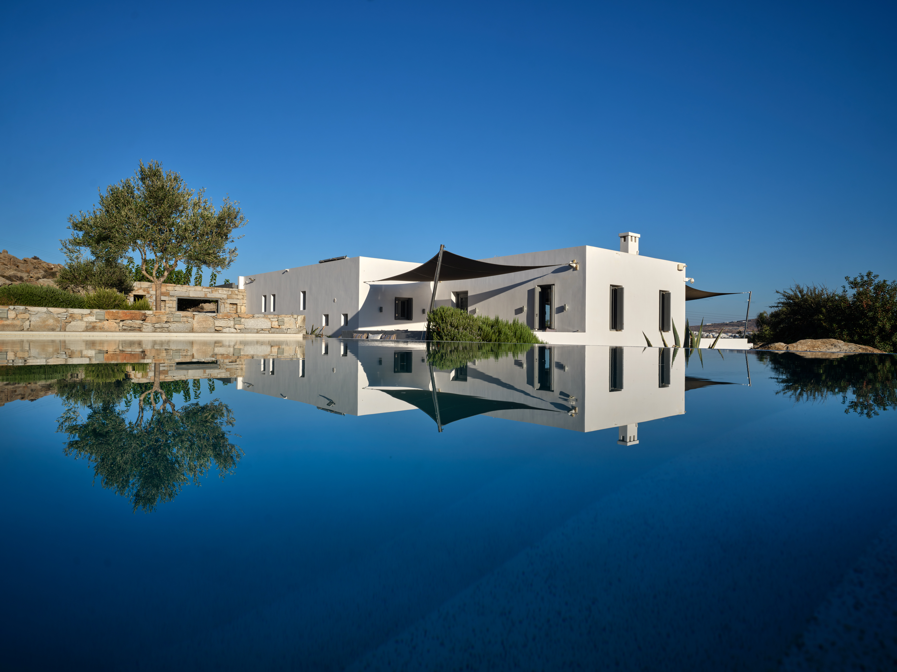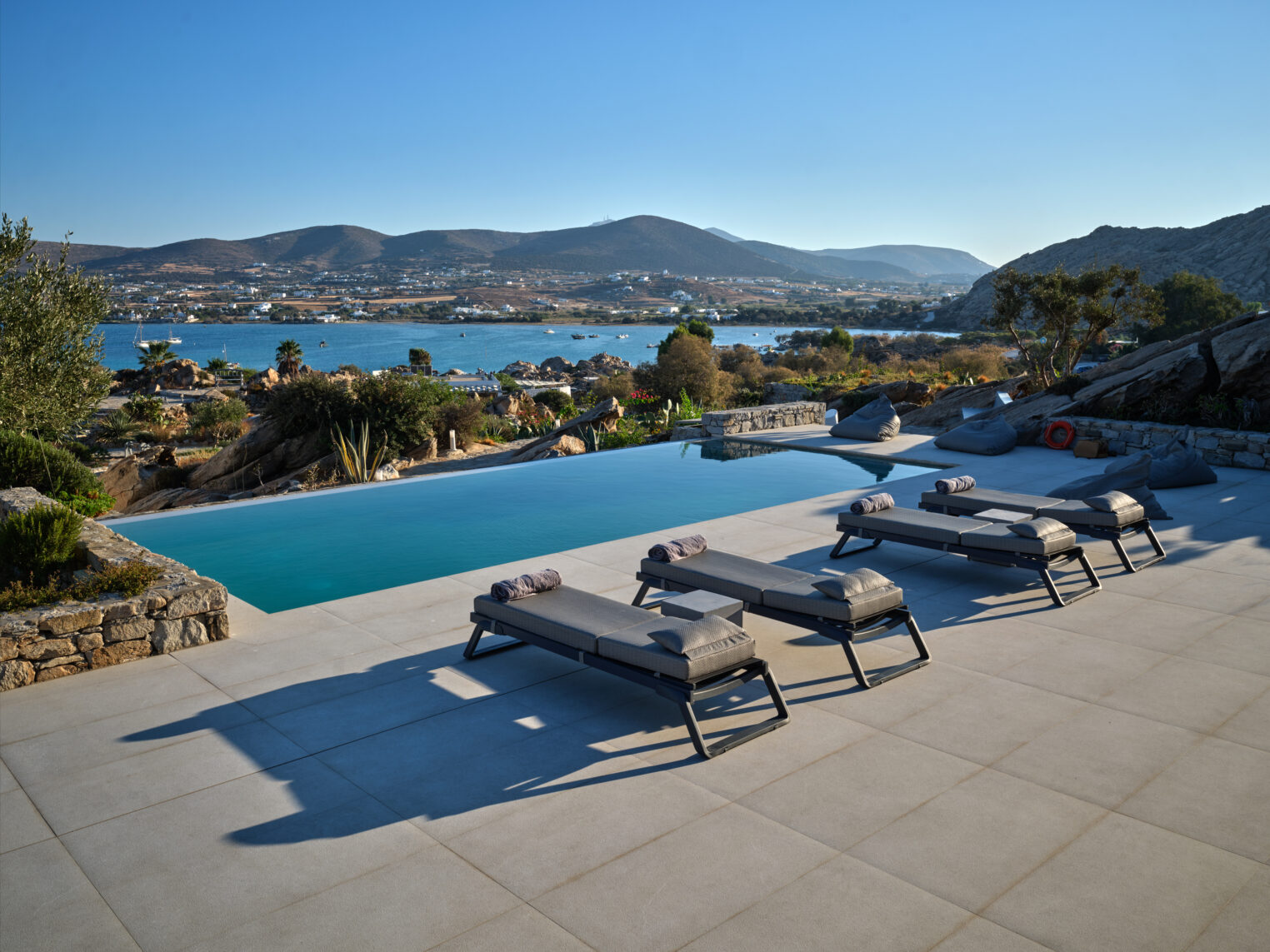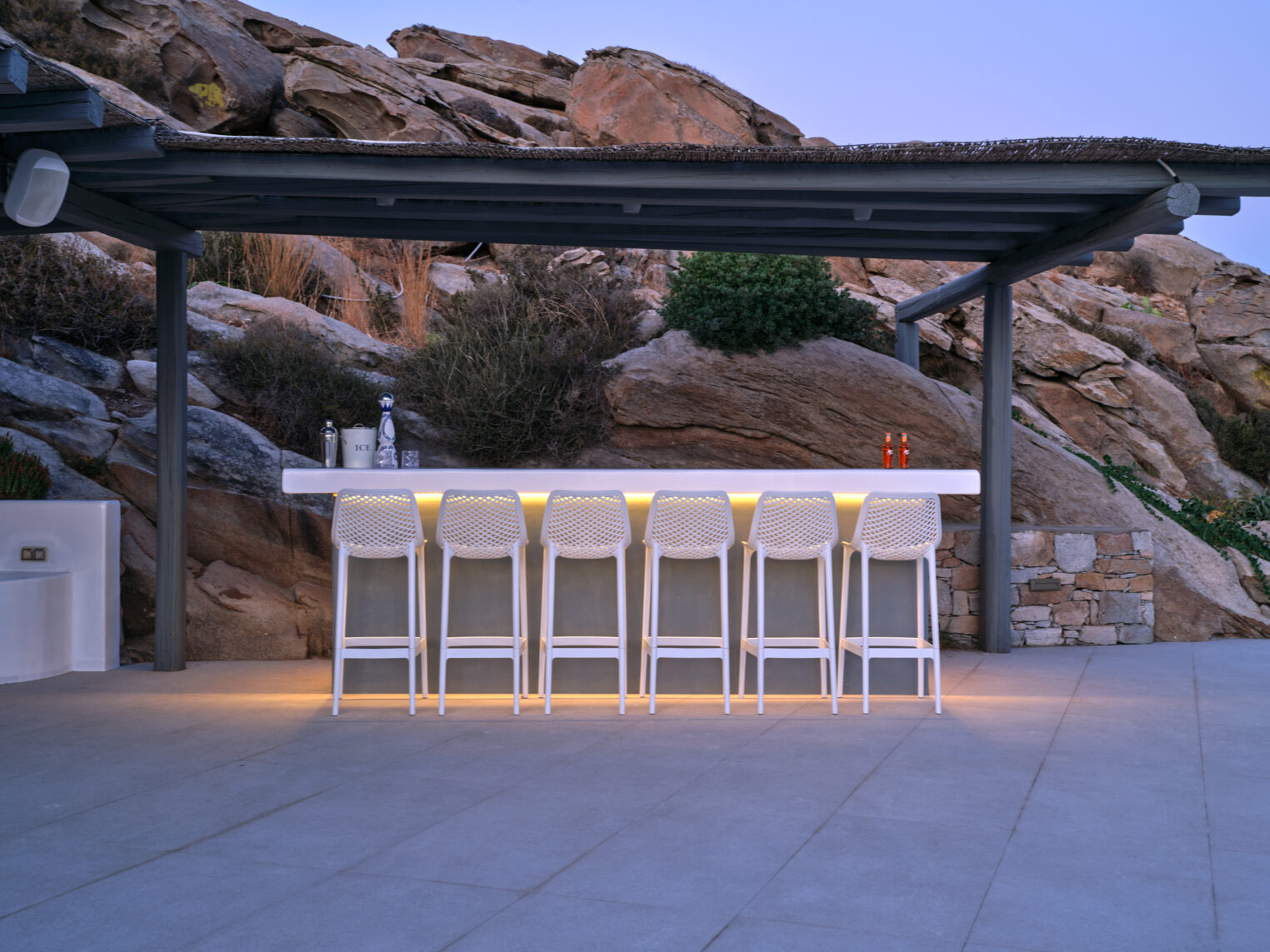 Enjoy stunning rocky surroundings and the infinity pool with outdoor dining areas that can accommodate 14 guests on each side. Relax poolside on ten comfortable chairs, sip drinks at the sixseat bar, and listen to your favorite music. Shaded lounge areas, three outdoor showers, and a BBQ are also available.The house offers ample opportunities to dine. To have and to host, they say. Invite your friends for a quiet evening outside, or hold a formal dinner in the spacious indoor dining room with a reclaimed wooden table.