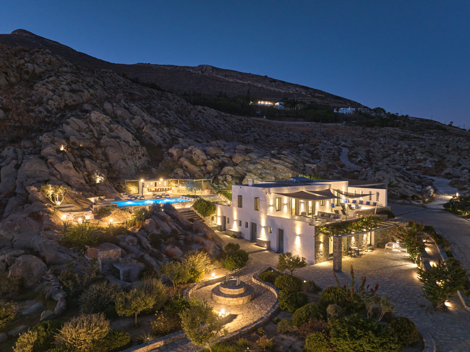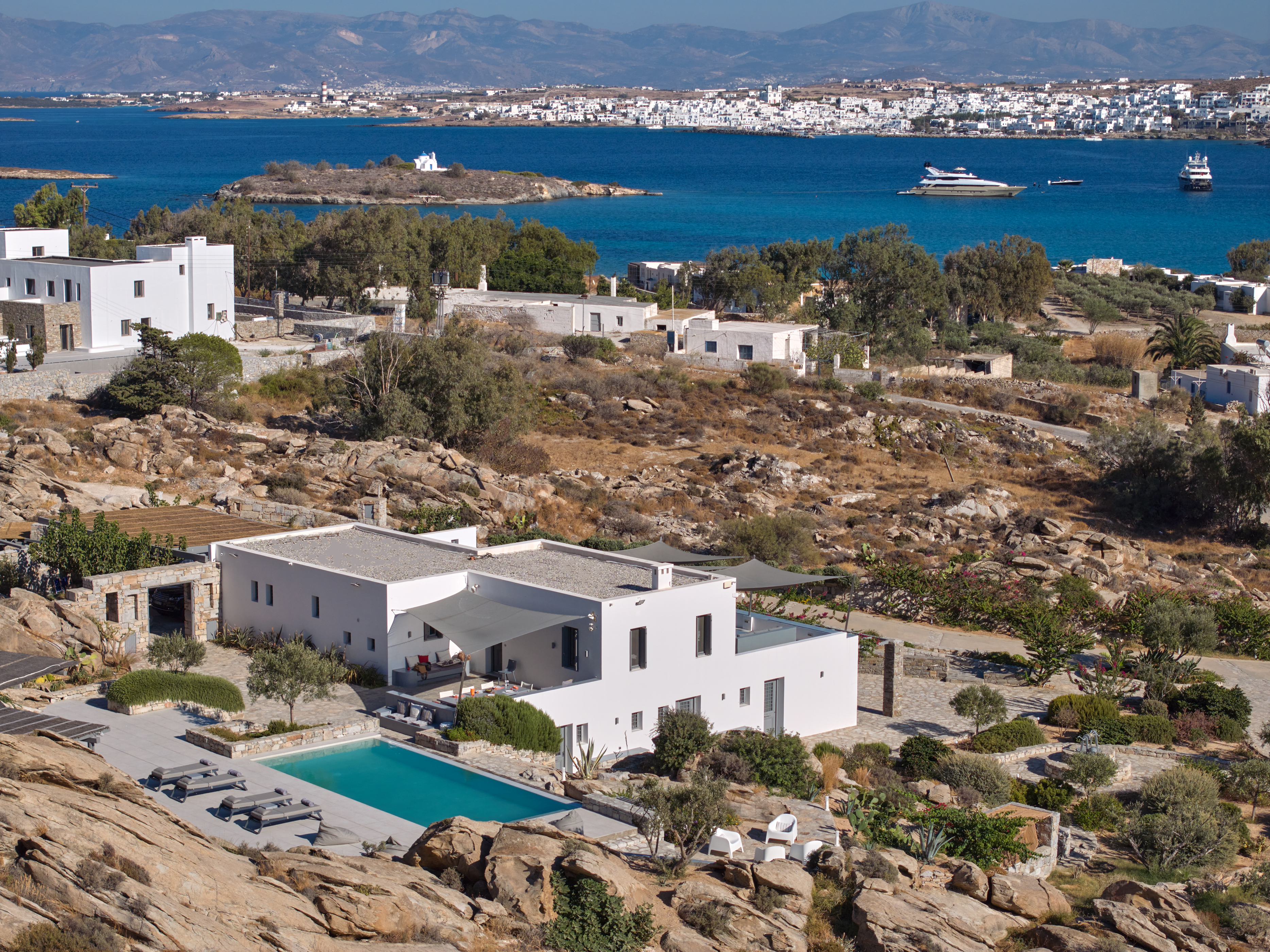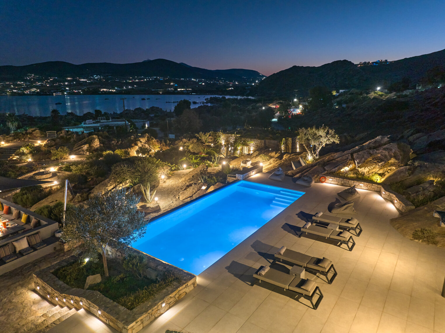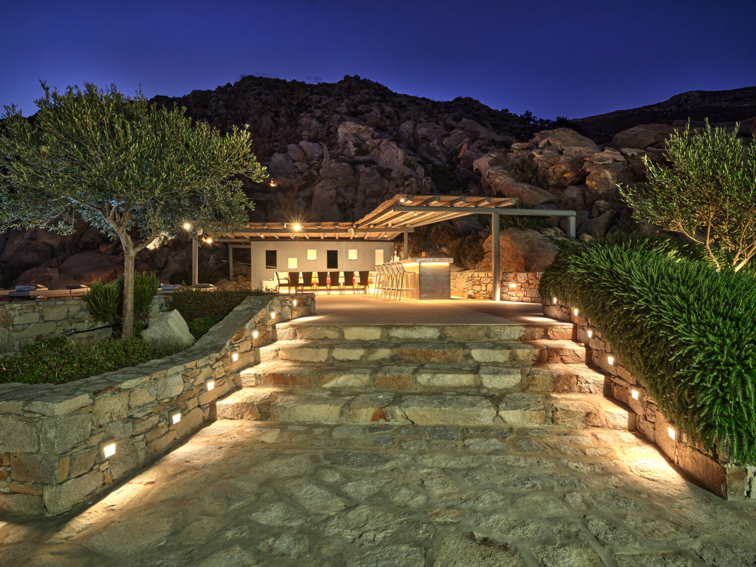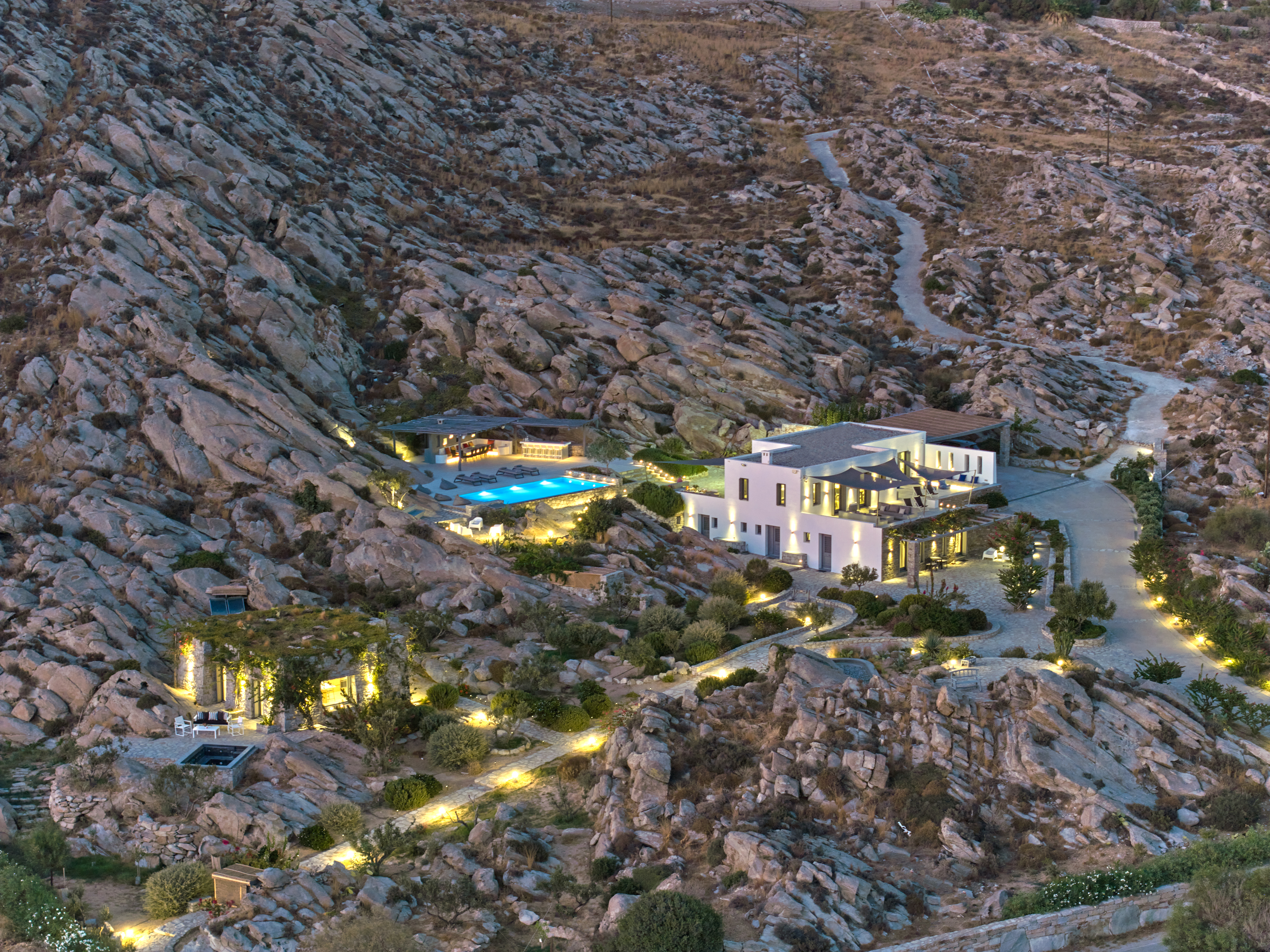 Enjoy stunning rocky surroundings and the infinity pool with outdoor dining areas that can accommodate 14 guests on each side. Relax poolside on ten comfortable chairs, sip drinks at the sixseat bar, and listen to your favorite music. Shaded lounge areas, three outdoor showers, and a BBQ are also available.The house offers ample opportunities to dine. To have and to host, they say. Invite your friends for a quiet evening outside, or hold a formal dinner in the spacious indoor dining room with a reclaimed wooden table.