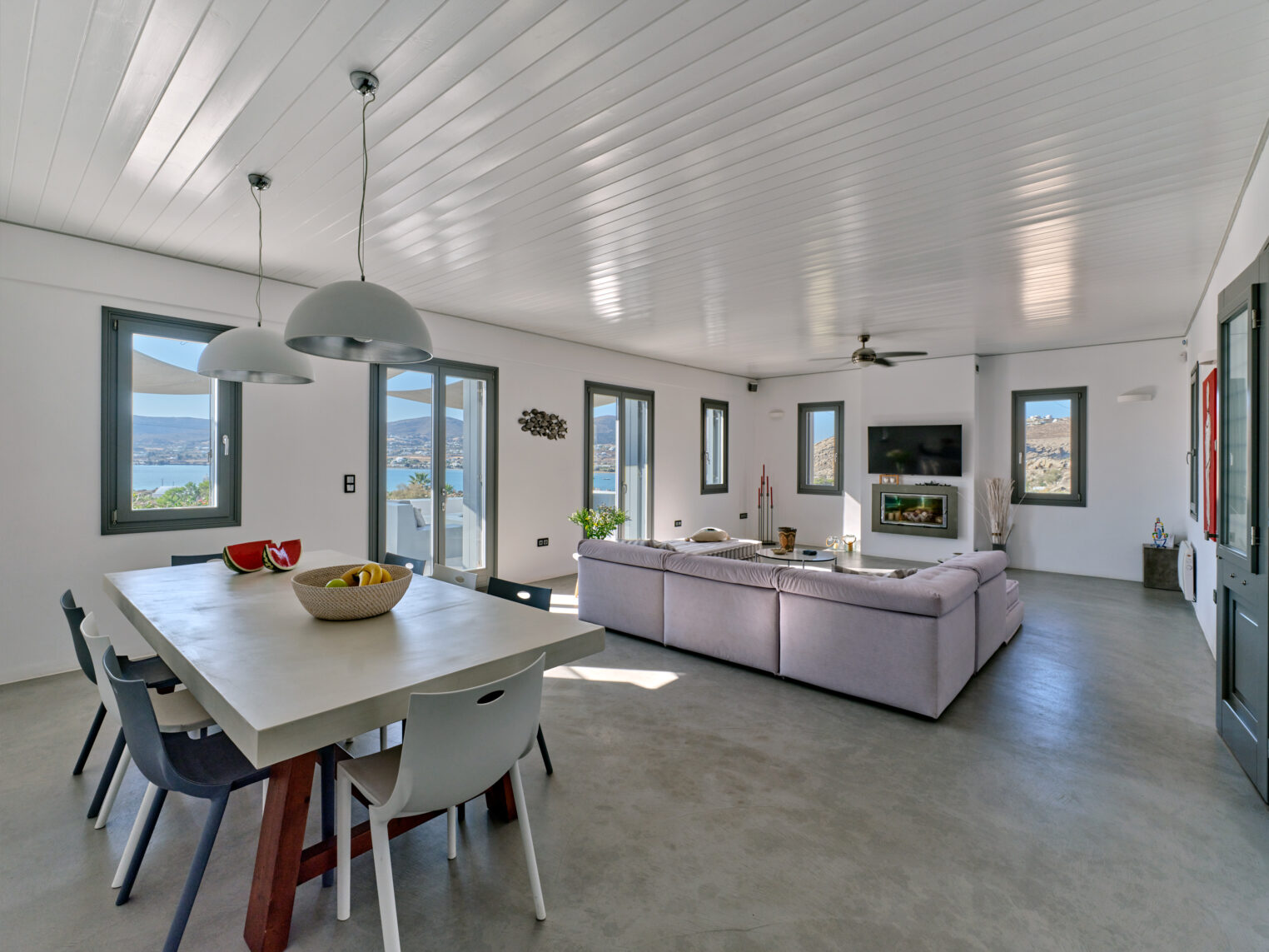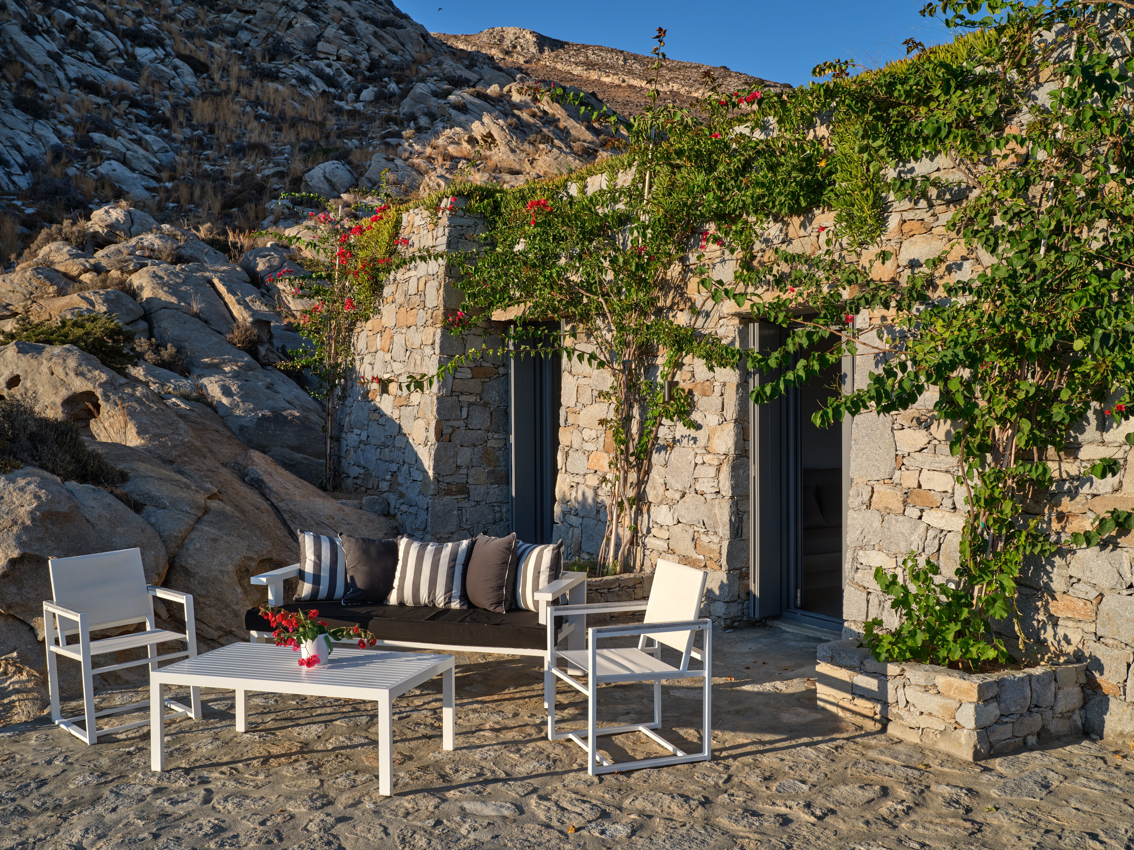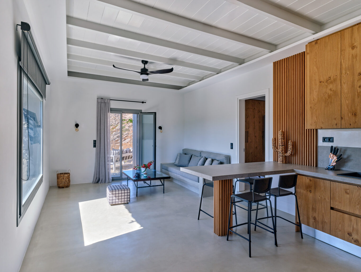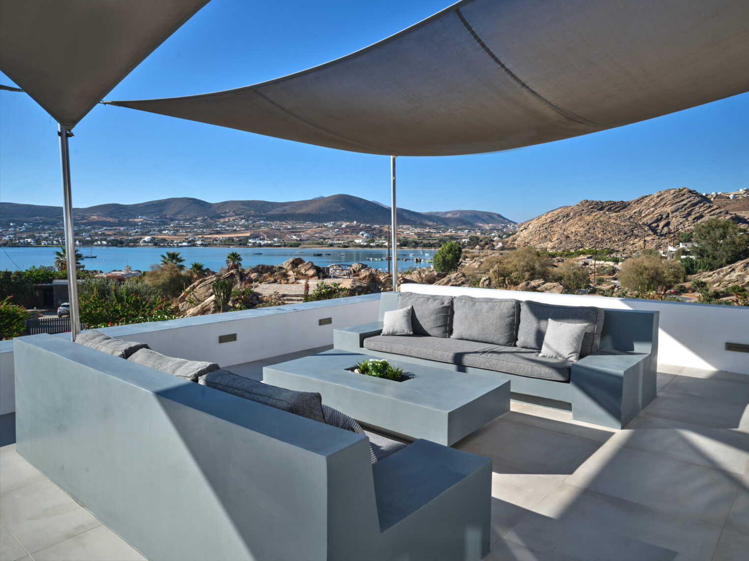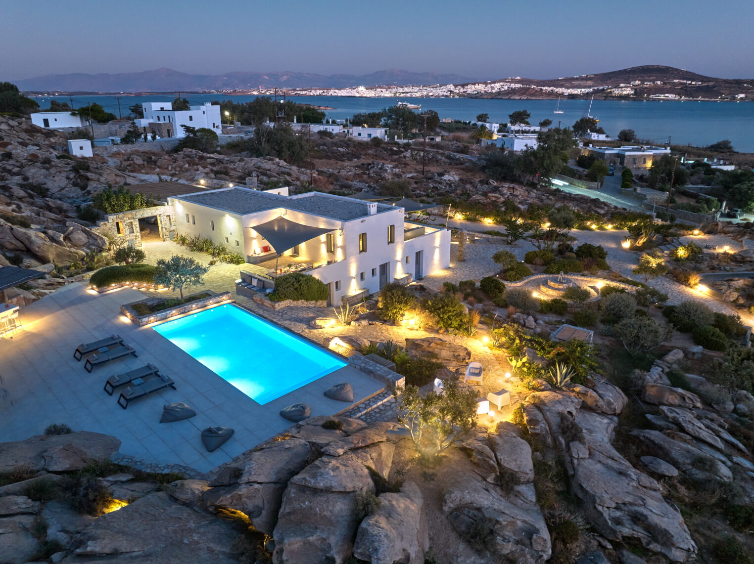Enjoy stunning rocky surroundings and the infinity pool with outdoor dining areas that can accommodate 14 guests on each side. Relax poolside on ten comfortable chairs, sip drinks at the sixseat bar, and listen to your favorite music. Shaded lounge areas, three outdoor showers, and a BBQ are also available.The house offers ample opportunities to dine. To have and to host, they say. Invite your friends for a quiet evening outside, or hold a formal dinner in the spacious indoor dining room with a reclaimed wooden table.