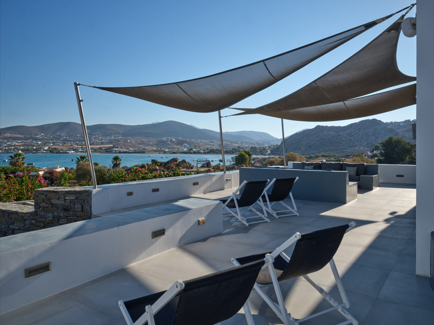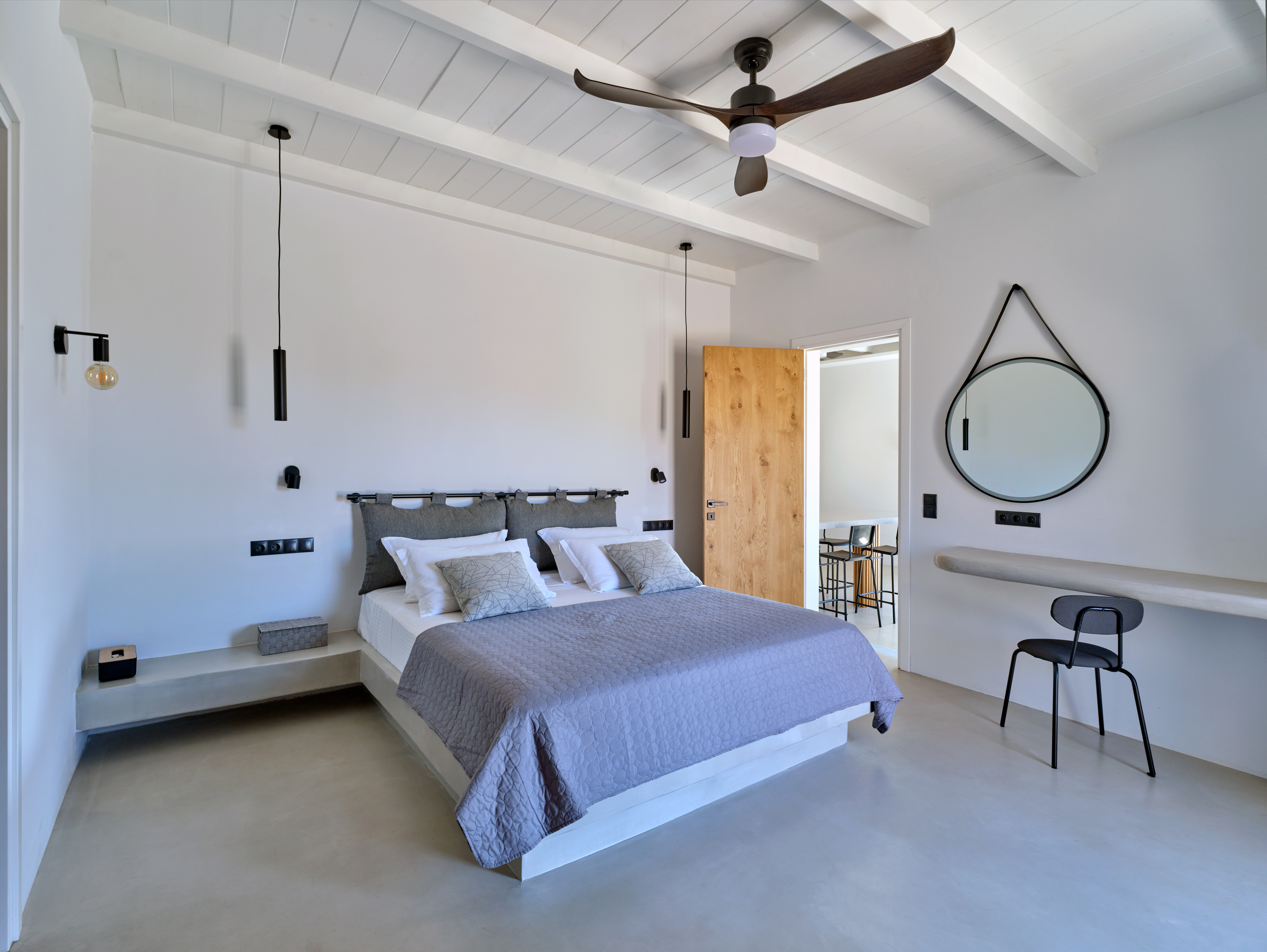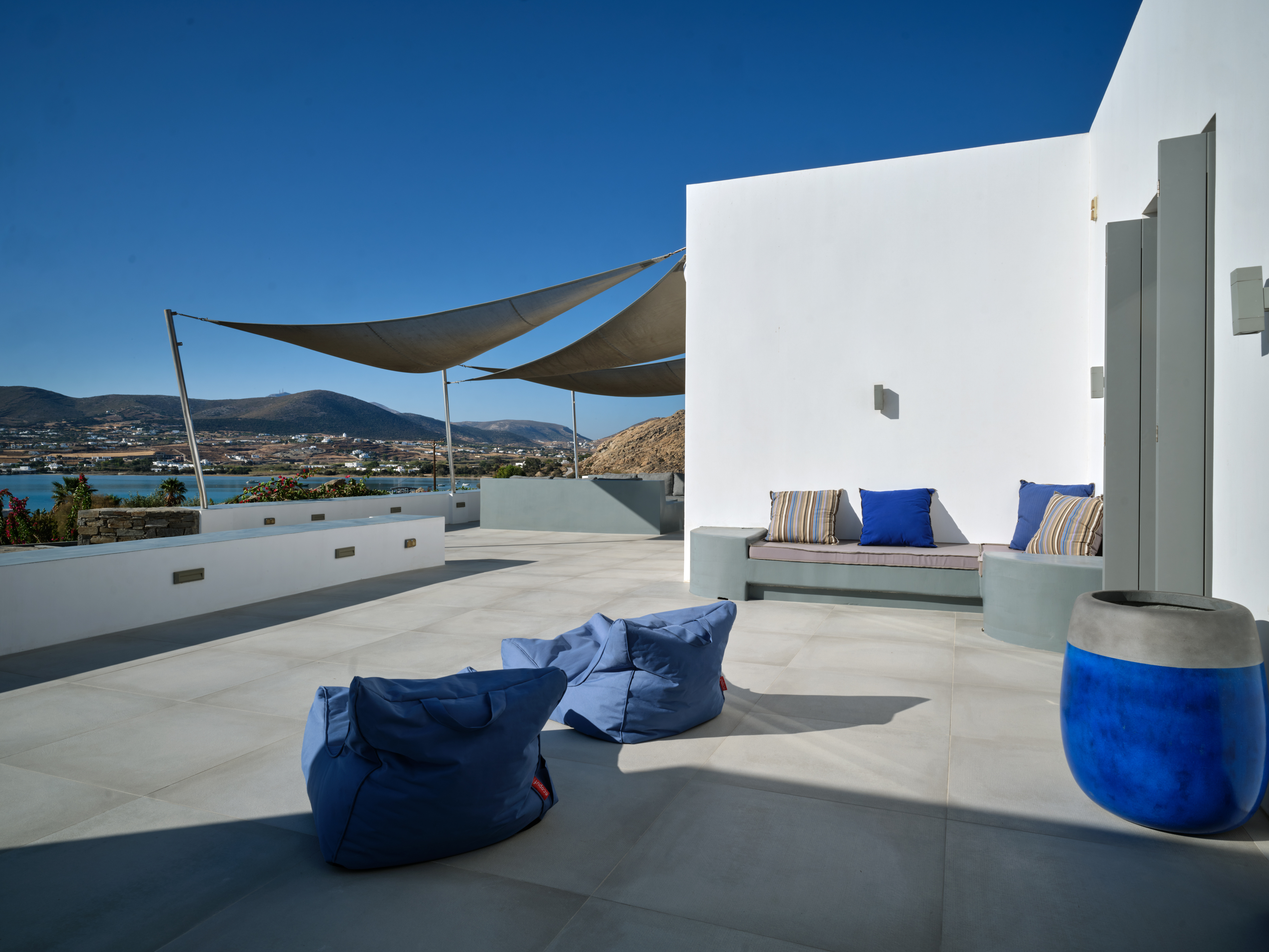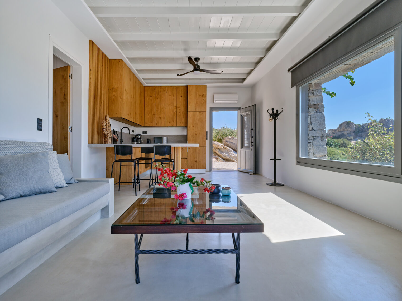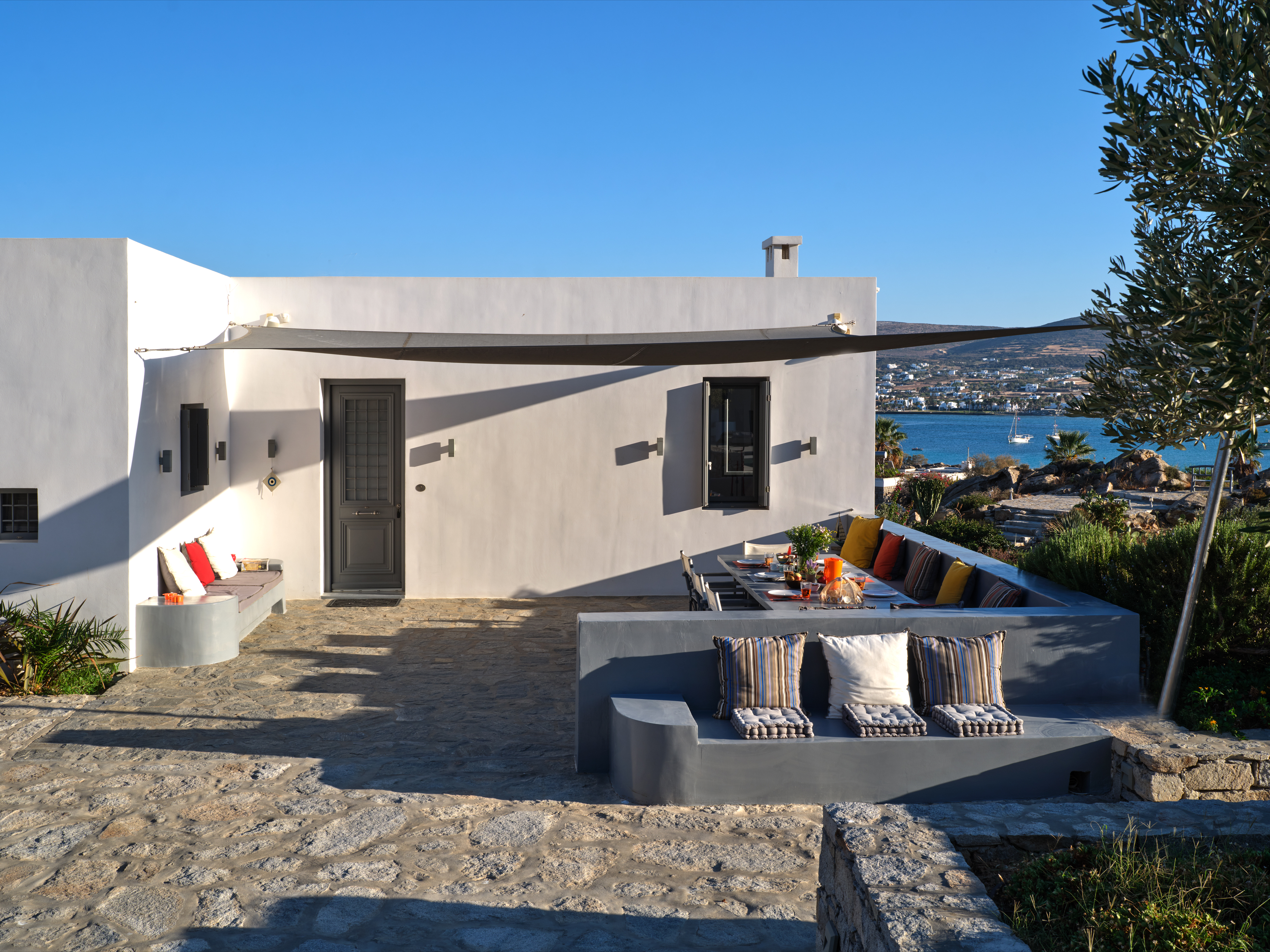 Enjoy stunning rocky surroundings and the infinity pool with outdoor dining areas that can accommodate 14 guests on each side. Relax poolside on ten comfortable chairs, sip drinks at the sixseat bar, and listen to your favorite music. Shaded lounge areas, three outdoor showers, and a BBQ are also available.The house offers ample opportunities to dine. To have and to host, they say. Invite your friends for a quiet evening outside, or hold a formal dinner in the spacious indoor dining room with a reclaimed wooden table.