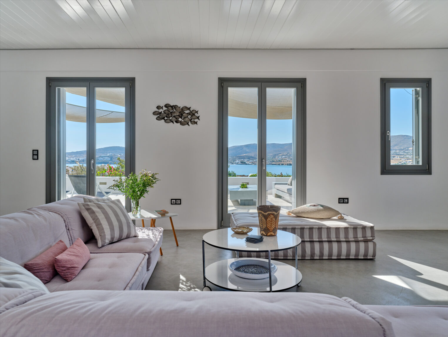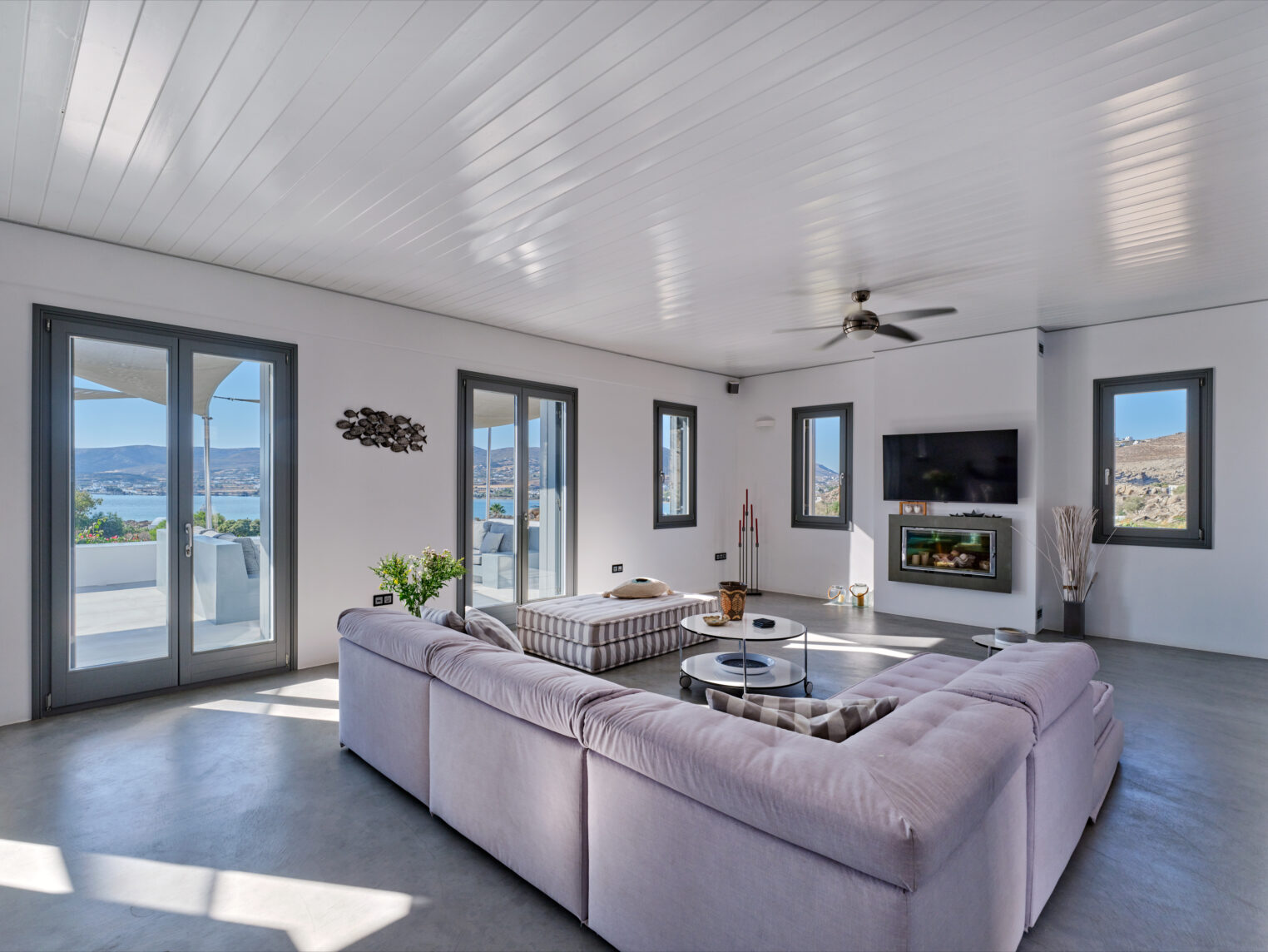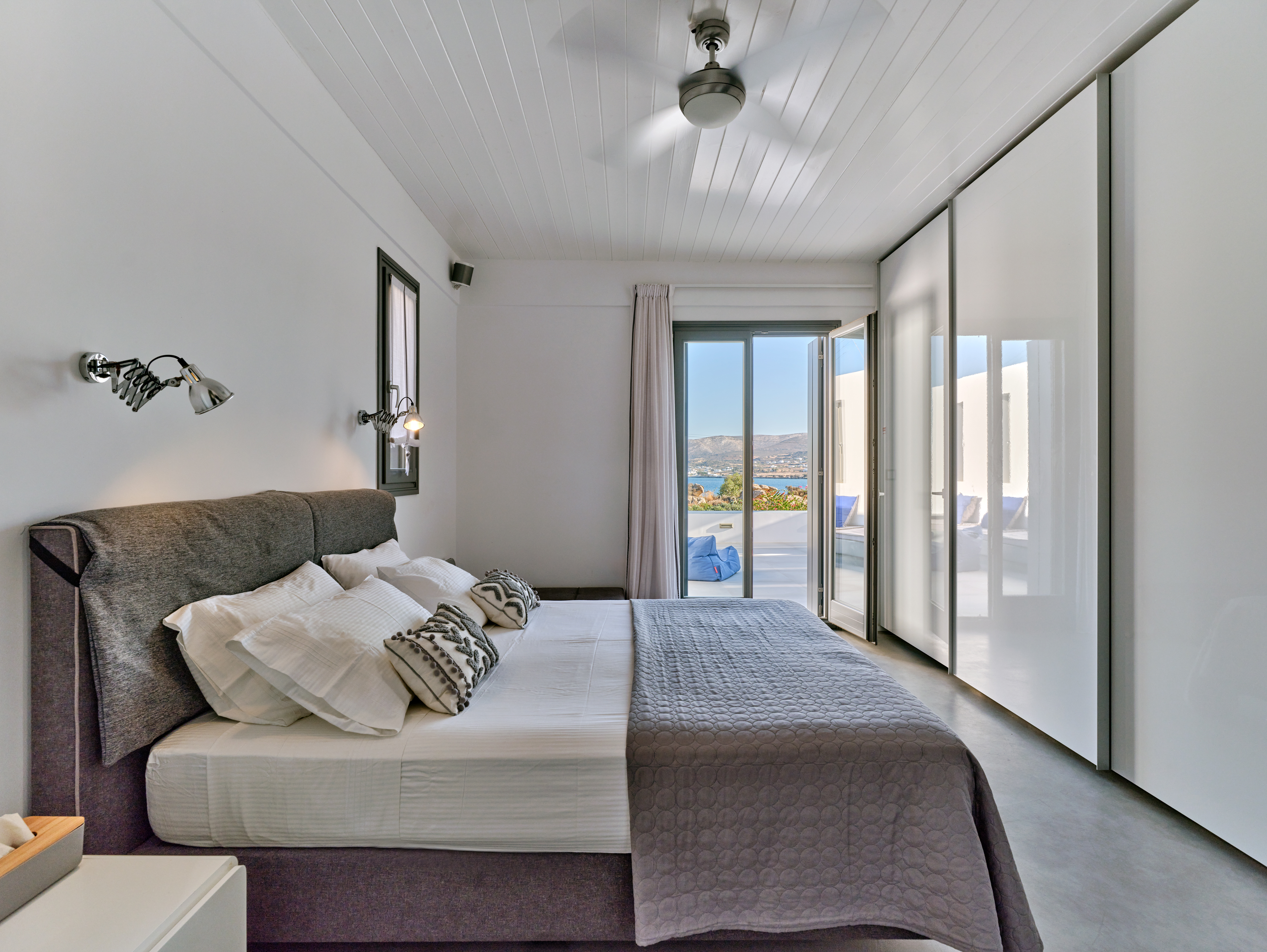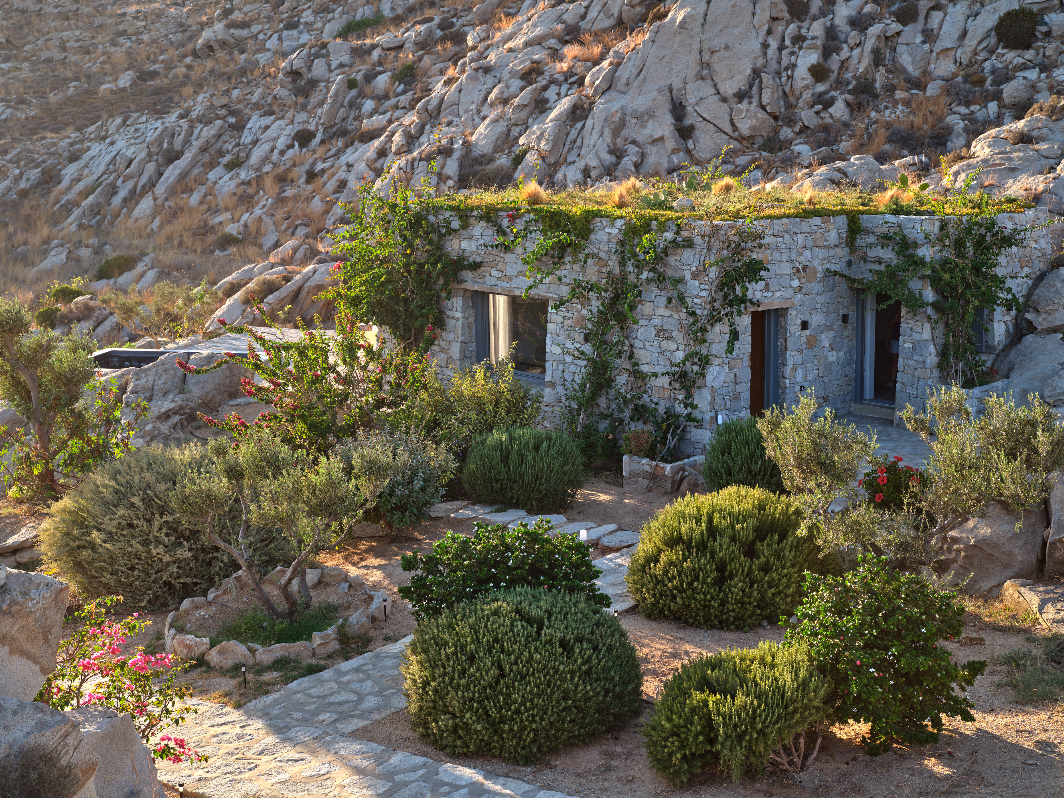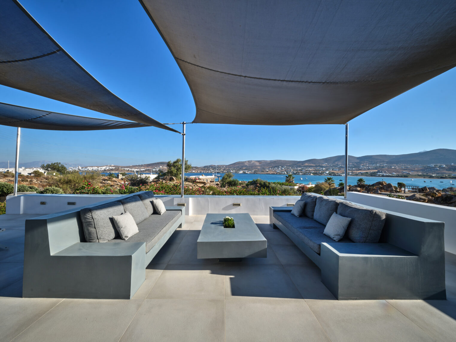 Enjoy stunning rocky surroundings and the infinity pool with outdoor dining areas that can accommodate 14 guests on each side. Relax poolside on ten comfortable chairs, sip drinks at the sixseat bar, and listen to your favorite music. Shaded lounge areas, three outdoor showers, and a BBQ are also available.The house offers ample opportunities to dine. To have and to host, they say. Invite your friends for a quiet evening outside, or hold a formal dinner in the spacious indoor dining room with a reclaimed wooden table.