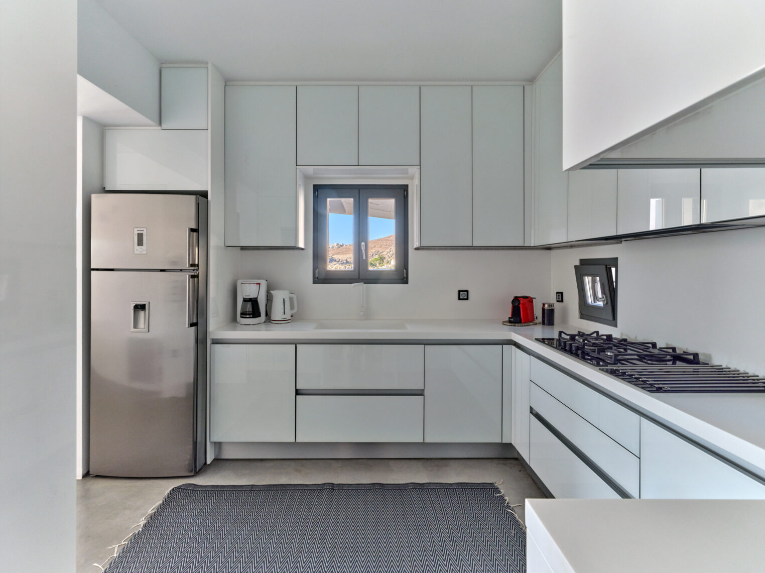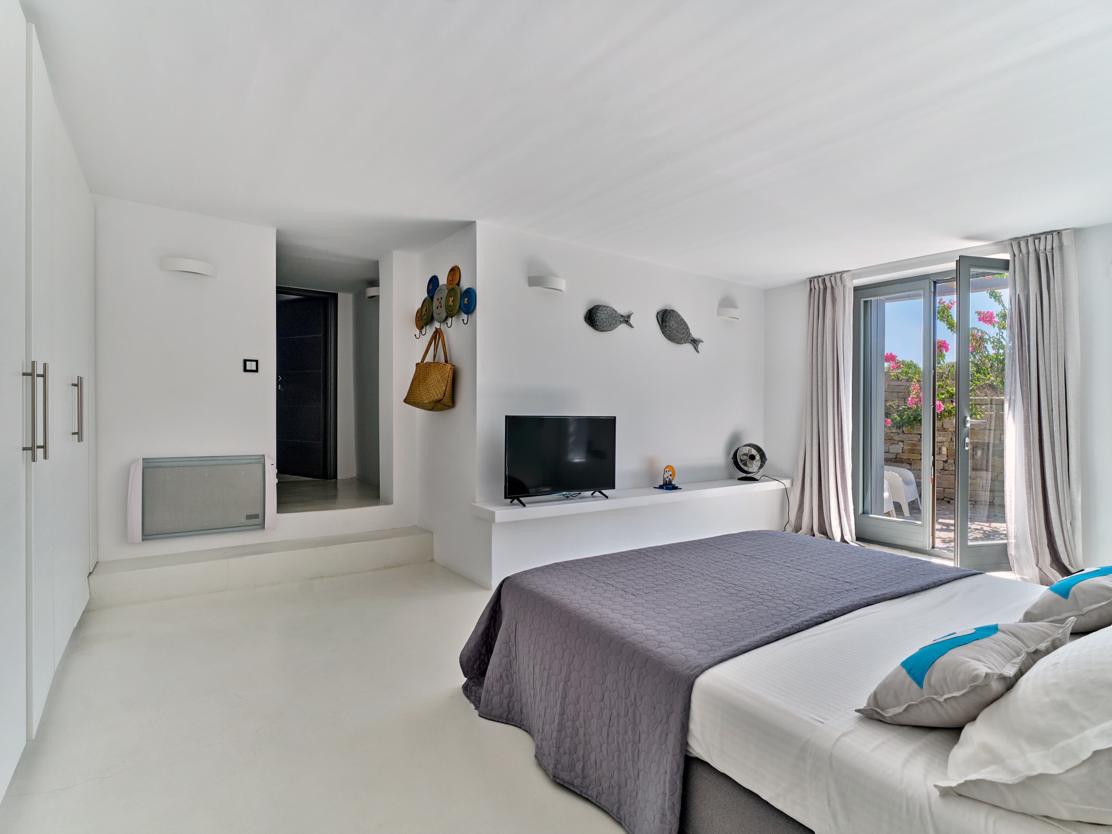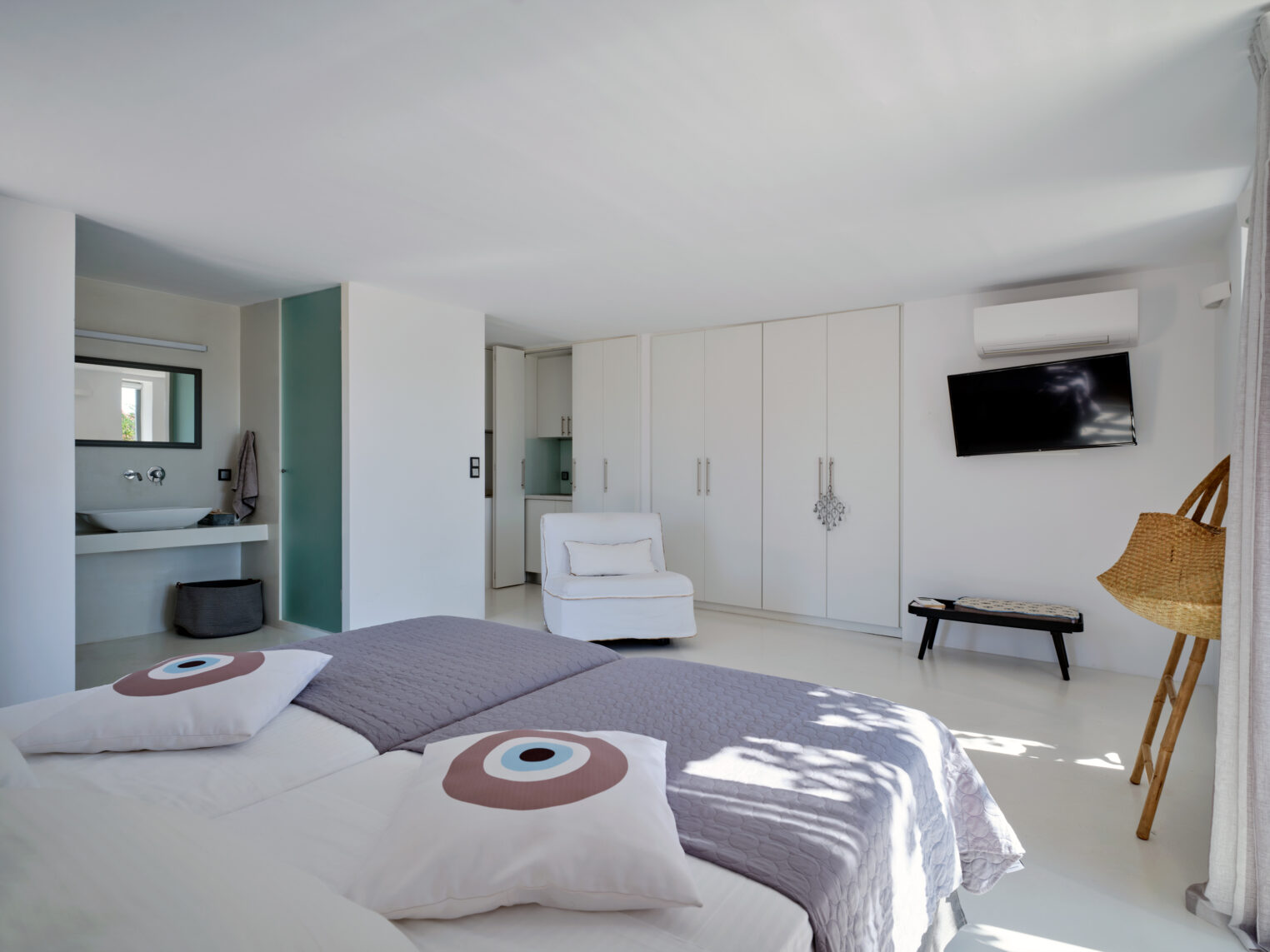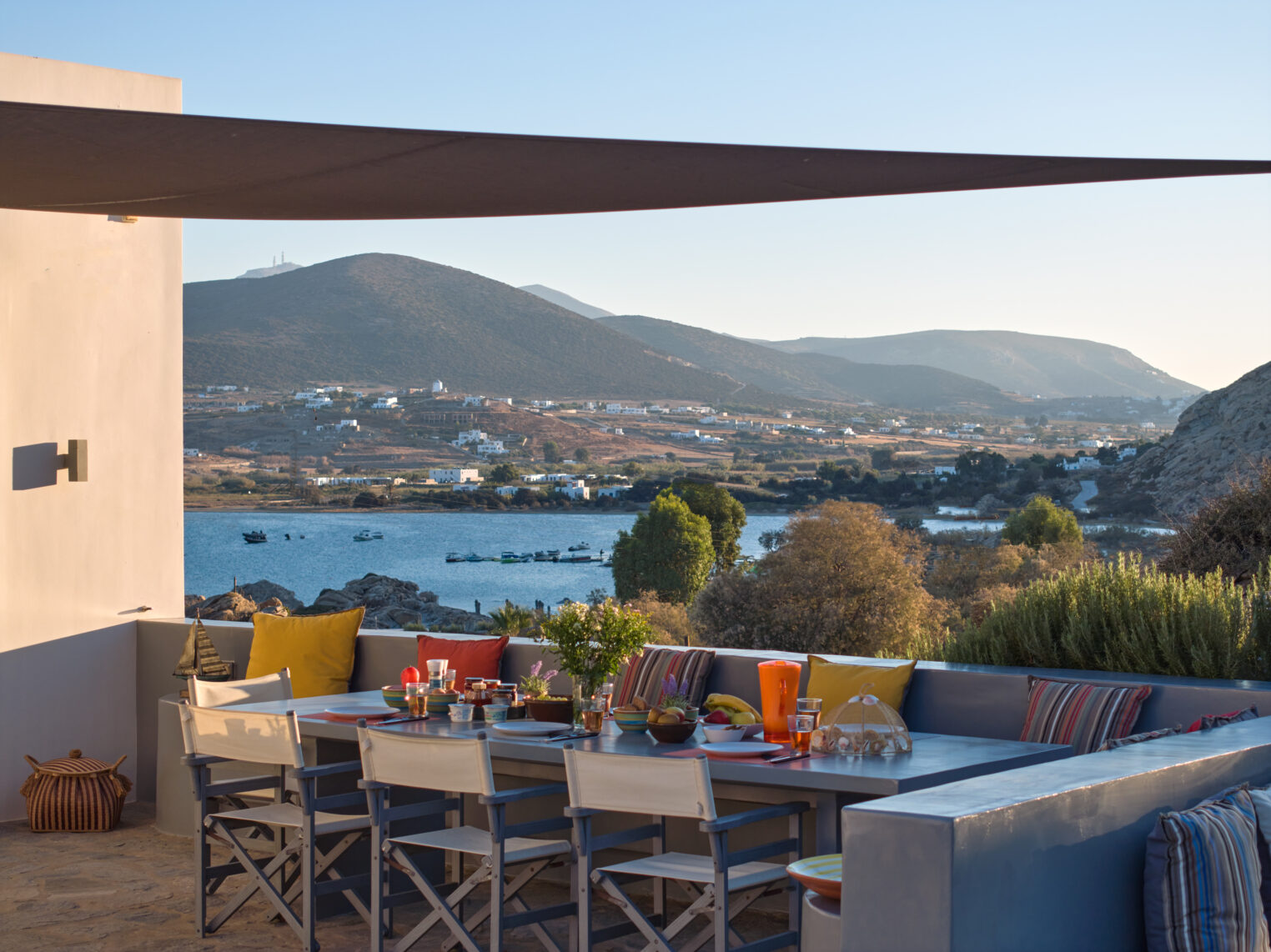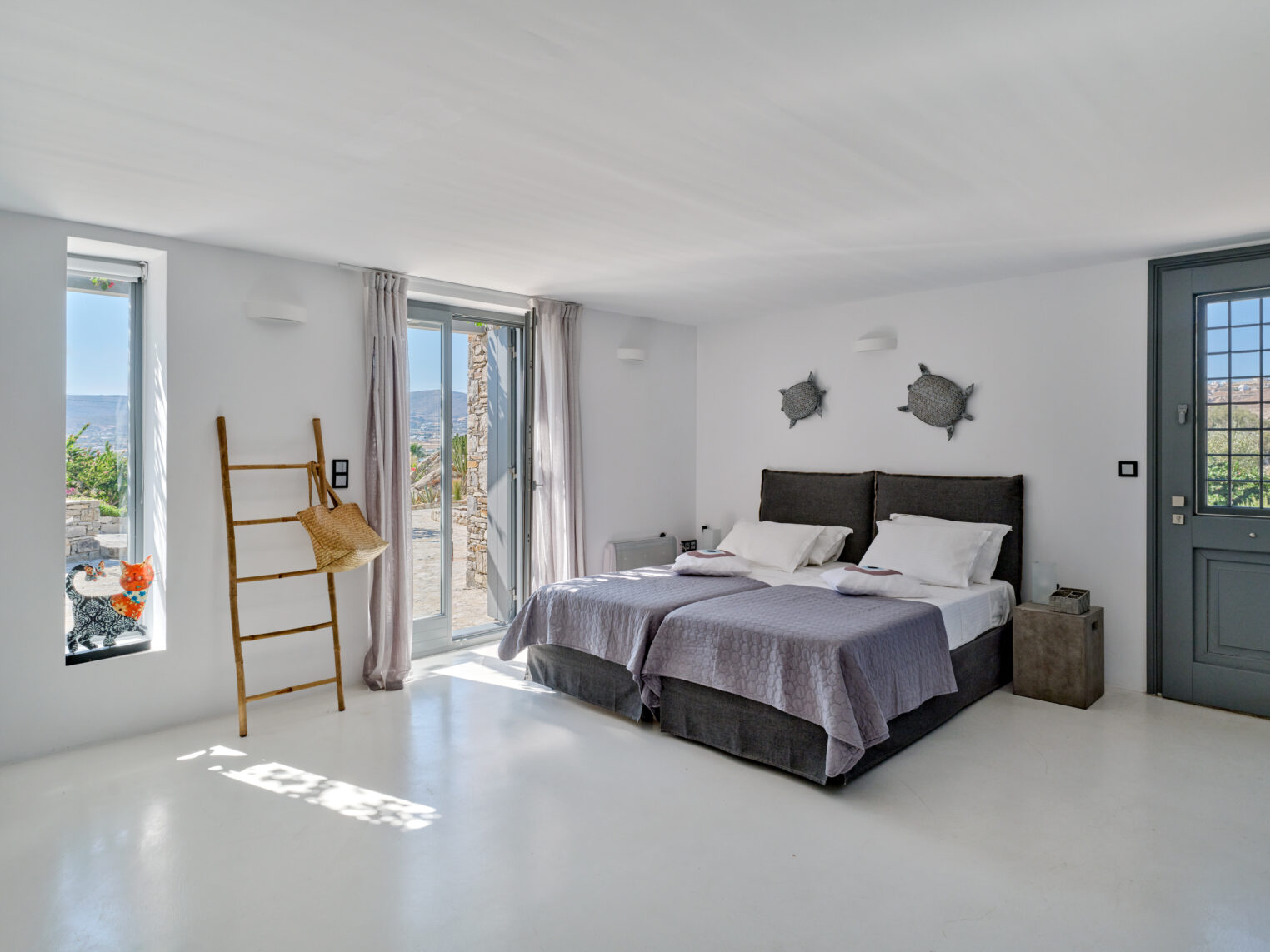 Enjoy stunning rocky surroundings and the infinity pool with outdoor dining areas that can accommodate 14 guests on each side. Relax poolside on ten comfortable chairs, sip drinks at the sixseat bar, and listen to your favorite music. Shaded lounge areas, three outdoor showers, and a BBQ are also available.The house offers ample opportunities to dine. To have and to host, they say. Invite your friends for a quiet evening outside, or hold a formal dinner in the spacious indoor dining room with a reclaimed wooden table.