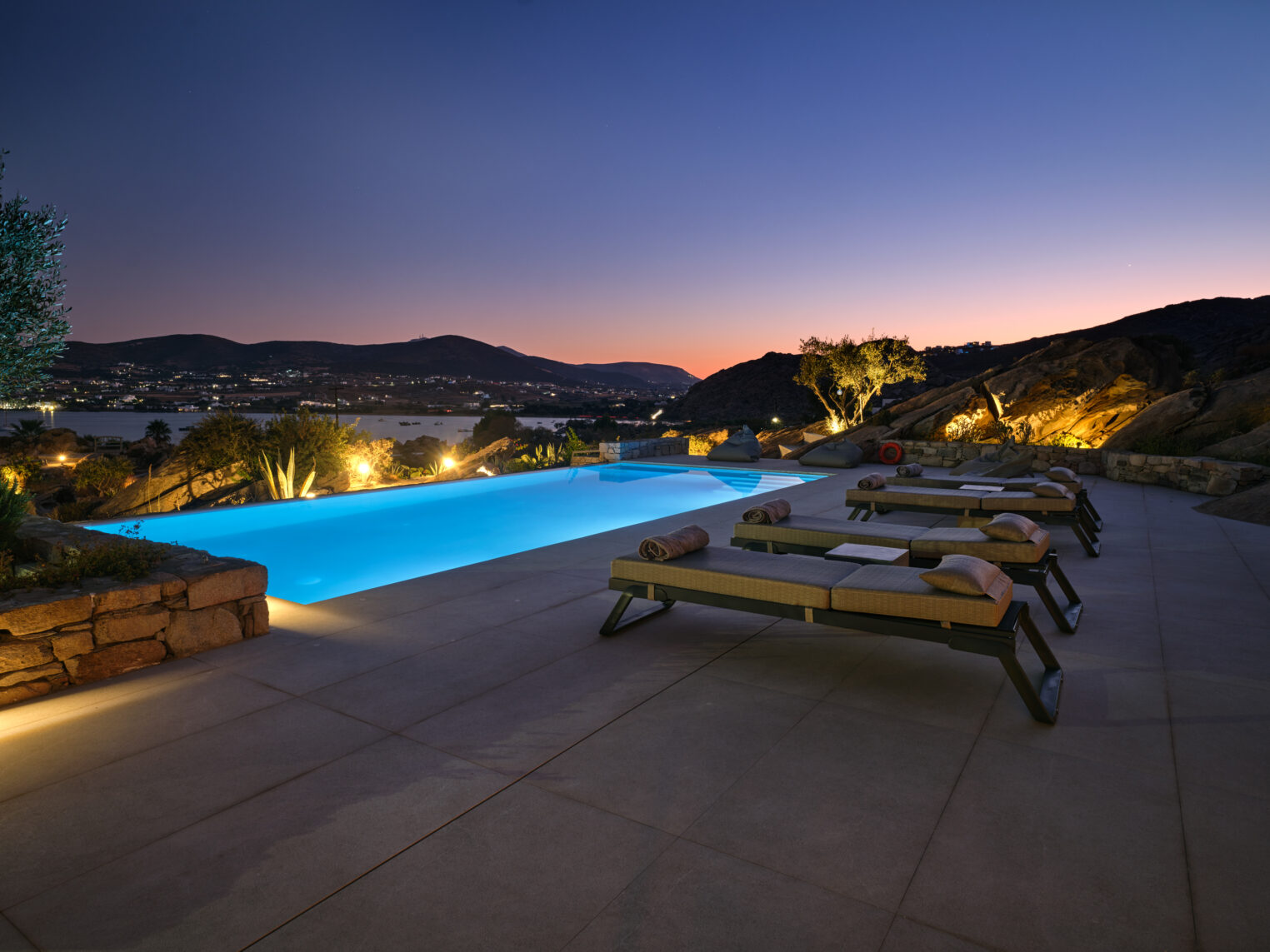 Enjoy stunning rocky surroundings and the infinity pool with outdoor dining areas that can accommodate 14 guests on each side. Relax poolside on ten comfortable chairs, sip drinks at the sixseat bar, and listen to your favorite music (...)
