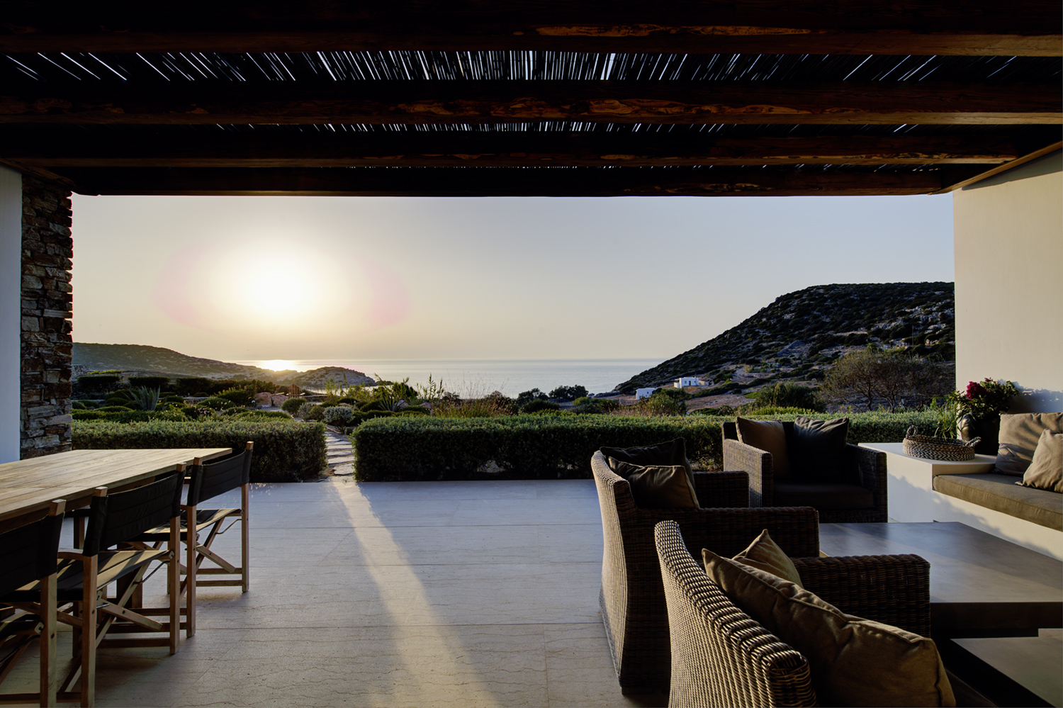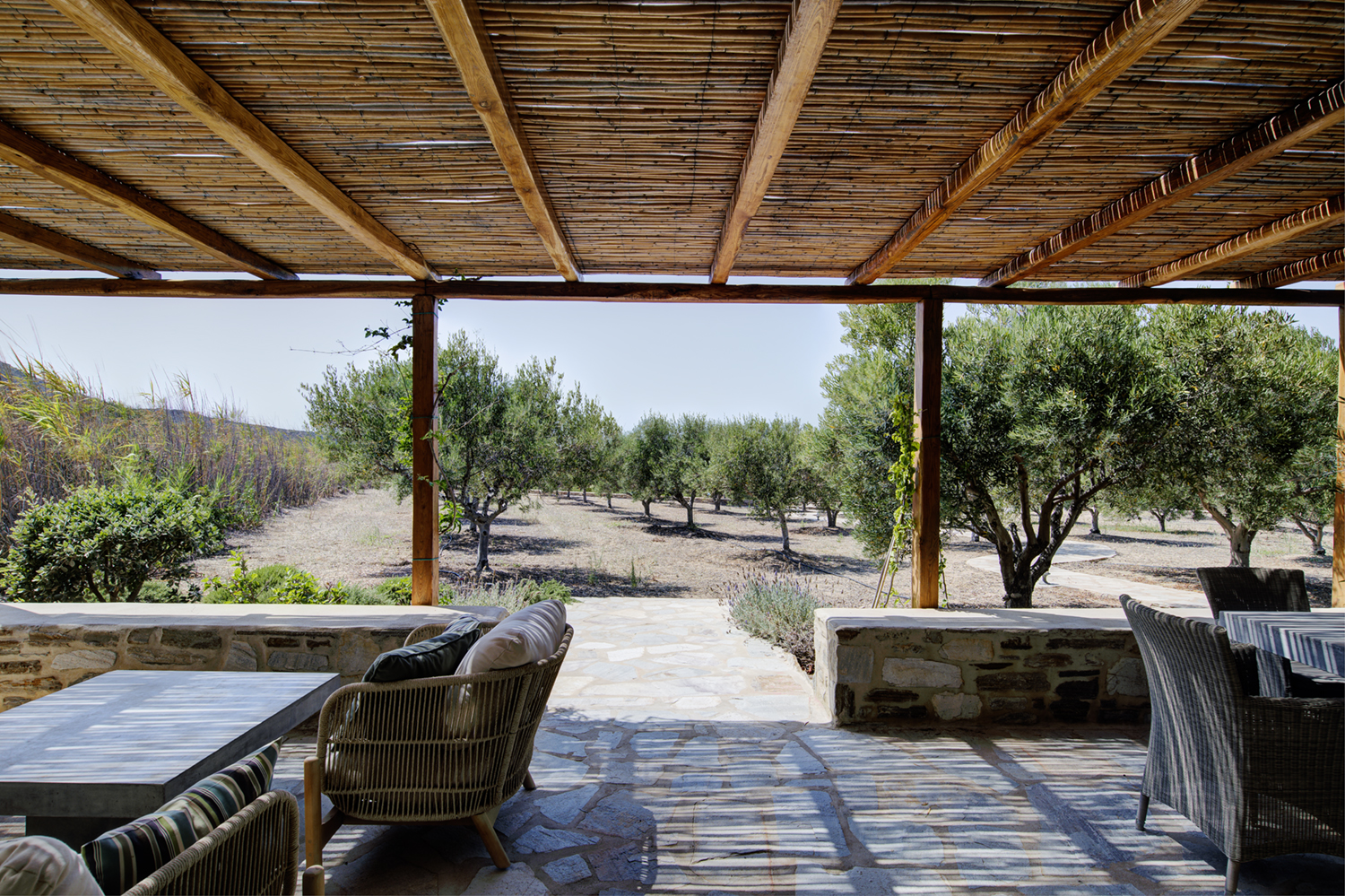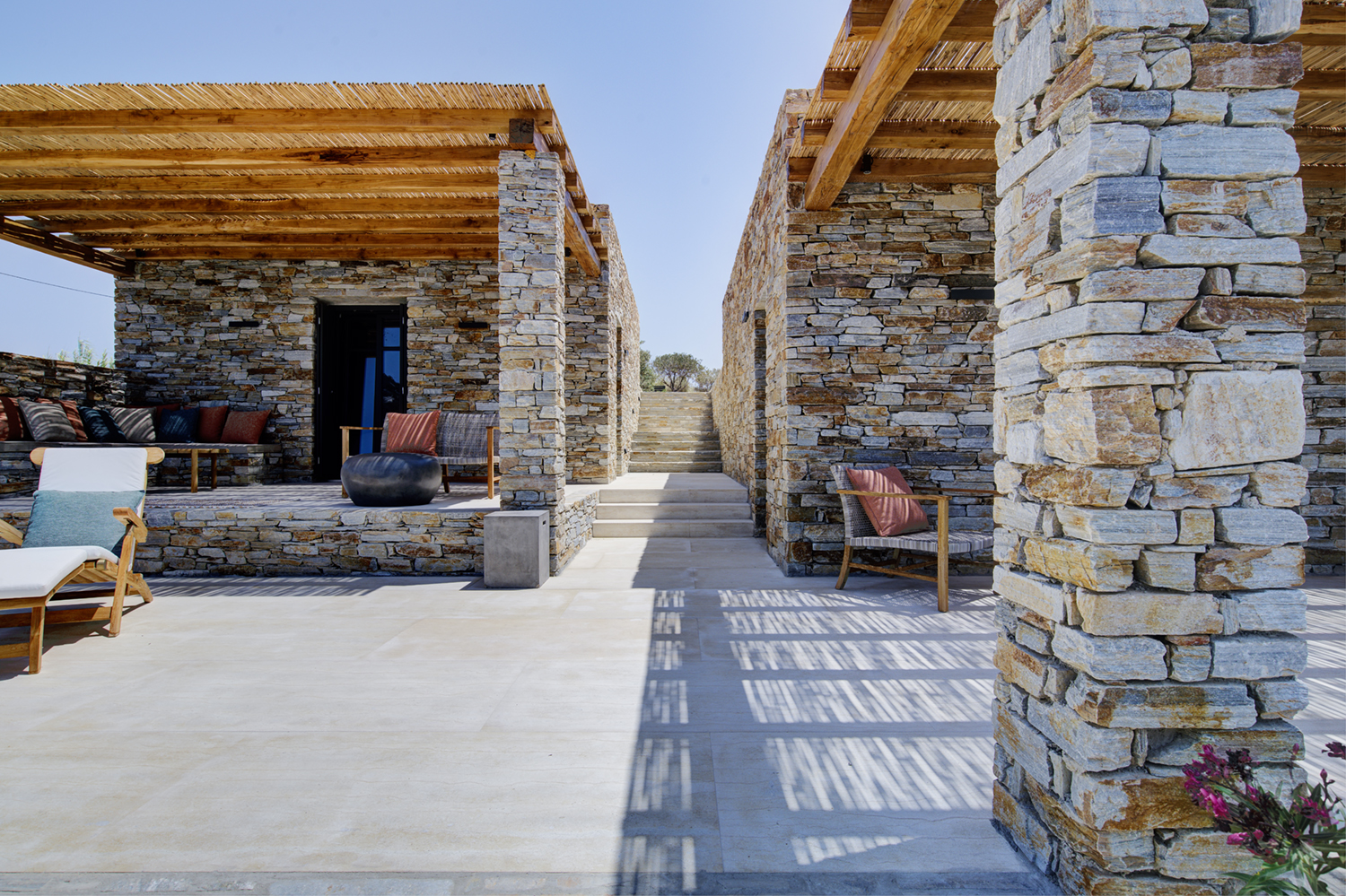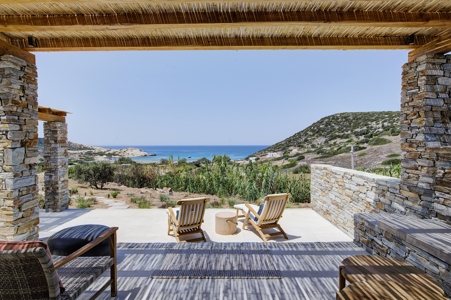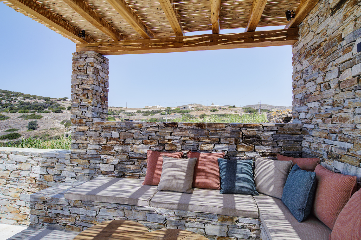Designed by DECA architects, the villa is walking distance from Livadia beach on the west coast of Antiparos. Inspired by the surrounding natural landscape, it is built from local stone and wood, with a beautiful covered terrace that frames the view of the Aegean beyond. With a generous pool and long outdoor dining table, it is designed with relaxing vacations in mind. Livadia can be rented as either a four or six bedroom house, with a maximum of 12 guests.