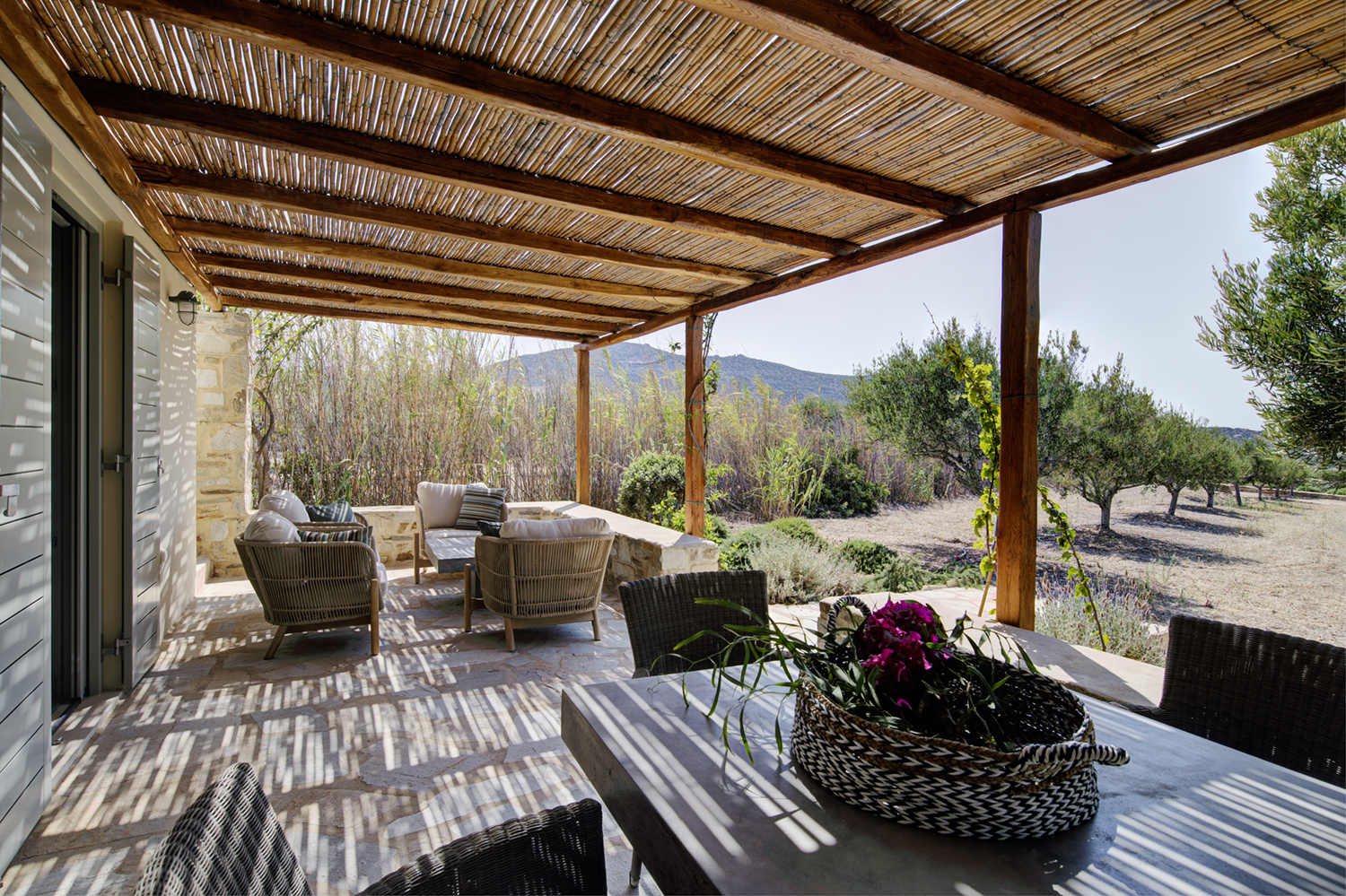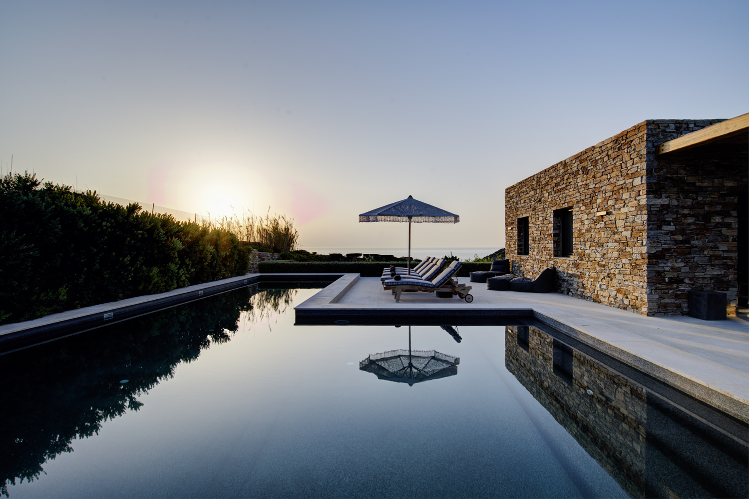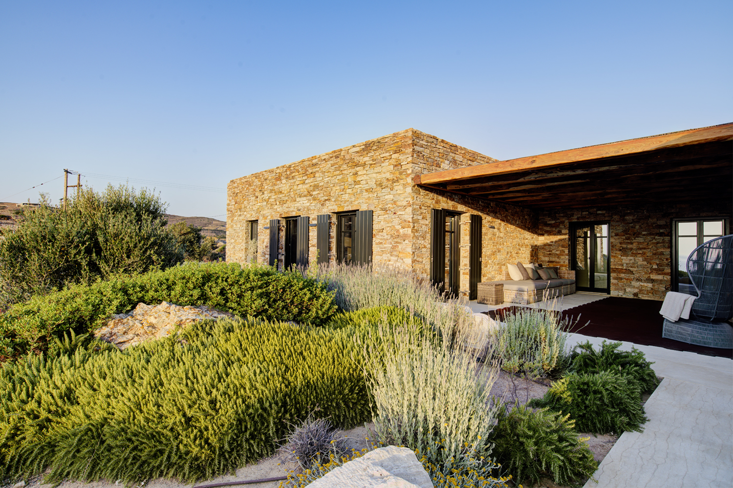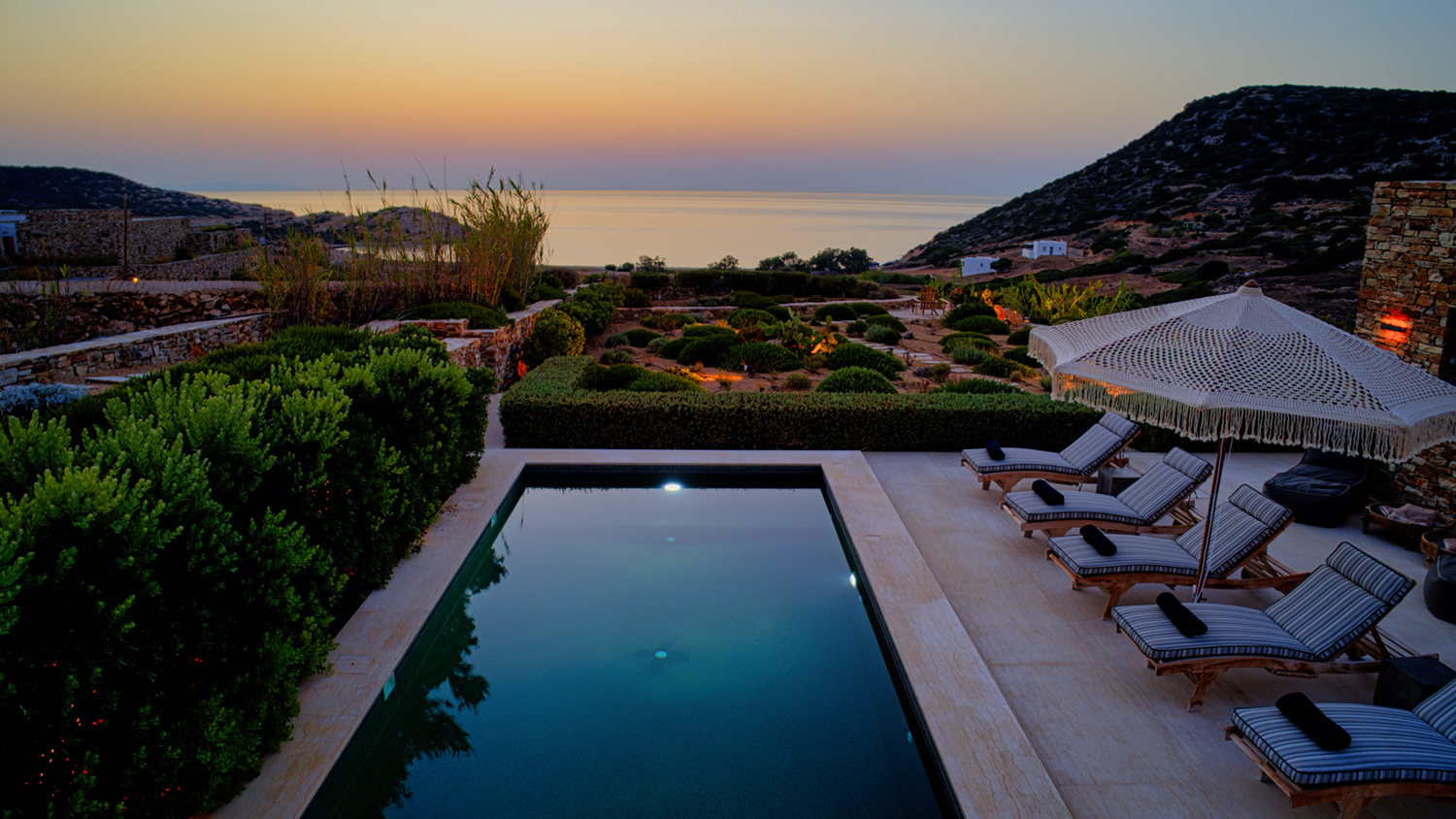 Designed by DECA architects, the villa is walking distance from Livadia beach on the west coast of Antiparos. Inspired by the surrounding natural landscape, it is built from local stone and wood, with a beautiful covered terrace that frames the view of the Aegean beyond. With a generous pool and long outdoor dining table, it is designed with relaxing vacations in mind. Livadia can be rented as either a four or six bedroom house, with a maximum of 12 guests.