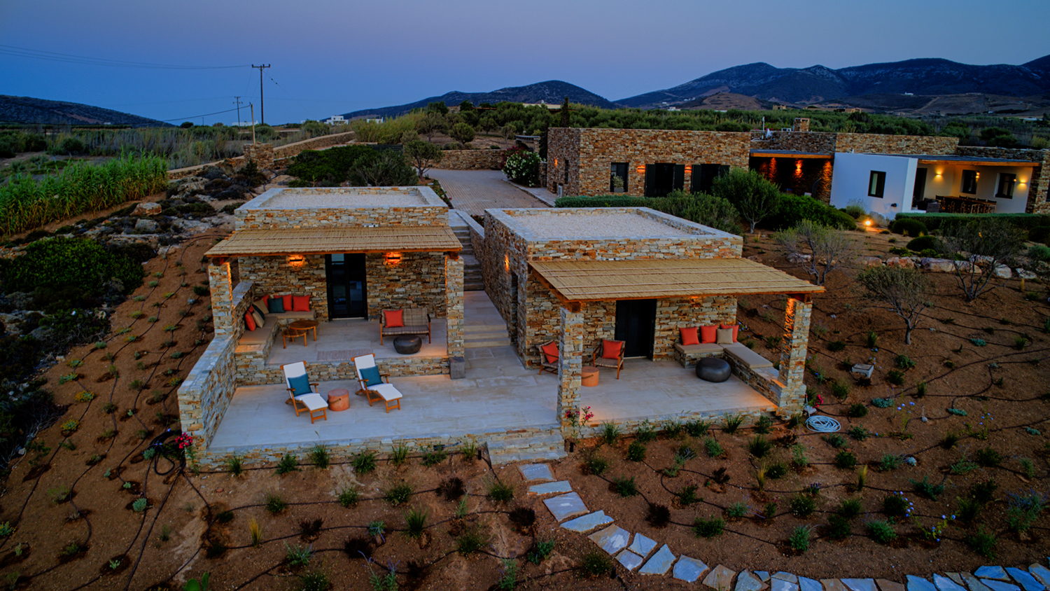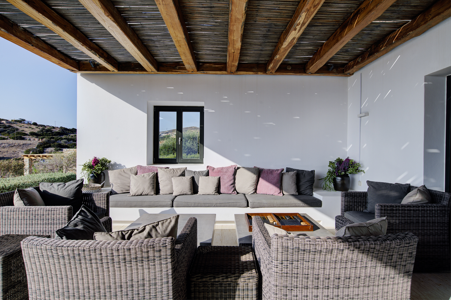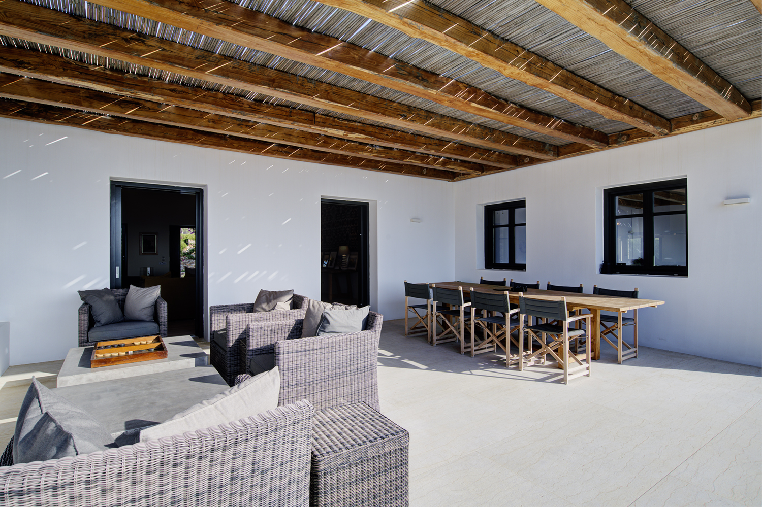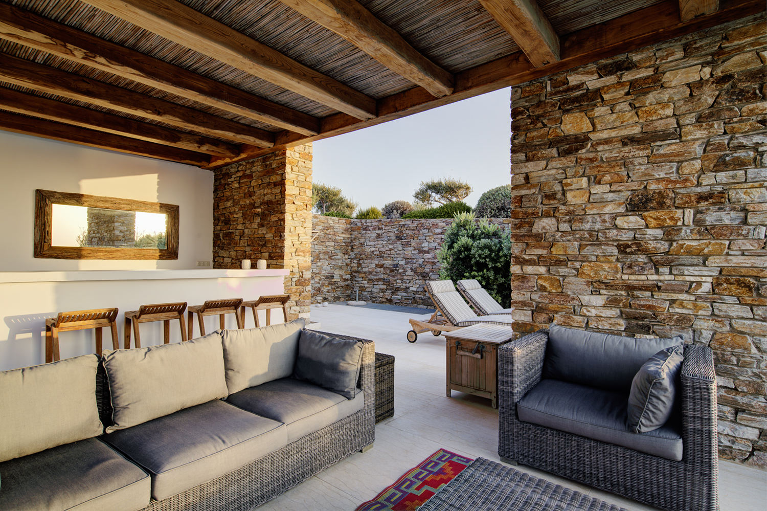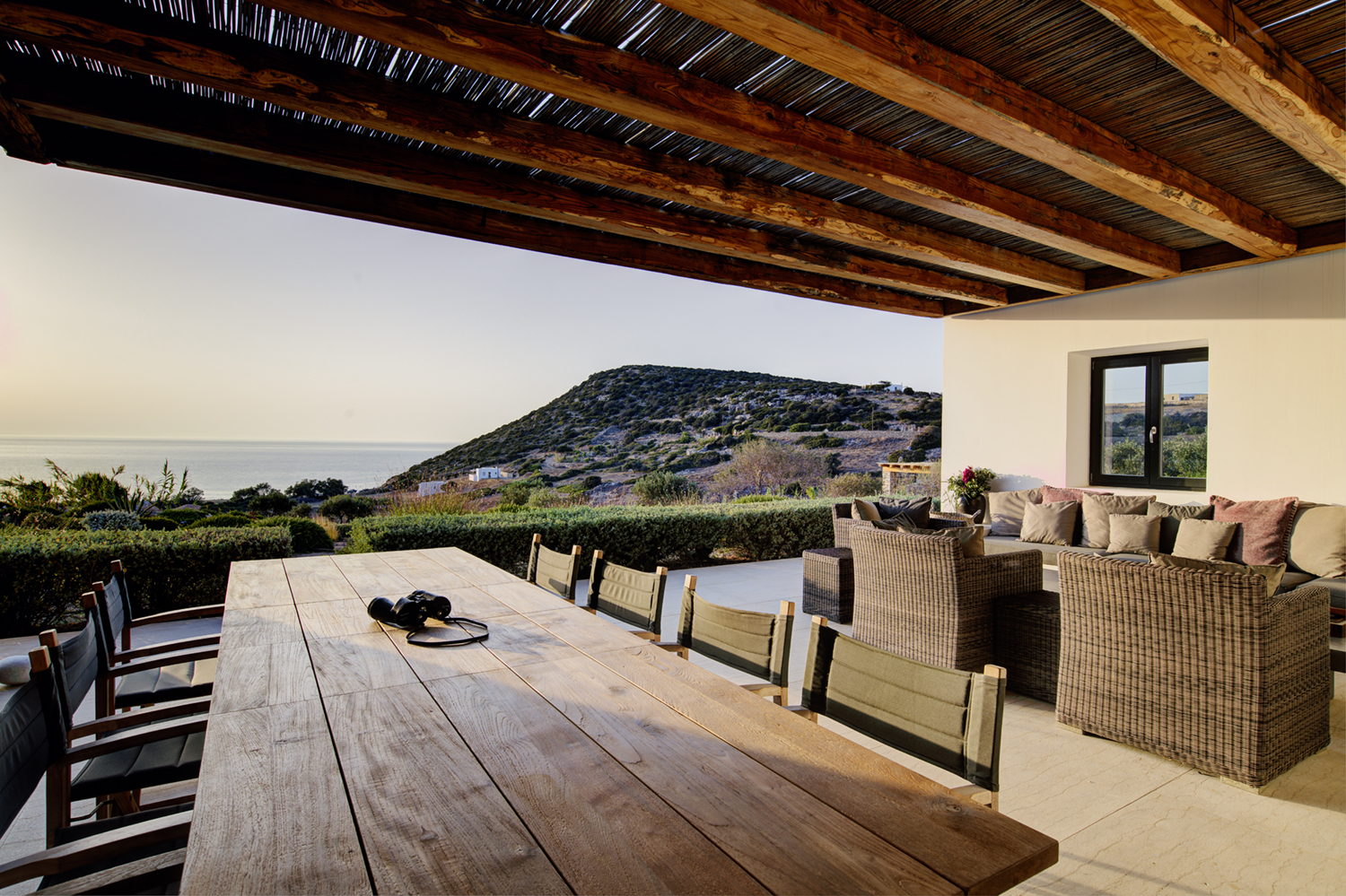 Designed by DECA architects, the villa is walking distance from Livadia beach on the west coast of Antiparos. Inspired by the surrounding natural landscape, it is built from local stone and wood, with a beautiful covered terrace that frames the view of the Aegean beyond. With a generous pool and long outdoor dining table, it is designed with relaxing vacations in mind. Livadia can be rented as either a four or six bedroom house, with a maximum of 12 guests.