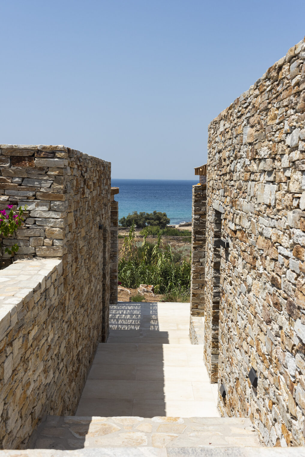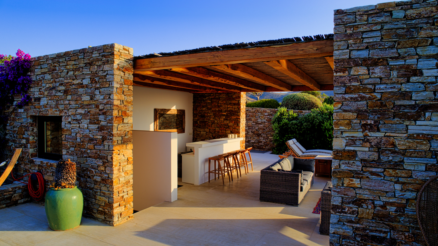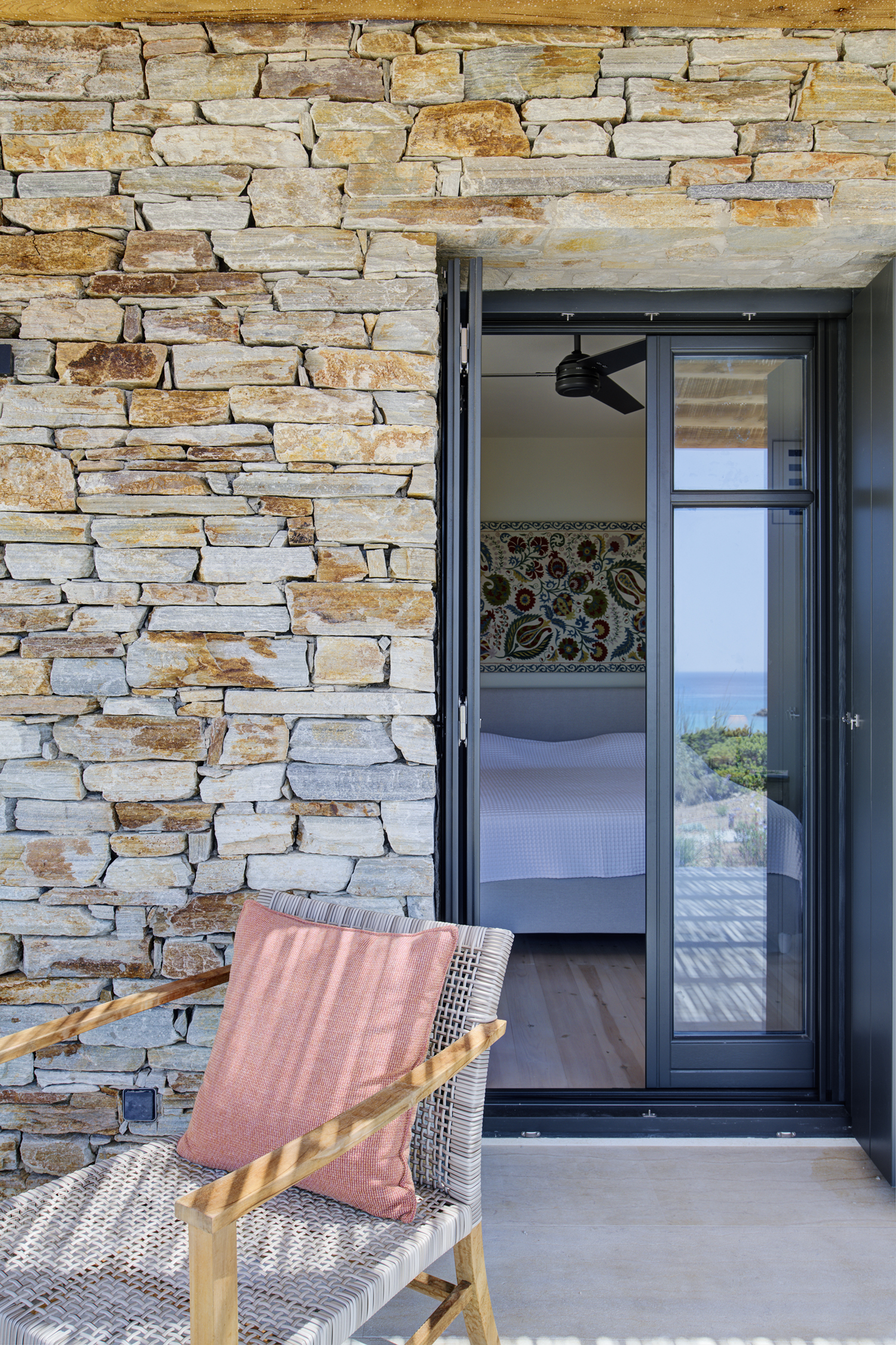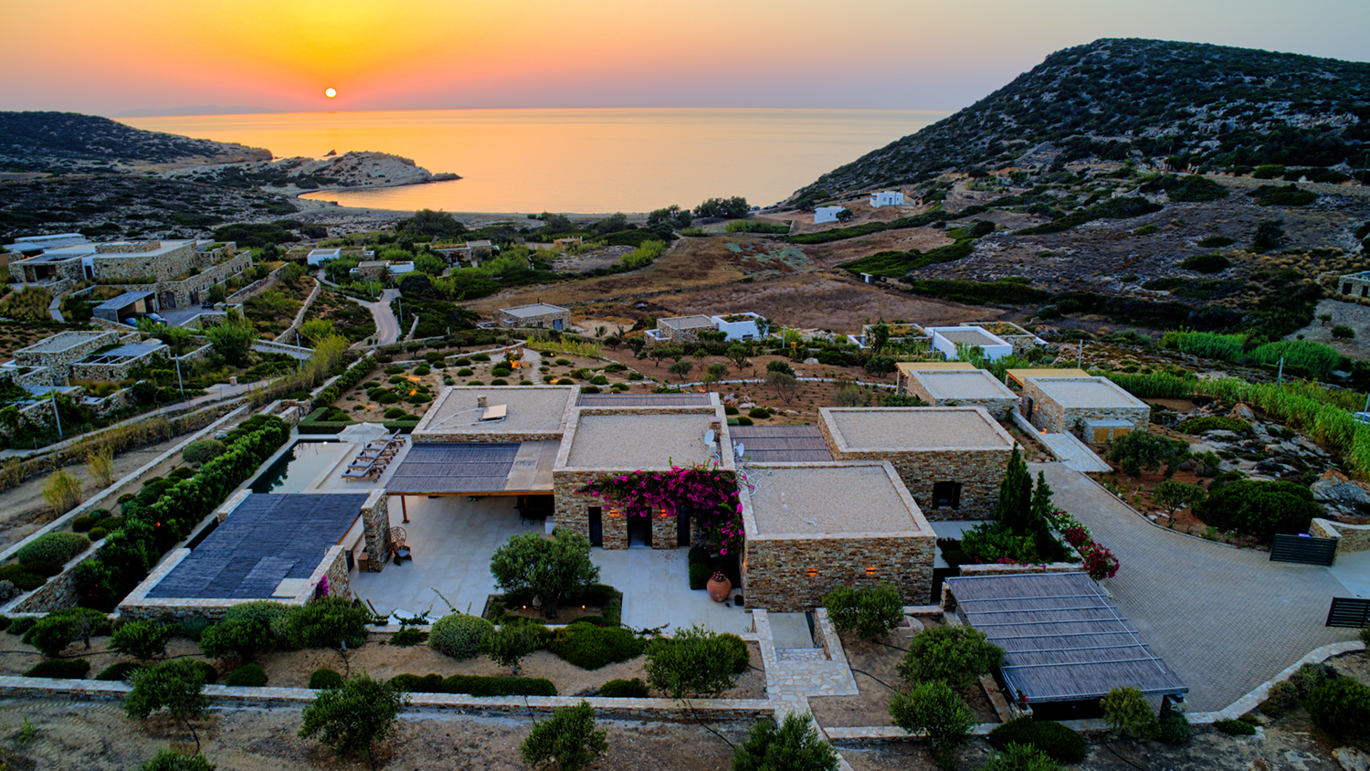 Designed by DECA architects, the villa is walking distance from Livadia beach on the west coast of Antiparos. Inspired by the surrounding natural landscape, it is built from local stone and wood, with a beautiful covered terrace that frames the view of the Aegean beyond. With a generous pool and long outdoor dining table, it is designed with relaxing vacations in mind. Livadia can be rented as either a four or six bedroom house, with a maximum of 12 guests.