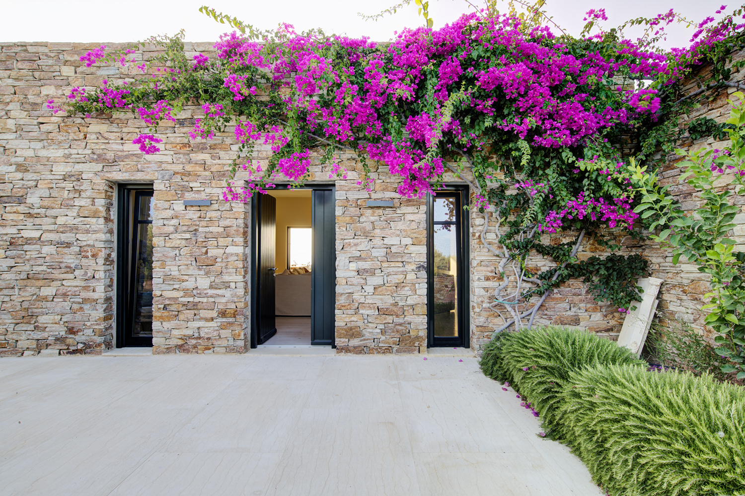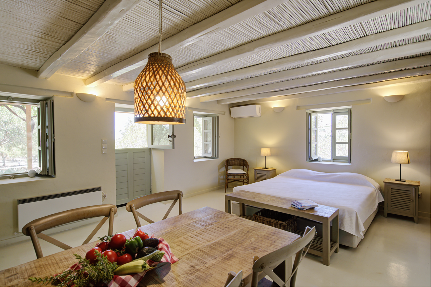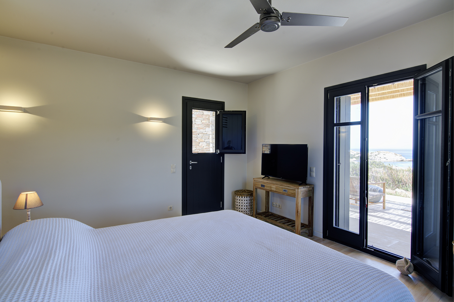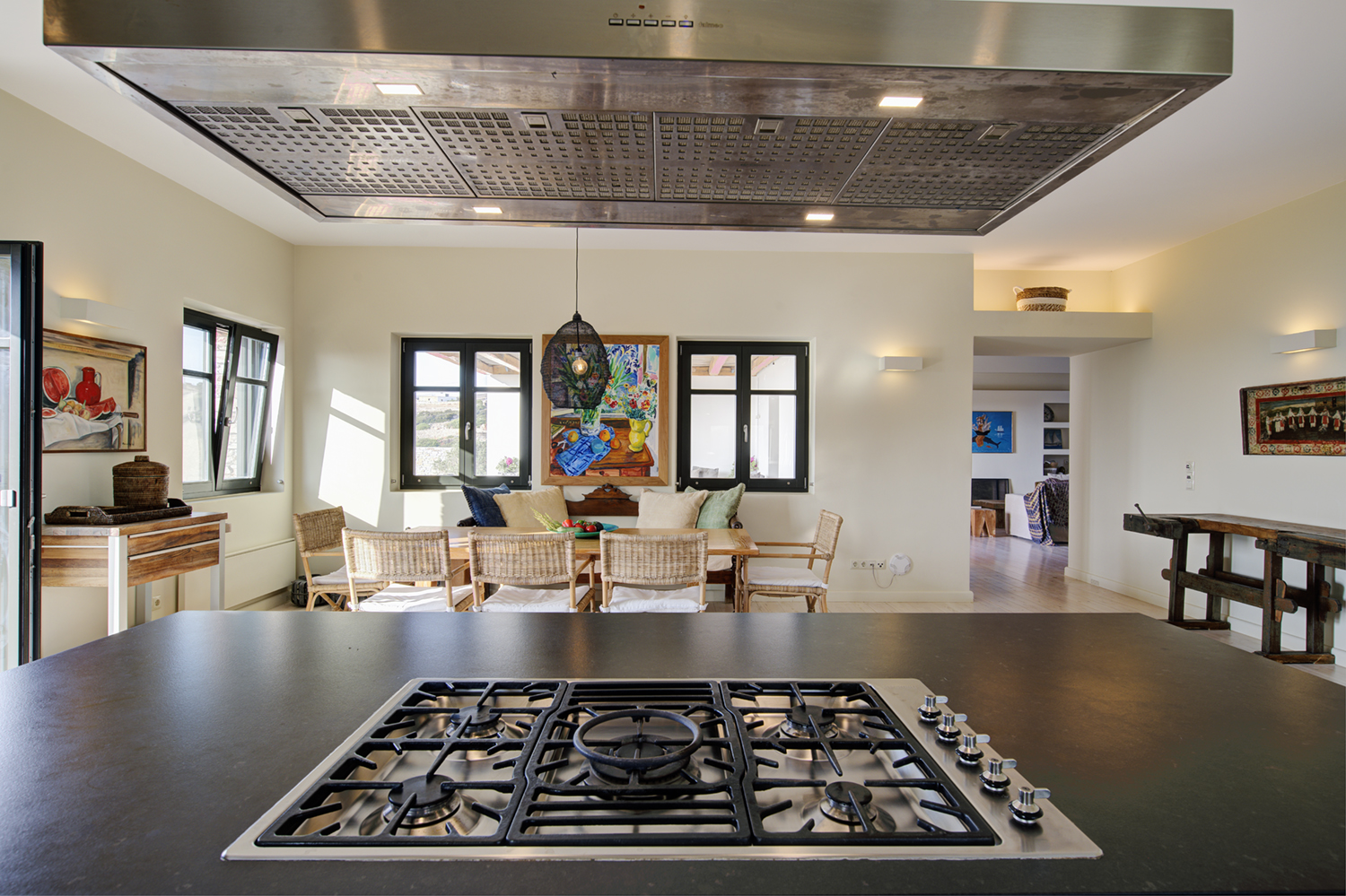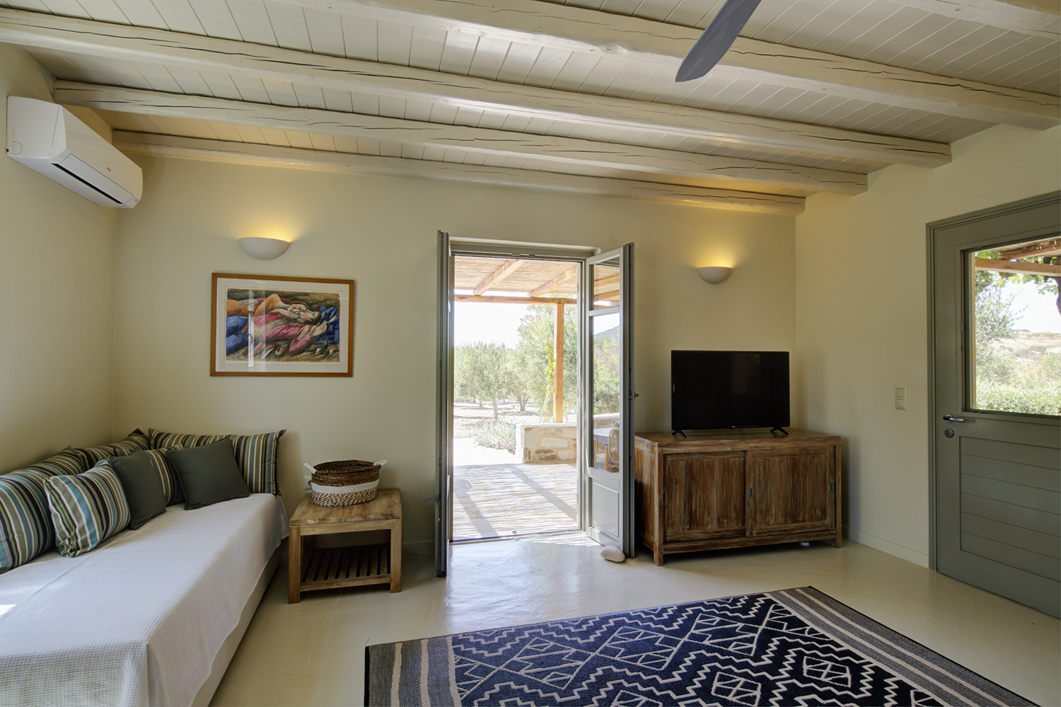 Designed by DECA architects, the villa is walking distance from Livadia beach on the west coast of Antiparos. Inspired by the surrounding natural landscape, it is built from local stone and wood, with a beautiful covered terrace that frames the view of the Aegean beyond. With a generous pool and long outdoor dining table, it is designed with relaxing vacations in mind. Livadia can be rented as either a four or six bedroom house, with a maximum of 12 guests.