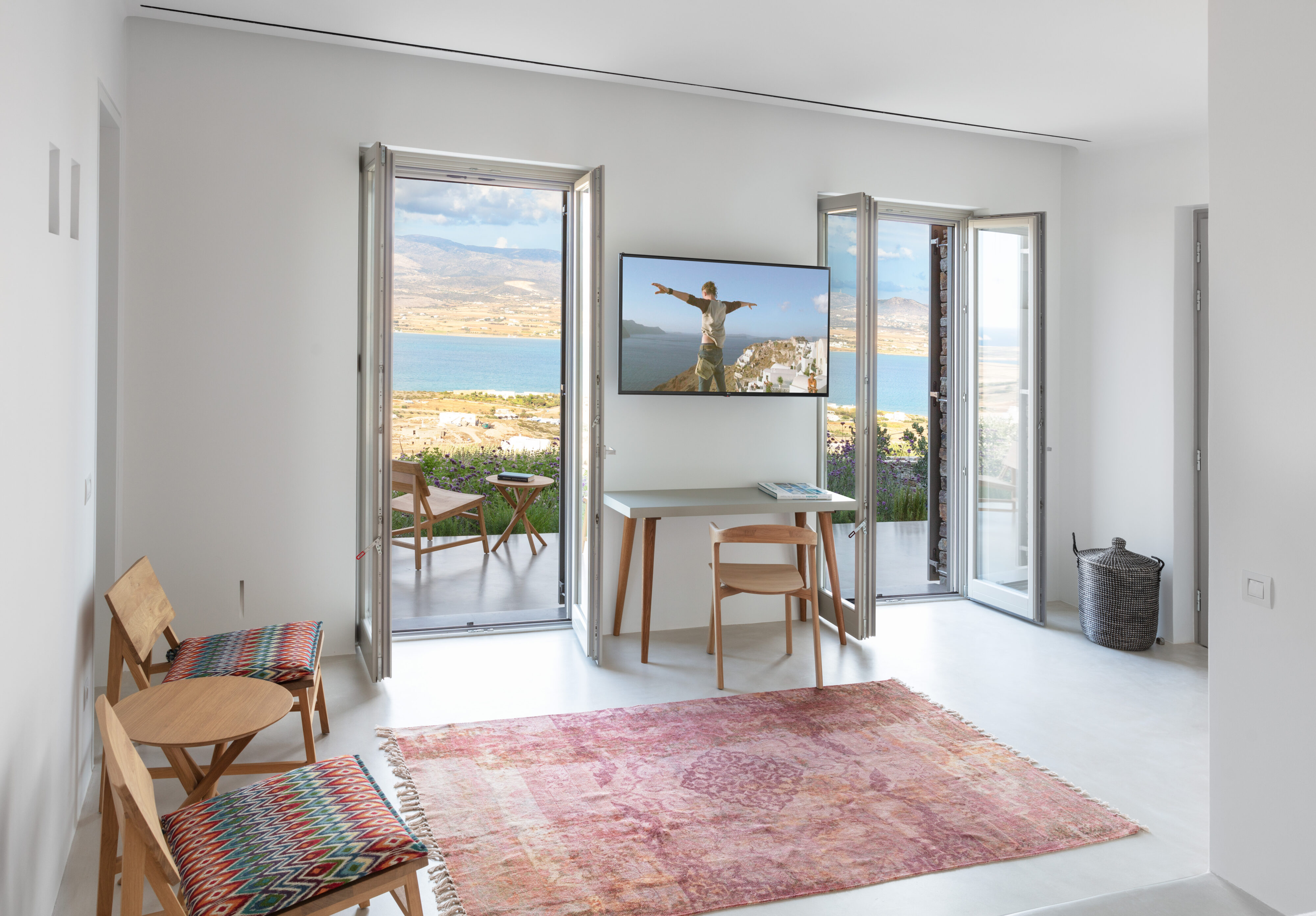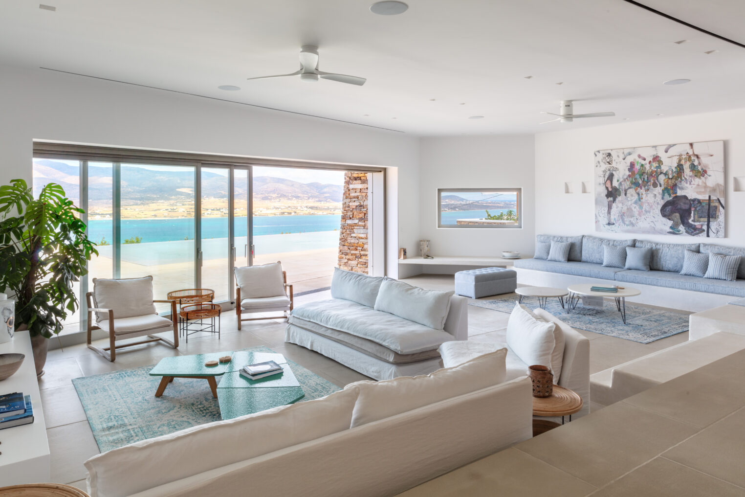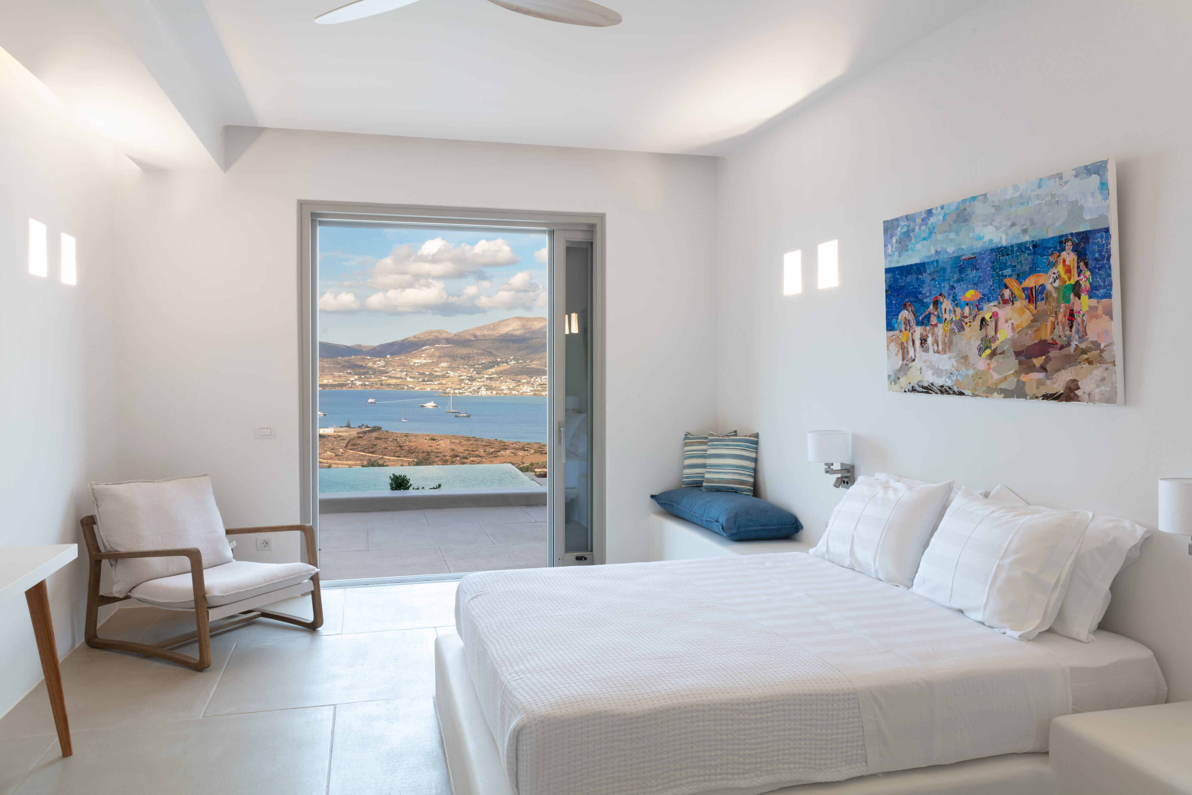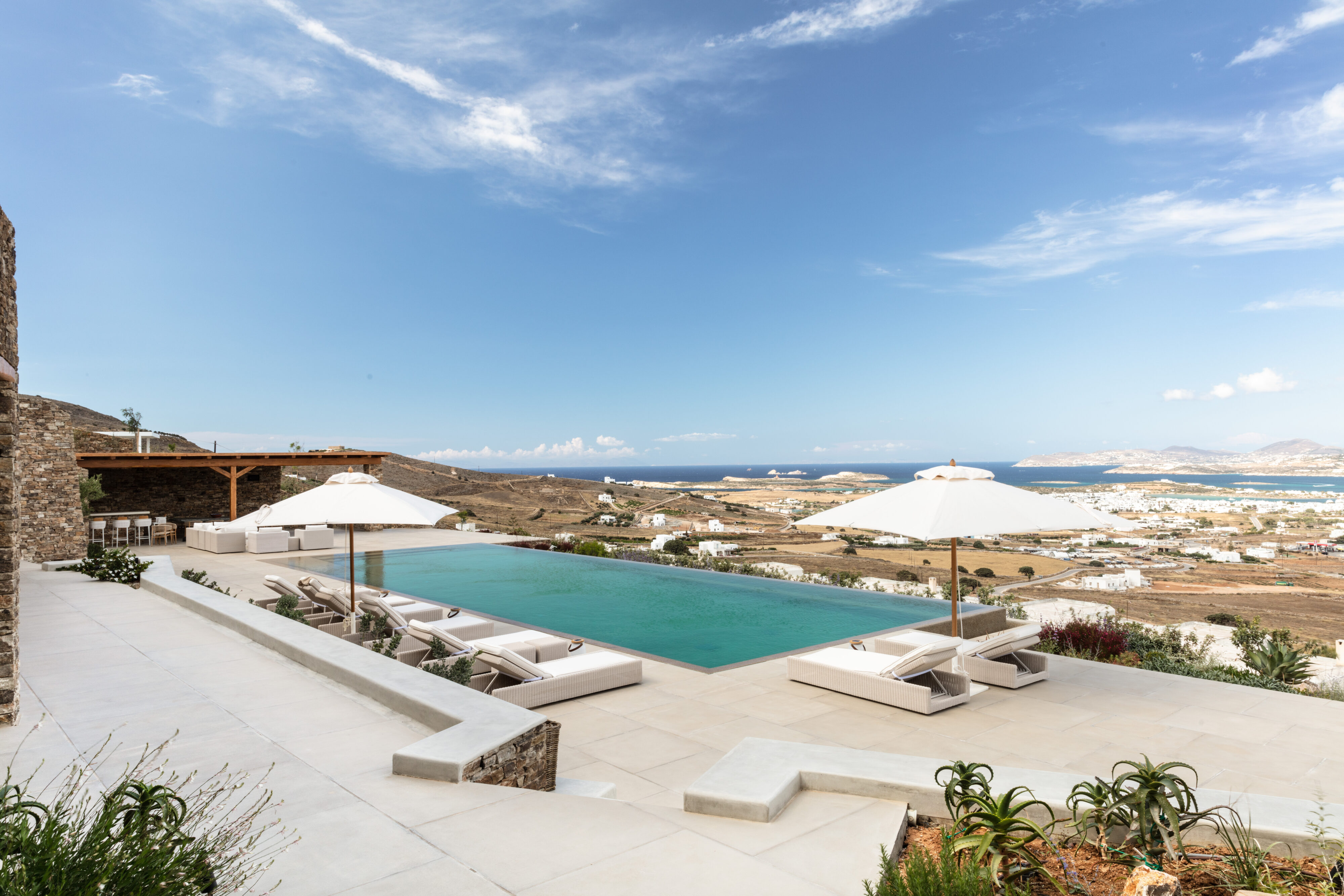 Parathires enjoys a wonderful setting, with sweeping views over Antiparos’ coastline and the Chora, and the surrounding natural landscape. With eight bedrooms sleeping 16 people, this villa is perfect for big groups and occasions. It has an infinity pool looking across to neighboring Cycladic islands, with plenty of comfortable daybeds for lounging all together under the Mediterranean sun. Calm and serene, it is also close to the action down in the port and the Chora.