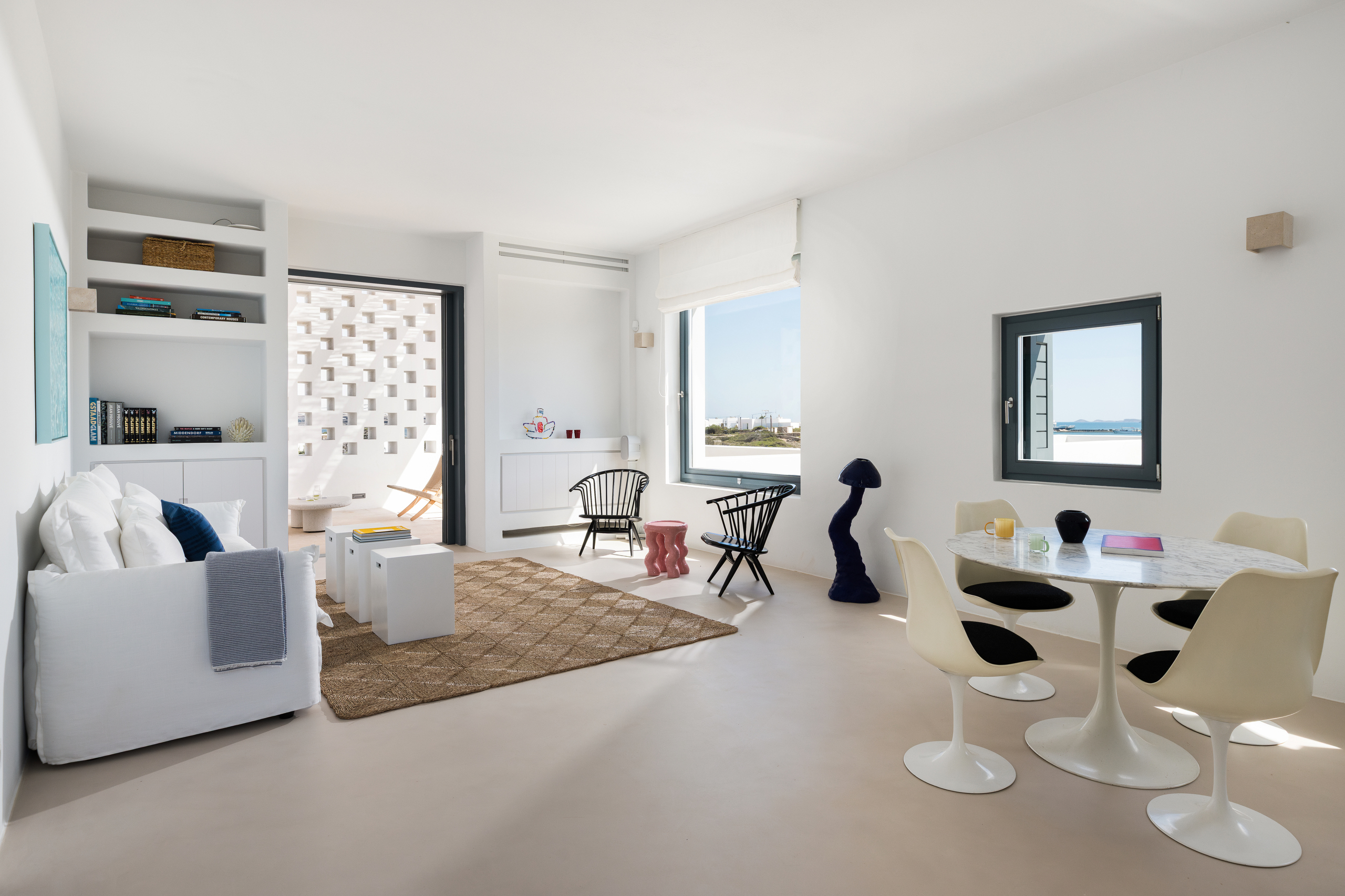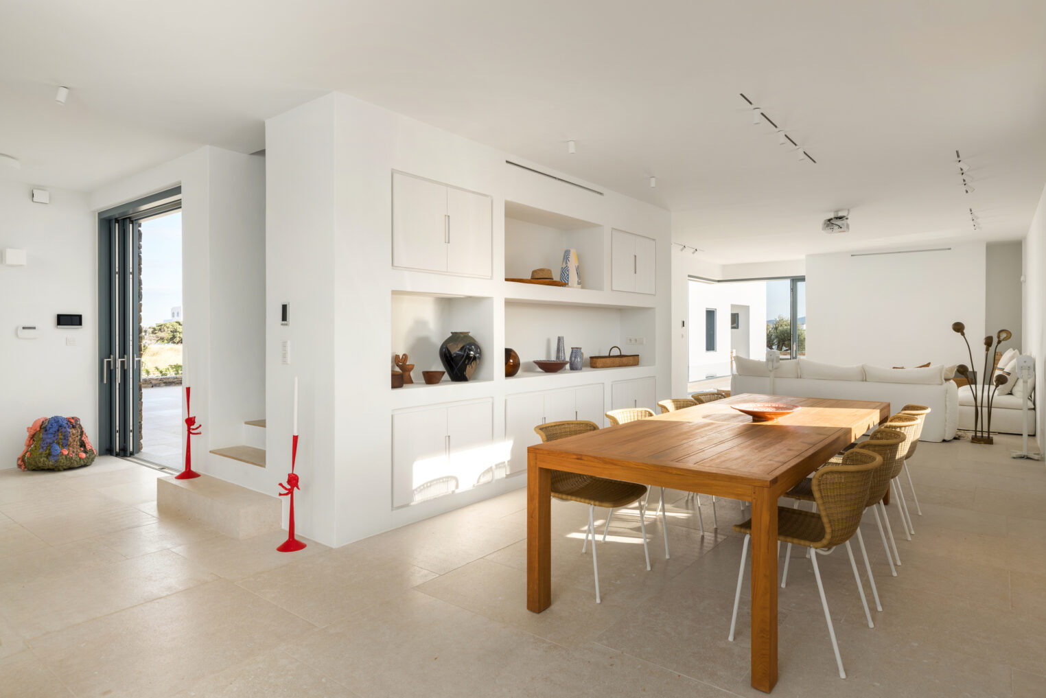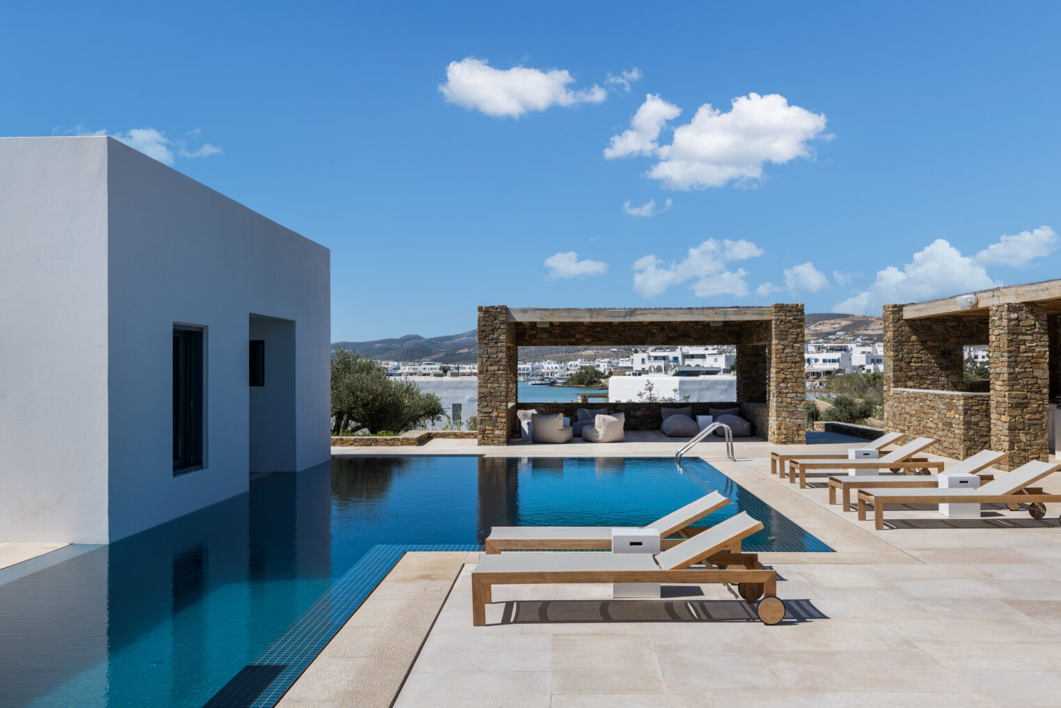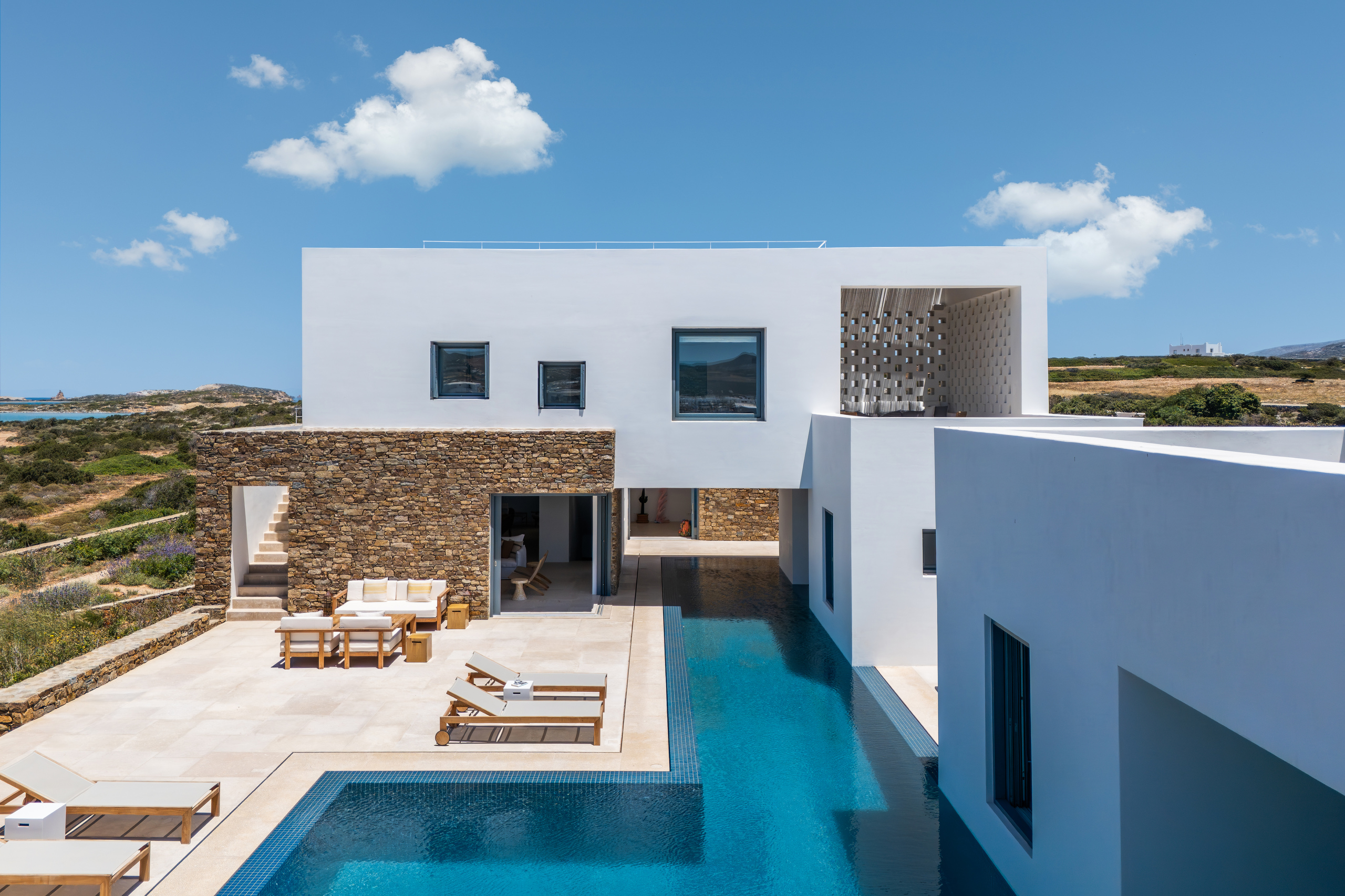 Tetris a brand new addition. delivered in the summer of 2024. This lovely 5 bedroom villa is a property that OLIAROS has managed it’s redevelopment, in collaboration with affiliated ARP , who have curated the elegant design. The property is within walking distance from the main village of Antiparos and a couple of beaches around the area. One can walk to two beautiful beaches to the north and south within 150 meters from the house. On the ground level, the views towards the northeast, east, and south are blocked by neighboring settlements. The positioning of the volumes in the ground floor carefully filters through unwanted views, thus creating a well-nurtured Cycladic oasis that develops around an L-shaped pool and extends visually to the forestry land. In the upper level, the spaces open up to the port and sunset views with large openings and terraces. On the rooftop, there is an exterior sunken living room with a 360 panoramic perspective.