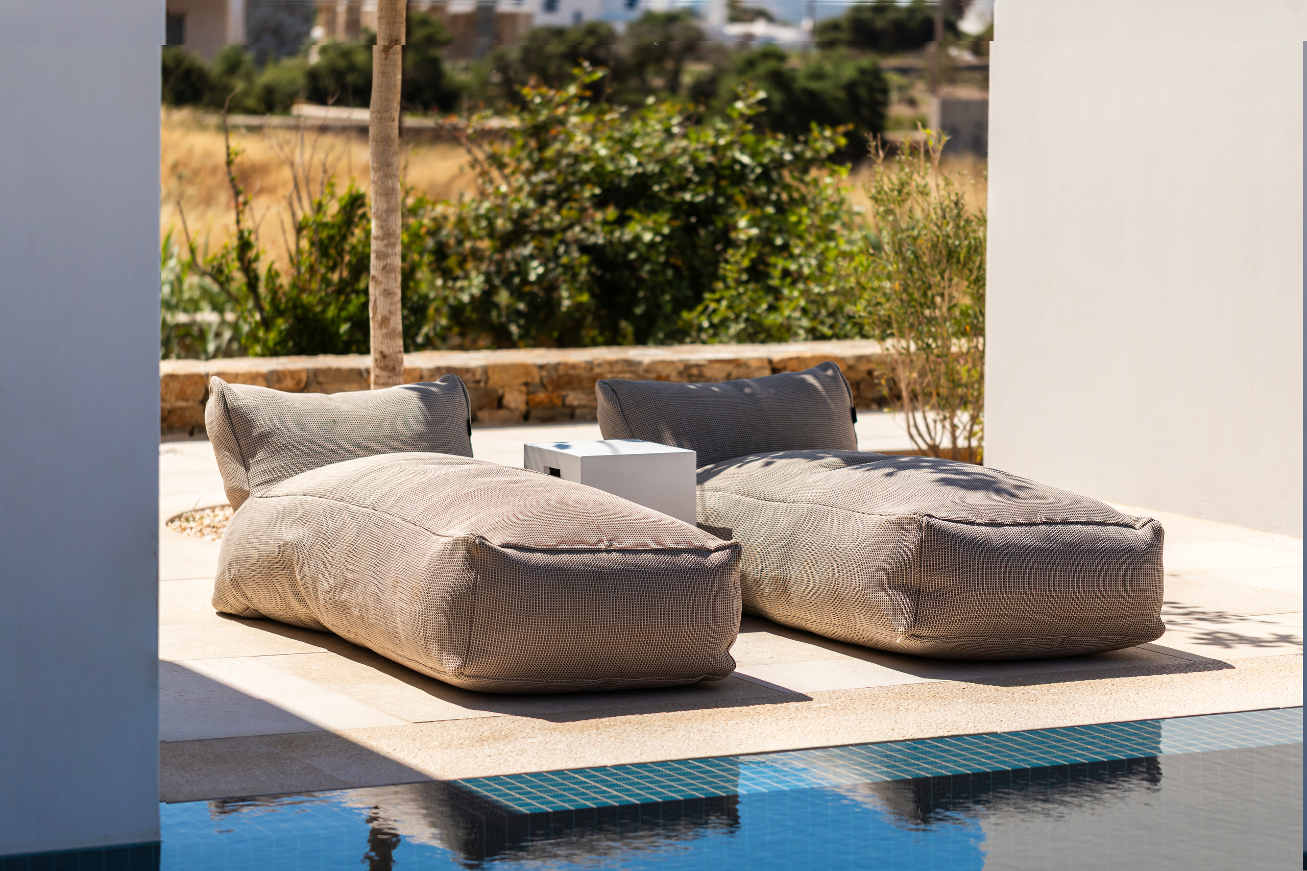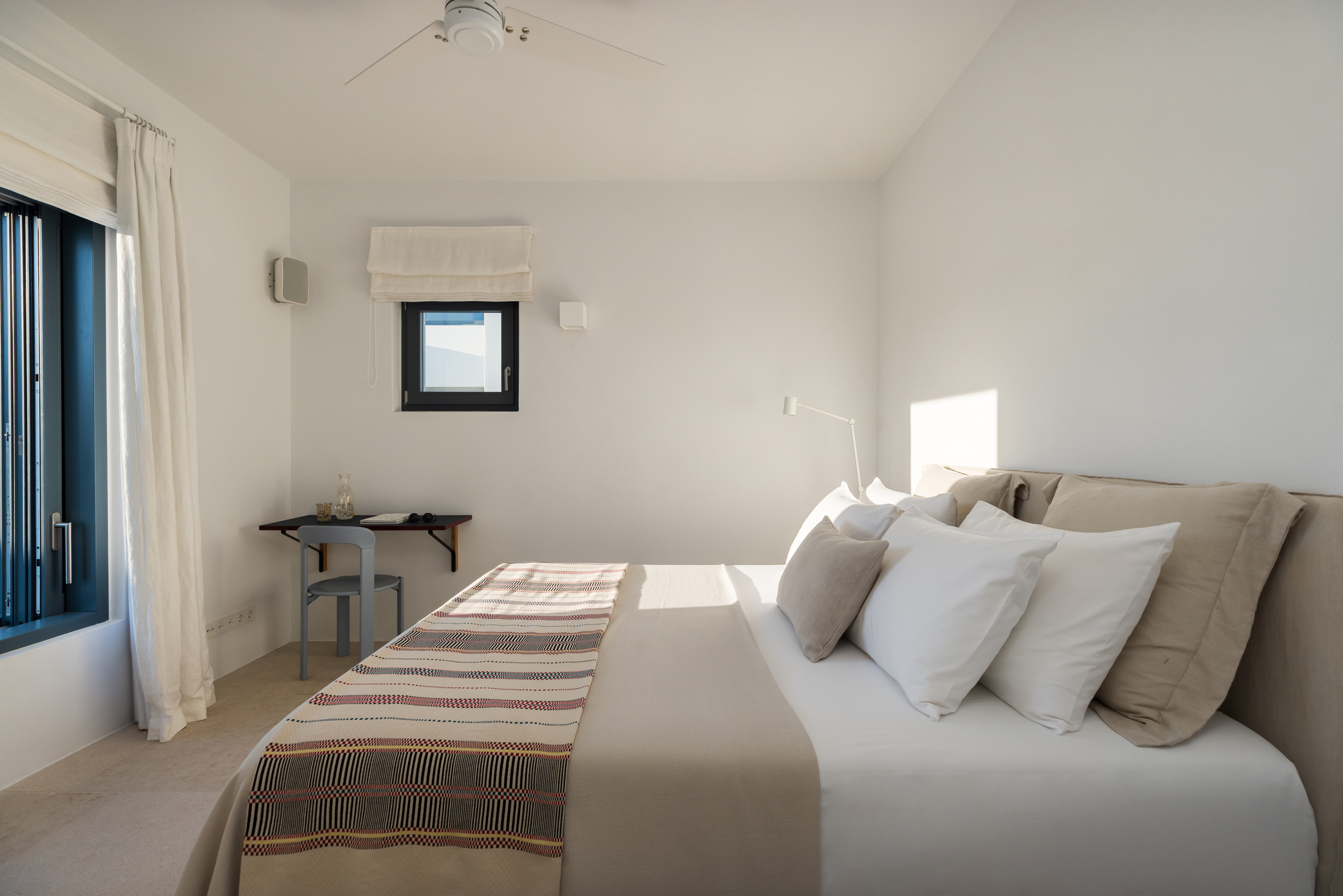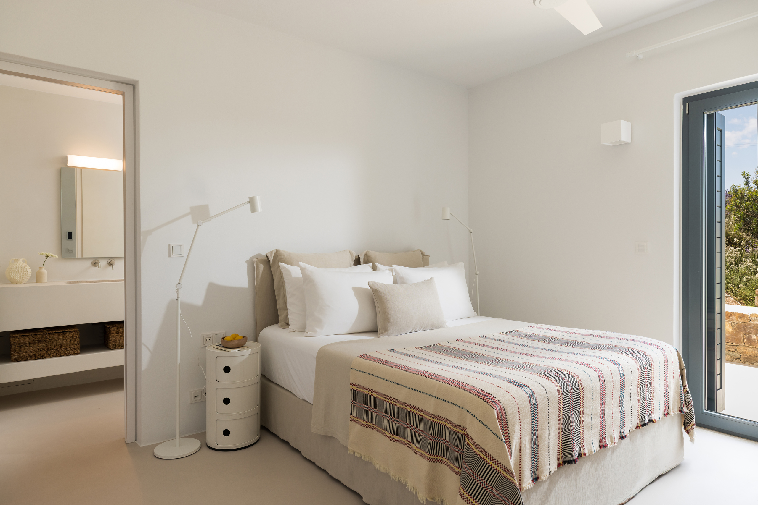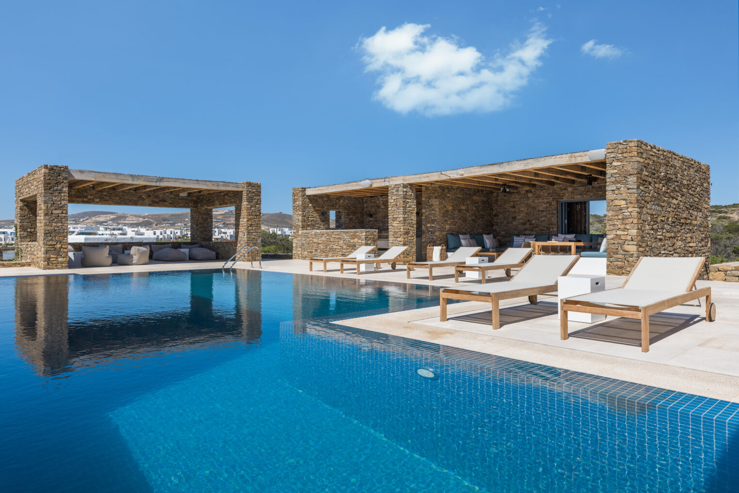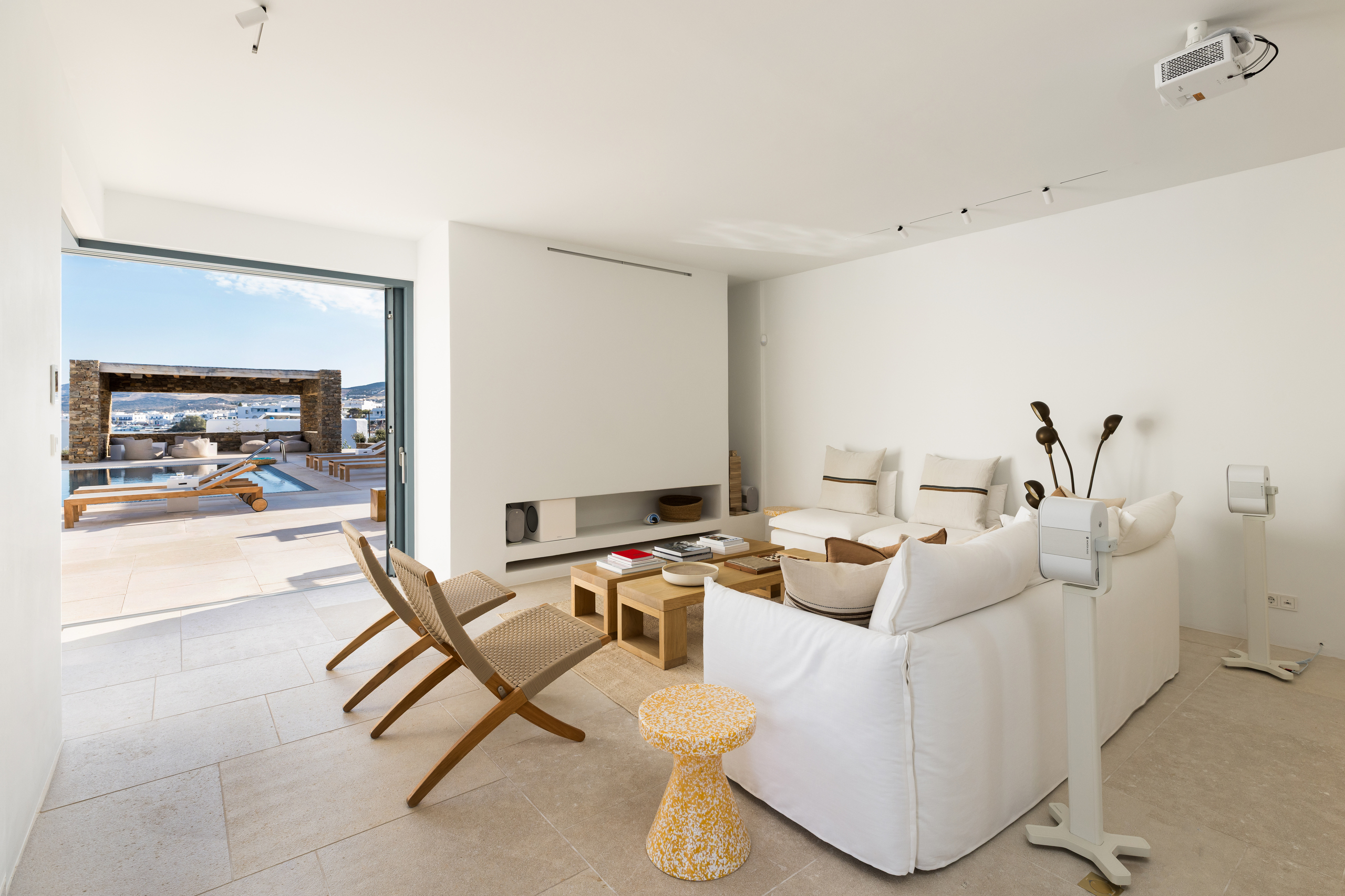 Tetris a brand new addition. delivered in the summer of 2024. This lovely 5 bedroom villa is a property that OLIAROS has managed it’s redevelopment, in collaboration with affiliated ARP , who have curated the elegant design. The property is within walking distance from the main village of Antiparos and a couple of beaches around the area. One can walk to two beautiful beaches to the north and south within 150 meters from the house. On the ground level, the views towards the northeast, east, and south are blocked by neighboring settlements. The positioning of the volumes in the ground floor carefully filters through unwanted views, thus creating a well-nurtured Cycladic oasis that develops around an L-shaped pool and extends visually to the forestry land. In the upper level, the spaces open up to the port and sunset views with large openings and terraces. On the rooftop, there is an exterior sunken living room with a 360 panoramic perspective.