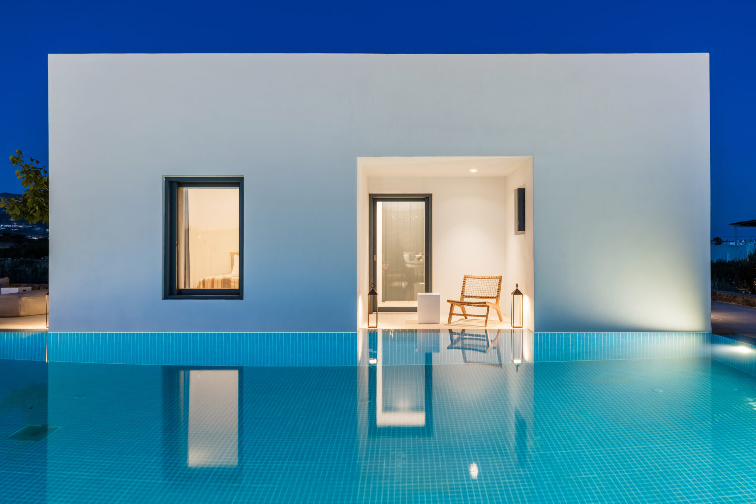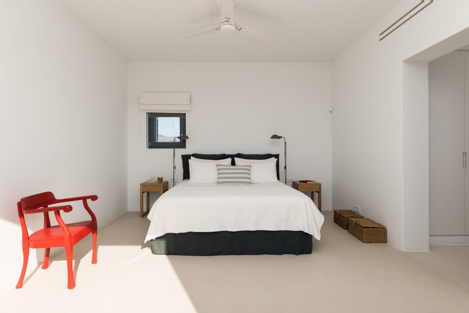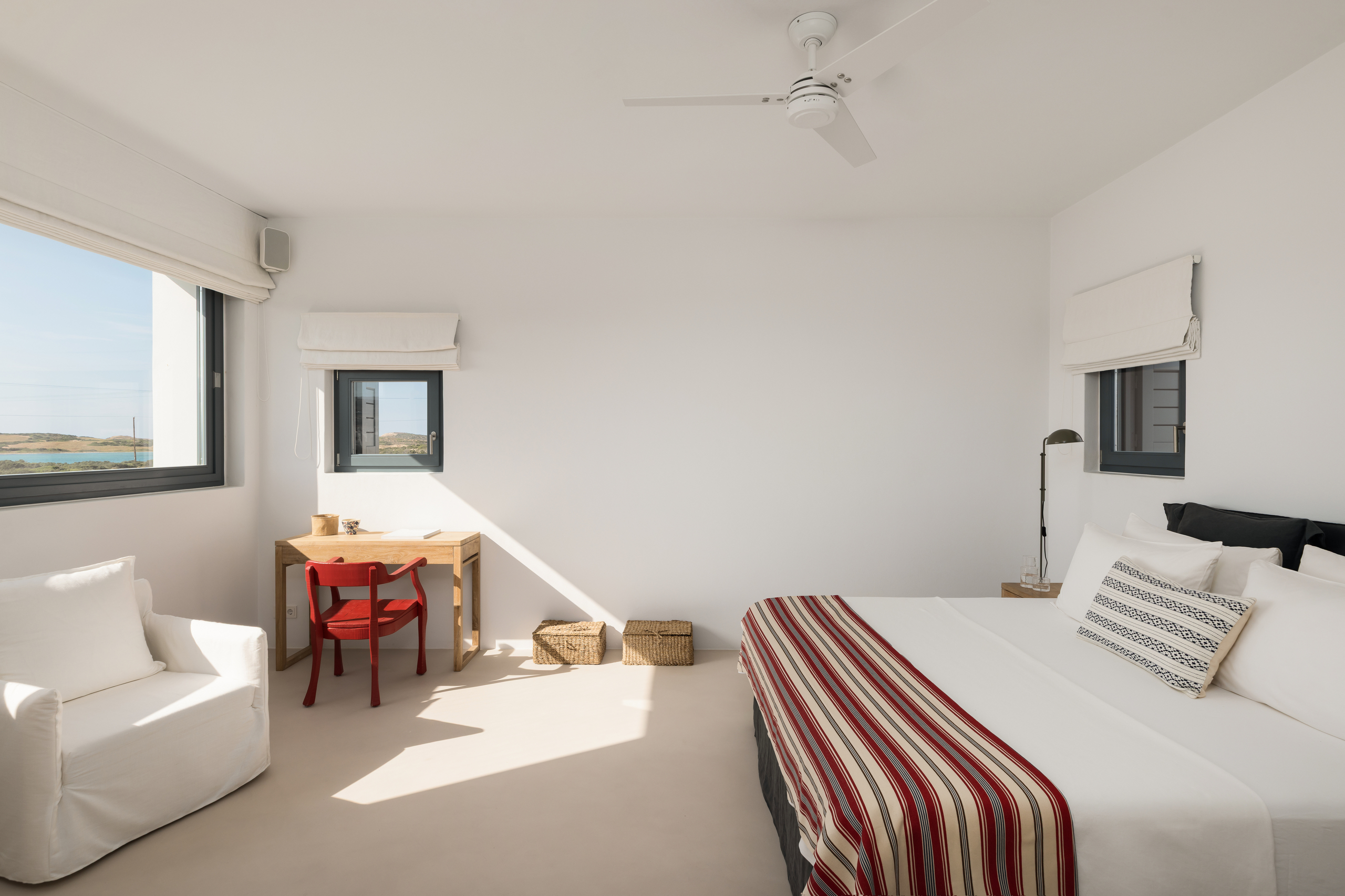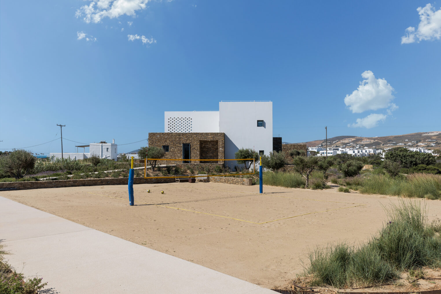 Tetris a brand new addition. delivered in the summer of 2024. This lovely 5 bedroom villa is a property that OLIAROS has managed it’s redevelopment, in collaboration with affiliated ARP , who have curated the elegant design. The property is within walking distance from the main village of Antiparos and a couple of beaches around the area. One can walk to two beautiful beaches to the north and south within 150 meters from the house. On the ground level, the views towards the northeast, east, and south are blocked by neighboring settlements. The positioning of the volumes in the ground floor carefully filters through unwanted views, thus creating a well-nurtured Cycladic oasis that develops around an L-shaped pool and extends visually to the forestry land. In the upper level, the spaces open up to the port and sunset views with large openings and terraces. On the rooftop, there is an exterior sunken living room with a 360 panoramic perspective.