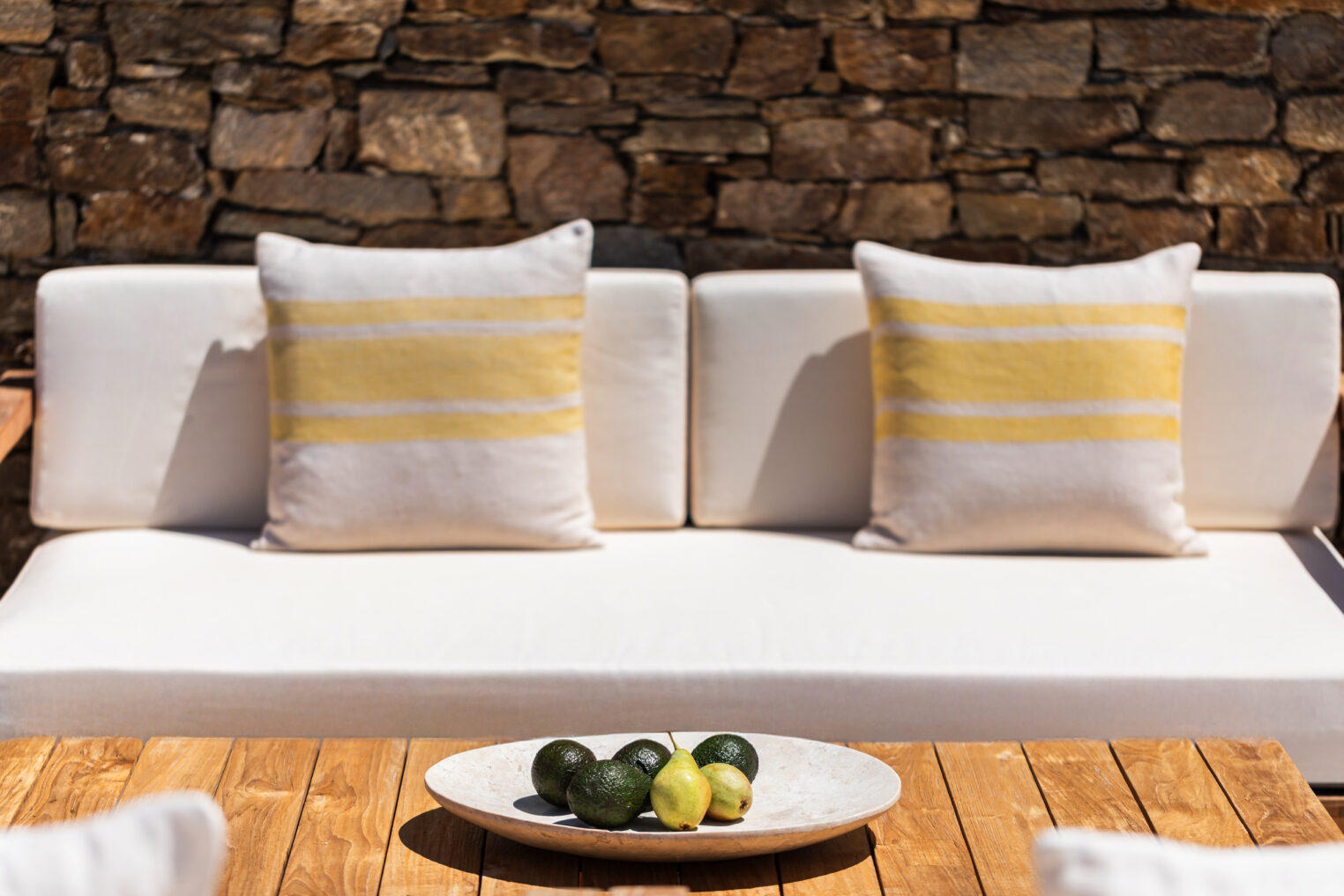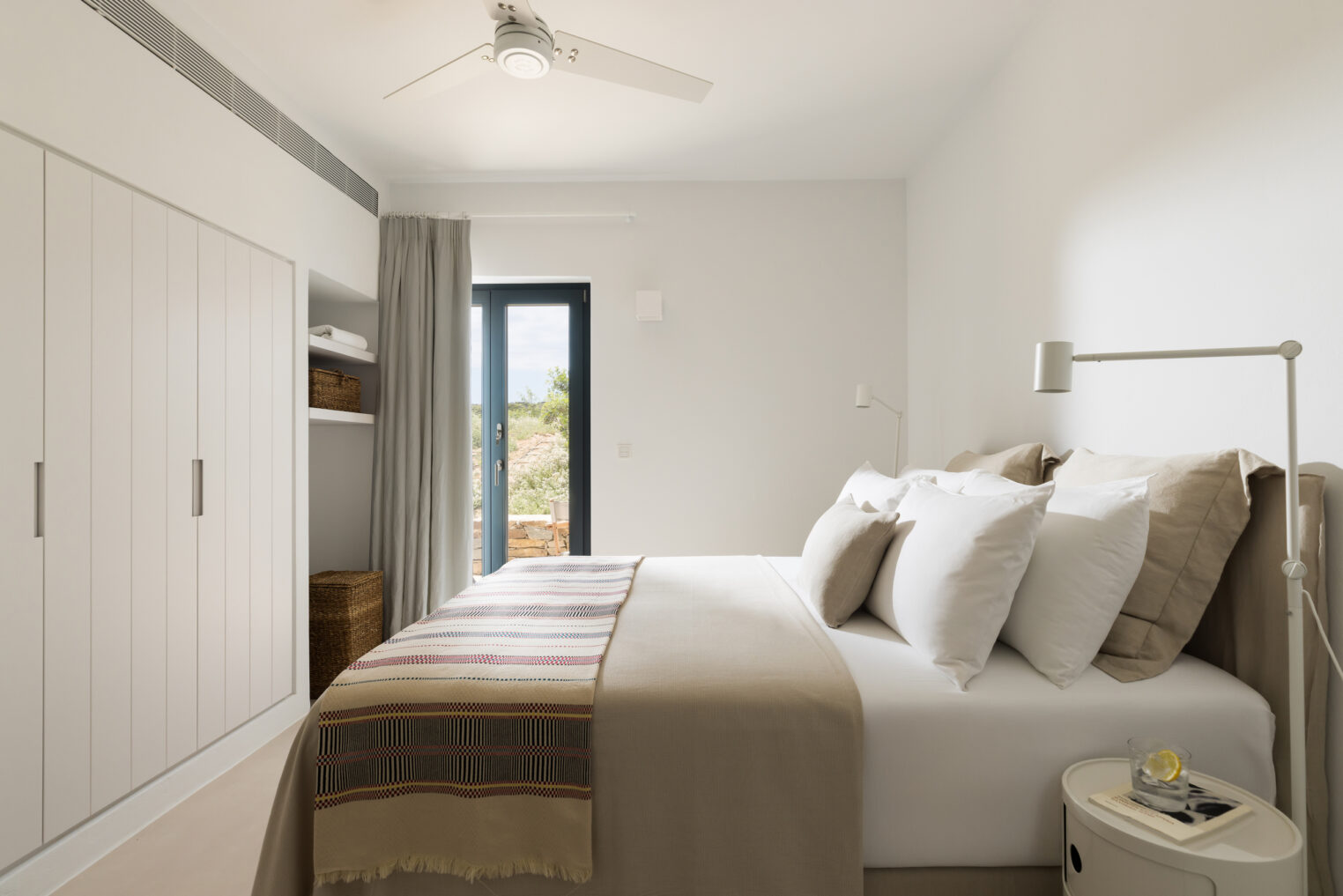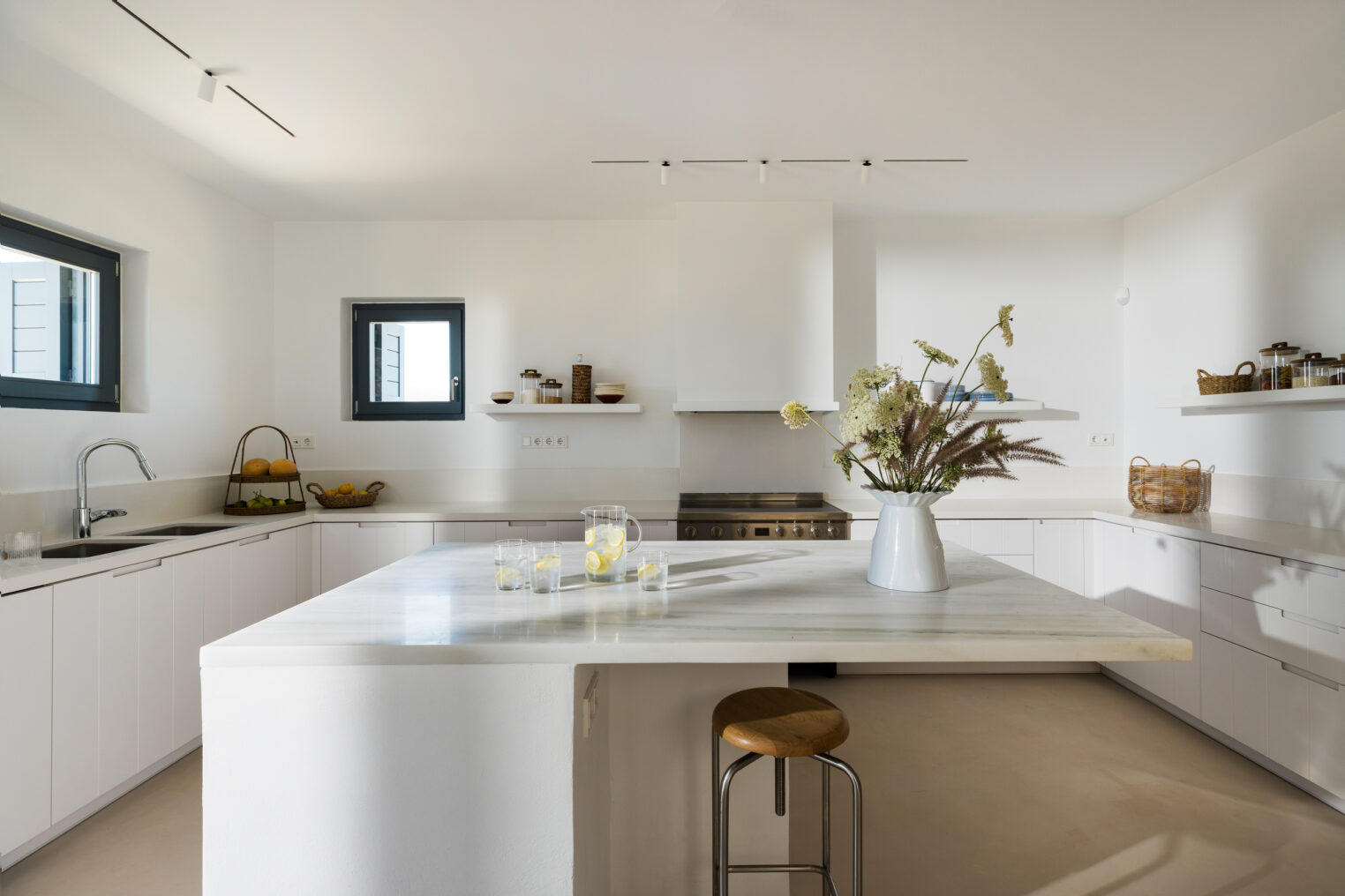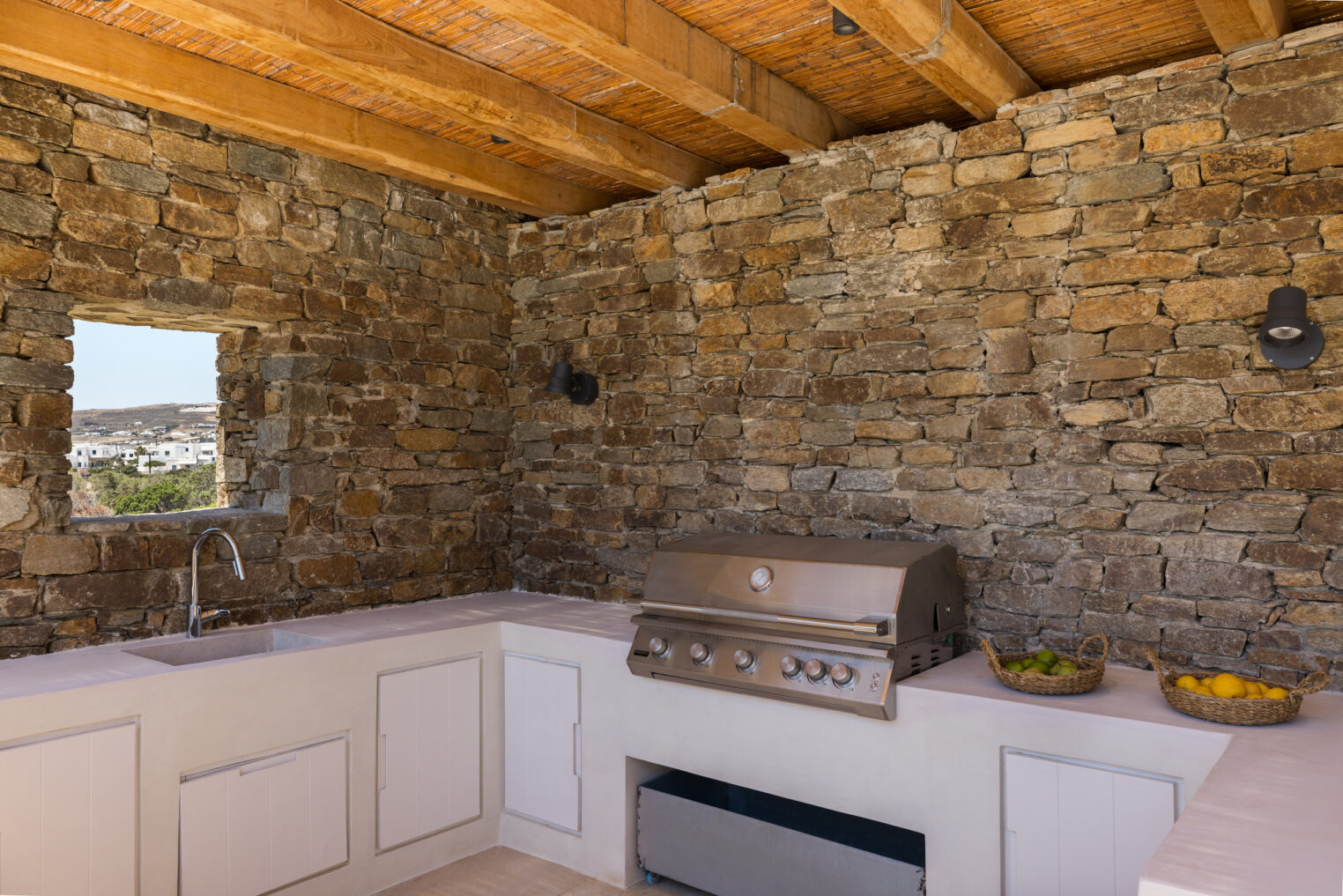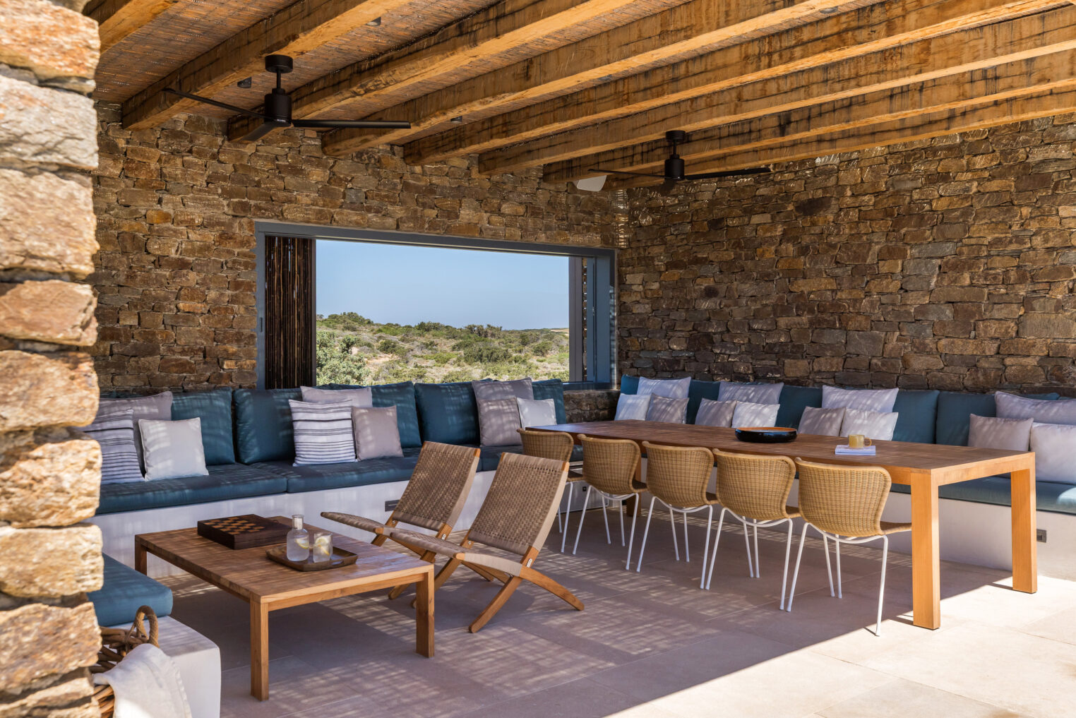 Tetris a brand new addition. delivered in the summer of 2024. This lovely 5 bedroom villa is a property that OLIAROS has managed it’s redevelopment, in collaboration with affiliated ARP , who have curated the elegant design. The property is within walking distance from the main village of Antiparos and a couple of beaches around the area. One can walk to two beautiful beaches to the north and south within 150 meters from the house. On the ground level, the views towards the northeast, east, and south are blocked by neighboring settlements. The positioning of the volumes in the ground floor carefully filters through unwanted views, thus creating a well-nurtured Cycladic oasis that develops around an L-shaped pool and extends visually to the forestry land. In the upper level, the spaces open up to the port and sunset views with large openings and terraces. On the rooftop, there is an exterior sunken living room with a 360 panoramic perspective.
