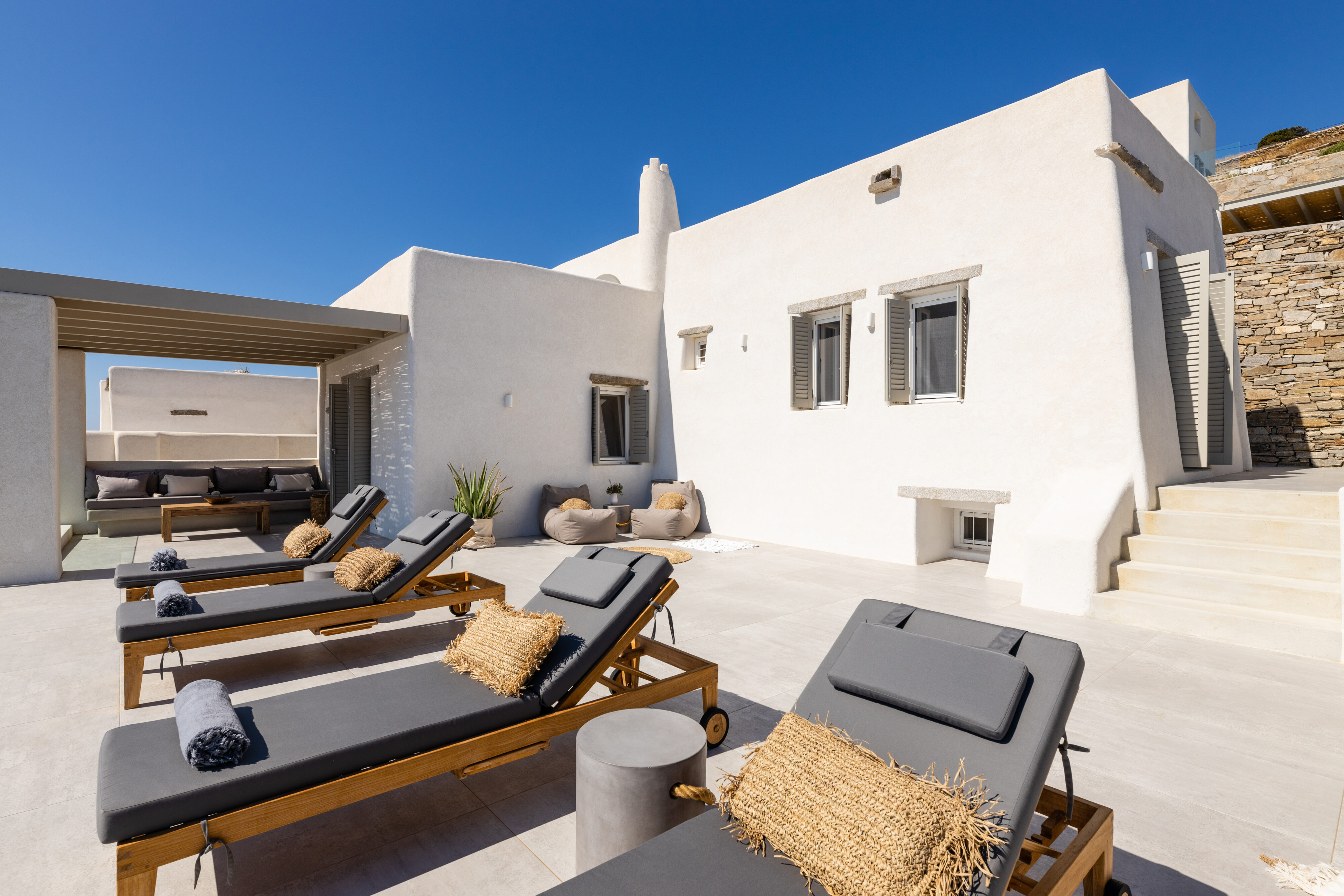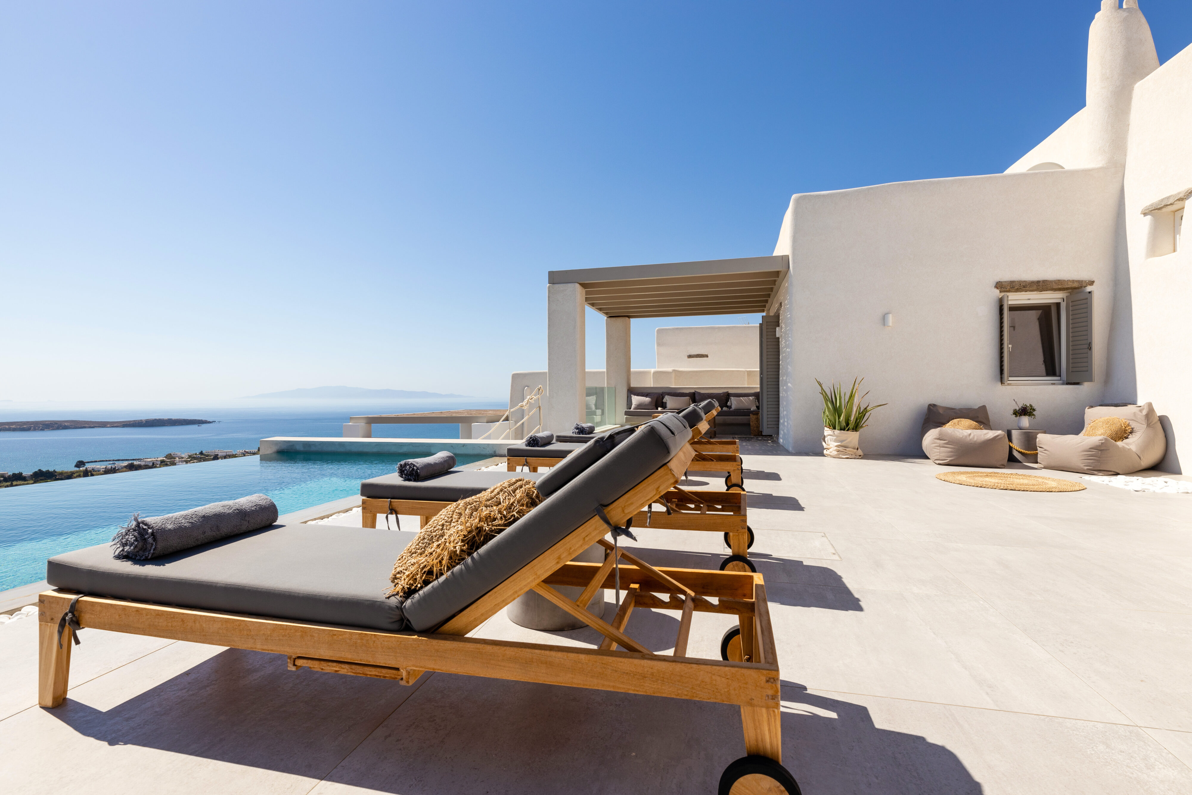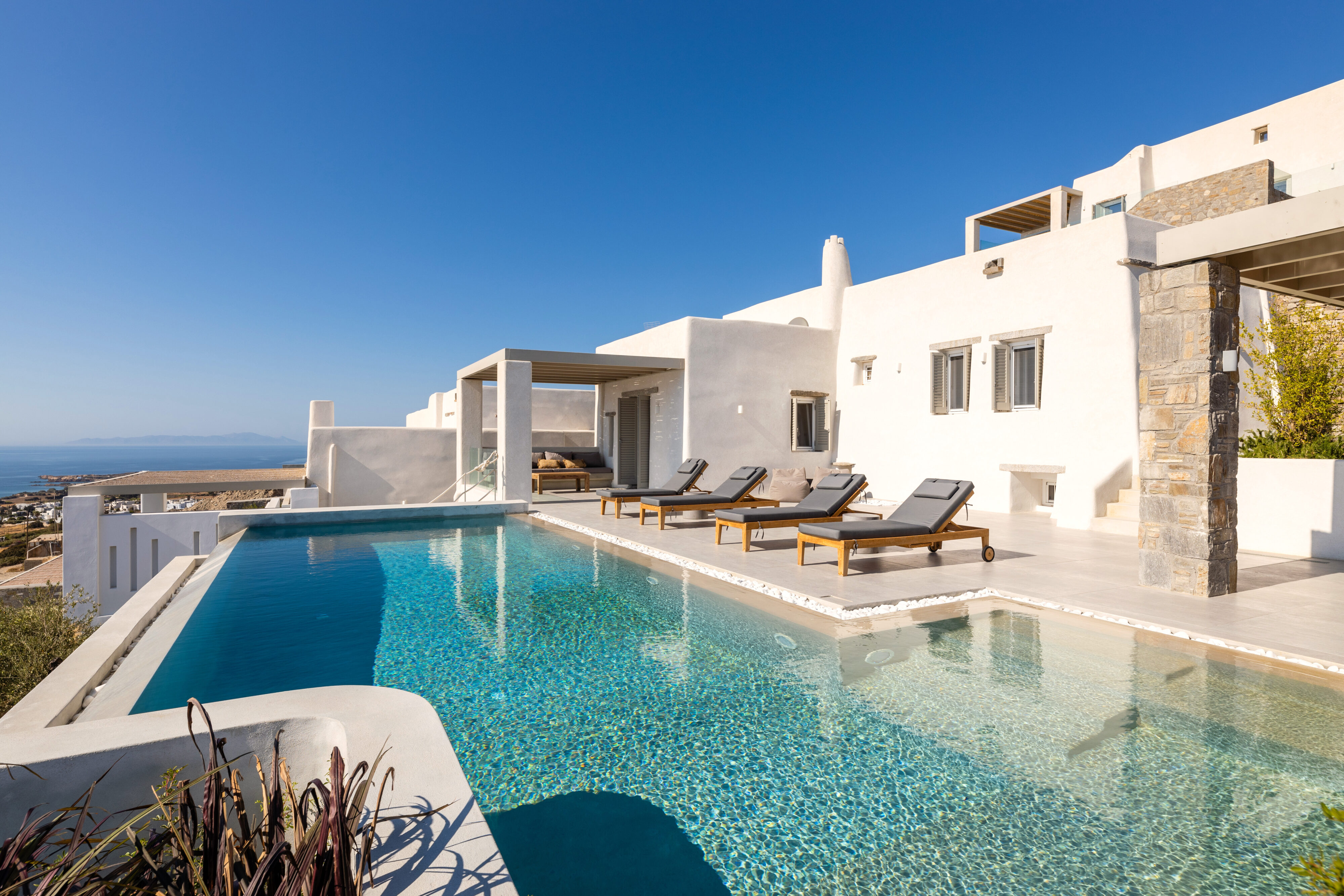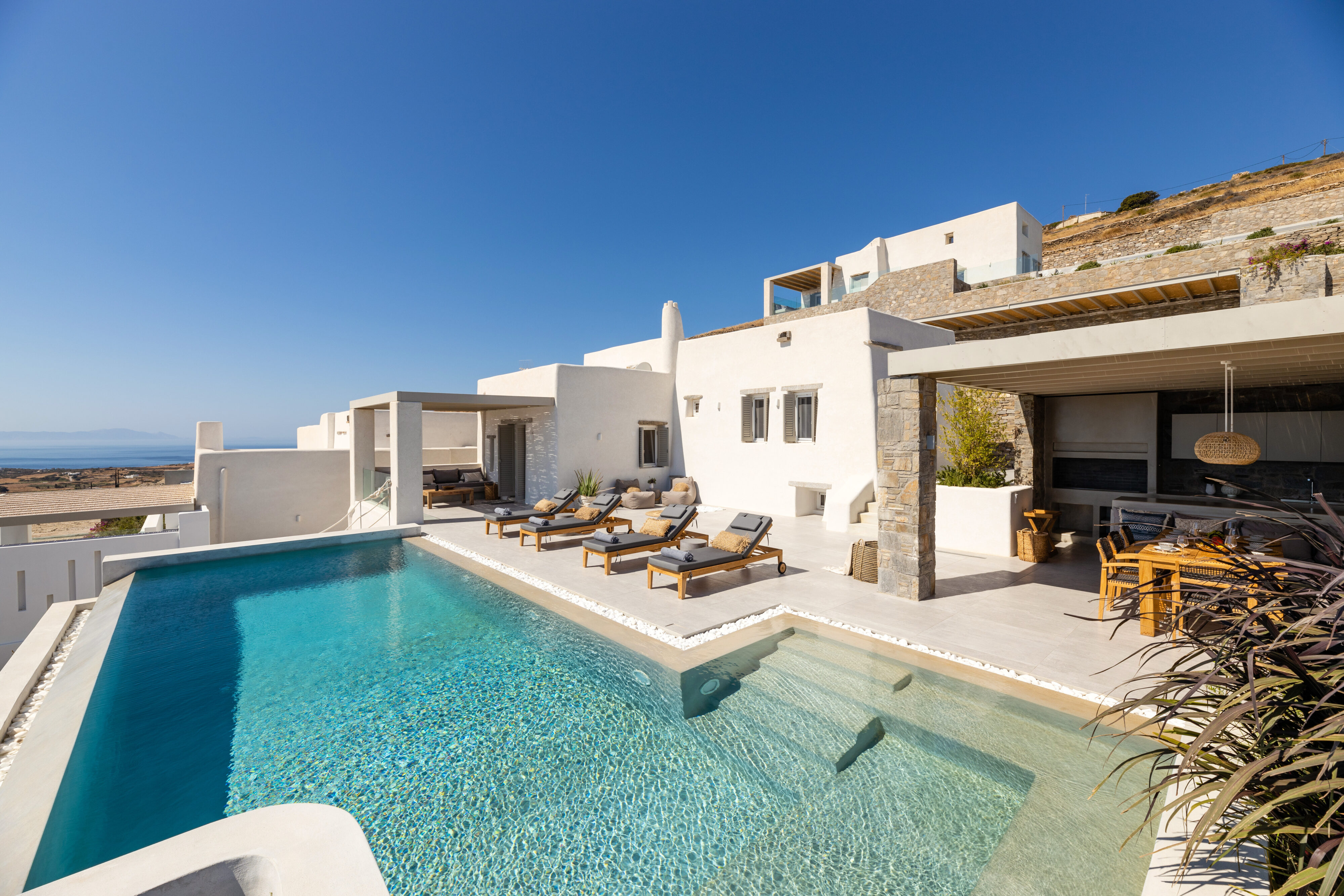Villa Derfi 1 in Dryos, Paros, is a glamorous escape for 4 couples or groups of up to 10. The guest master bedroom offers a private garden for seclusion, while the pool’s bench bed is the ultimate spot to lounge, soak up the sun, and enjoy island life.