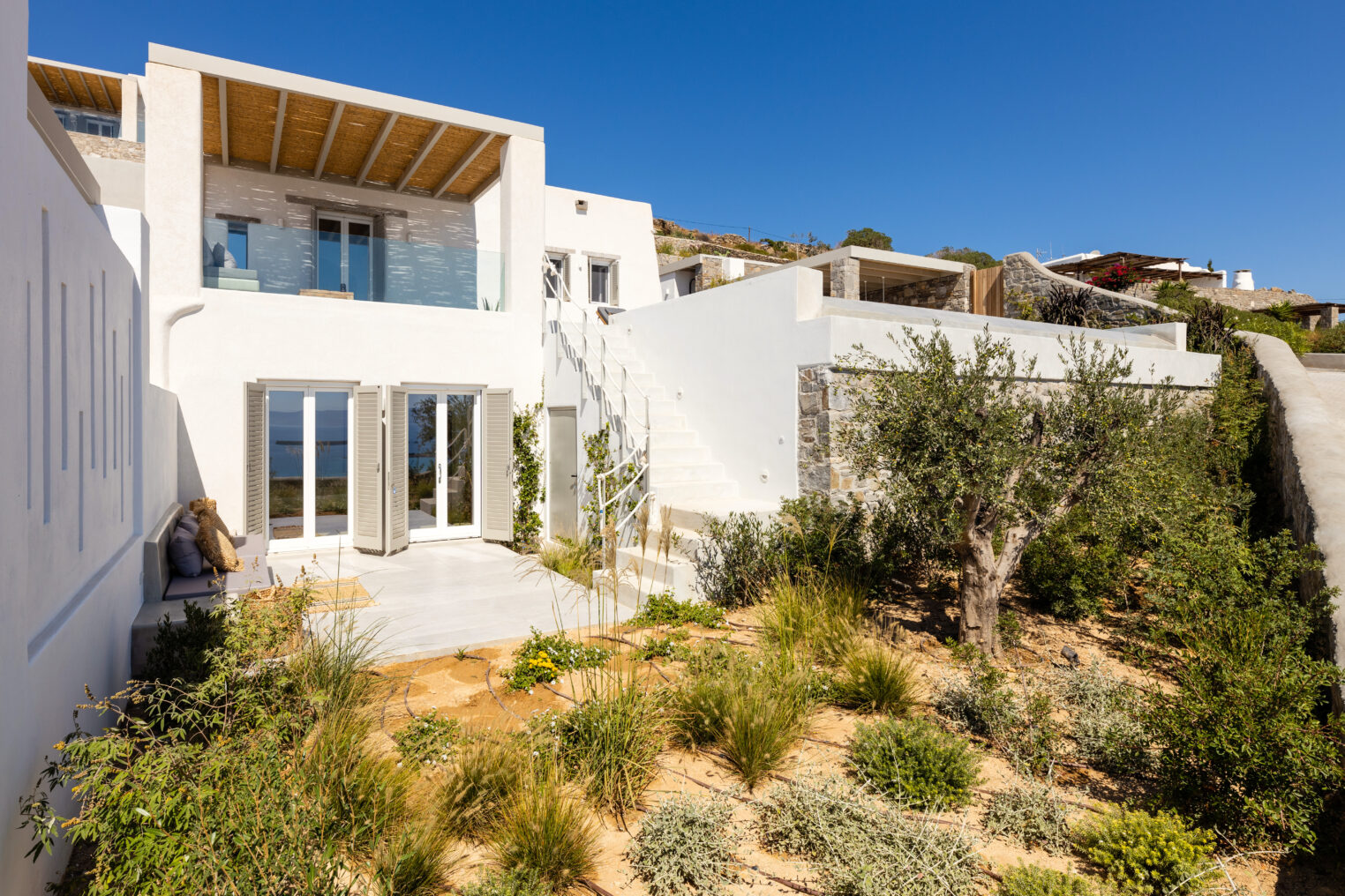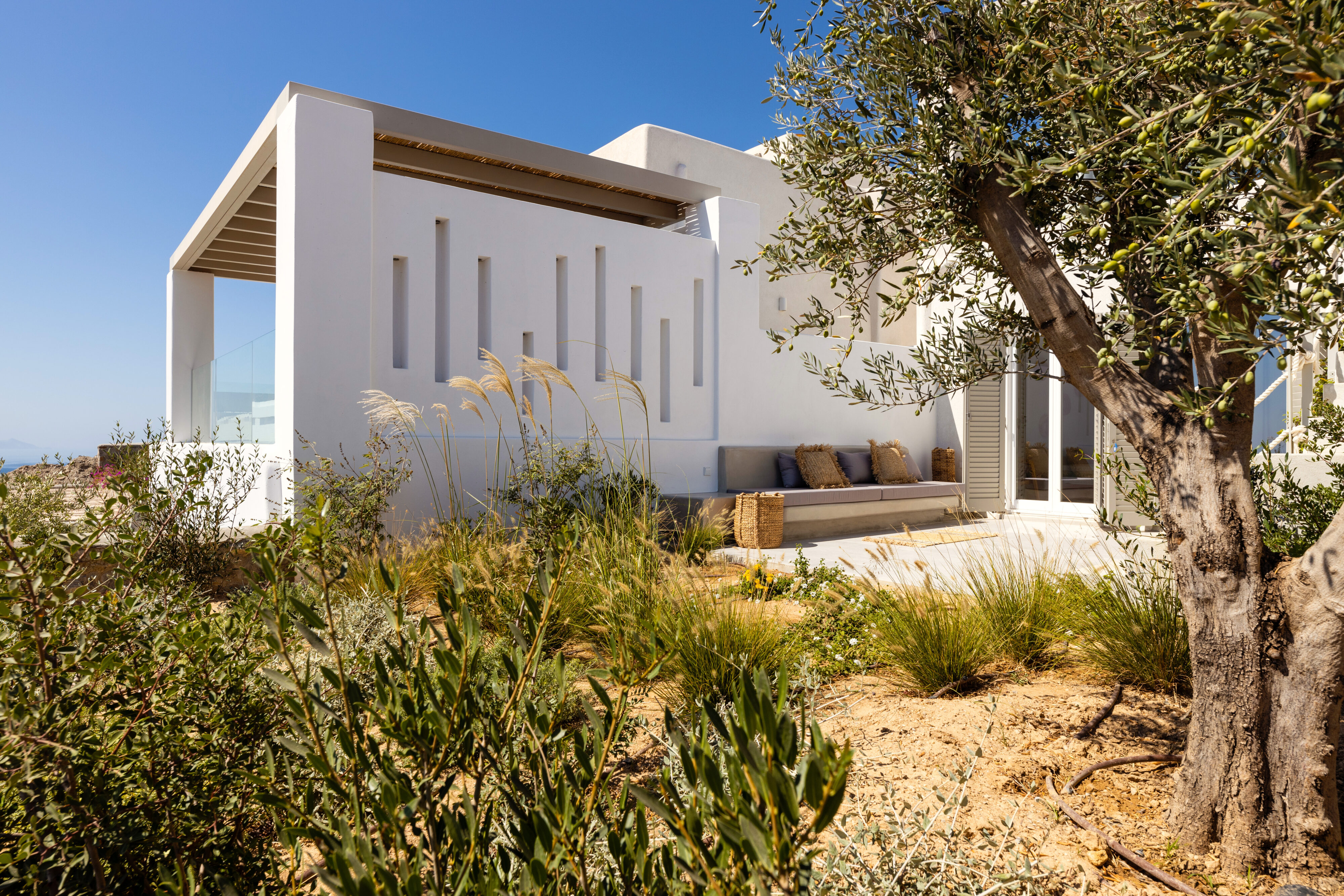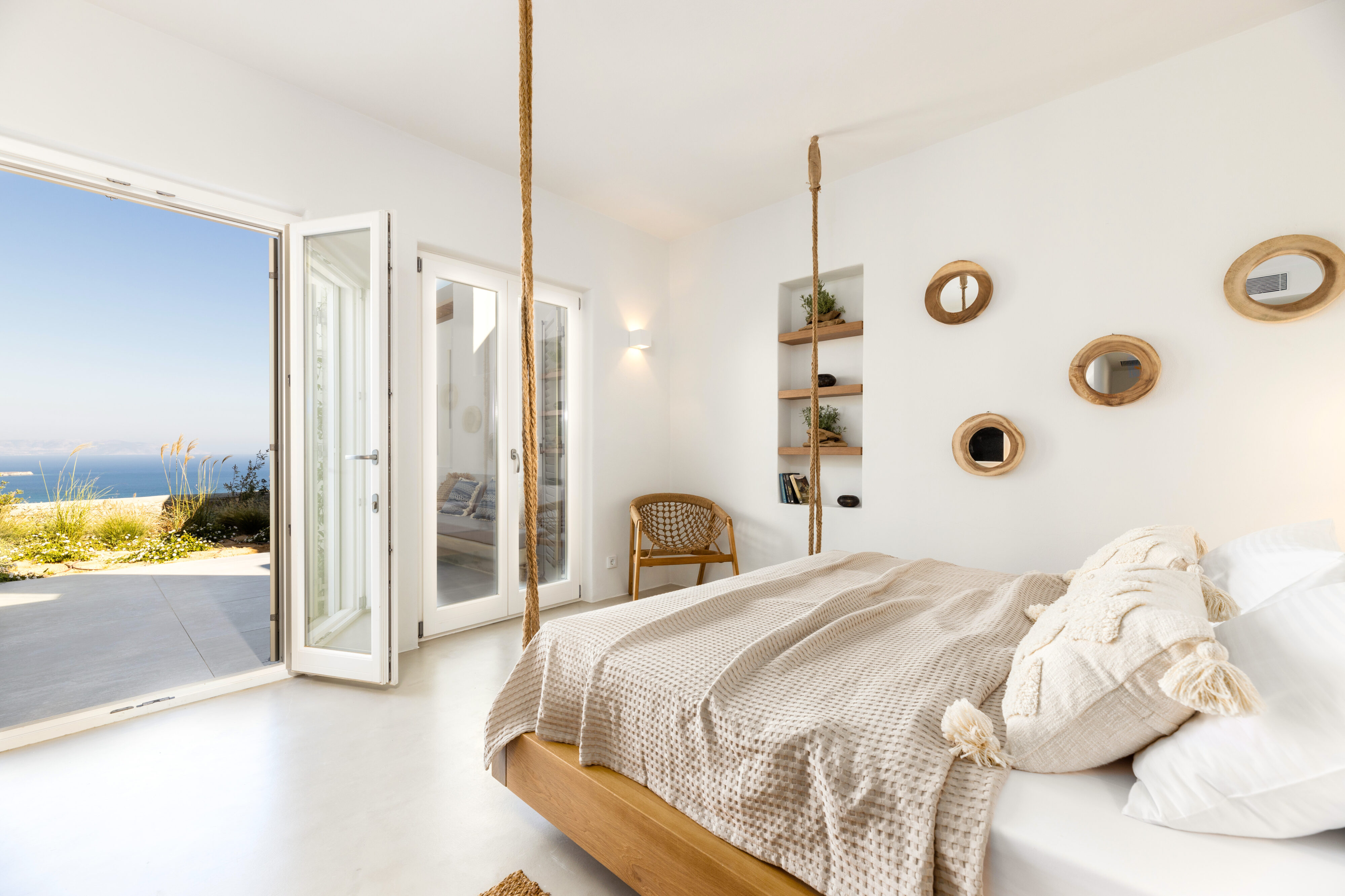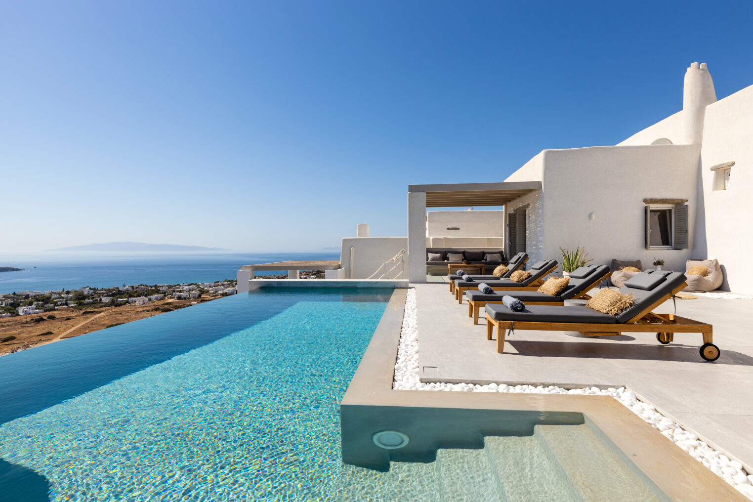 Villa Derfi 1 in Dryos, Paros, is a glamorous escape for 4 couples or groups of up to 10. The guest master bedroom offers a private garden for seclusion, while the pool’s bench bed is the ultimate spot to lounge, soak up the sun, and enjoy island life.