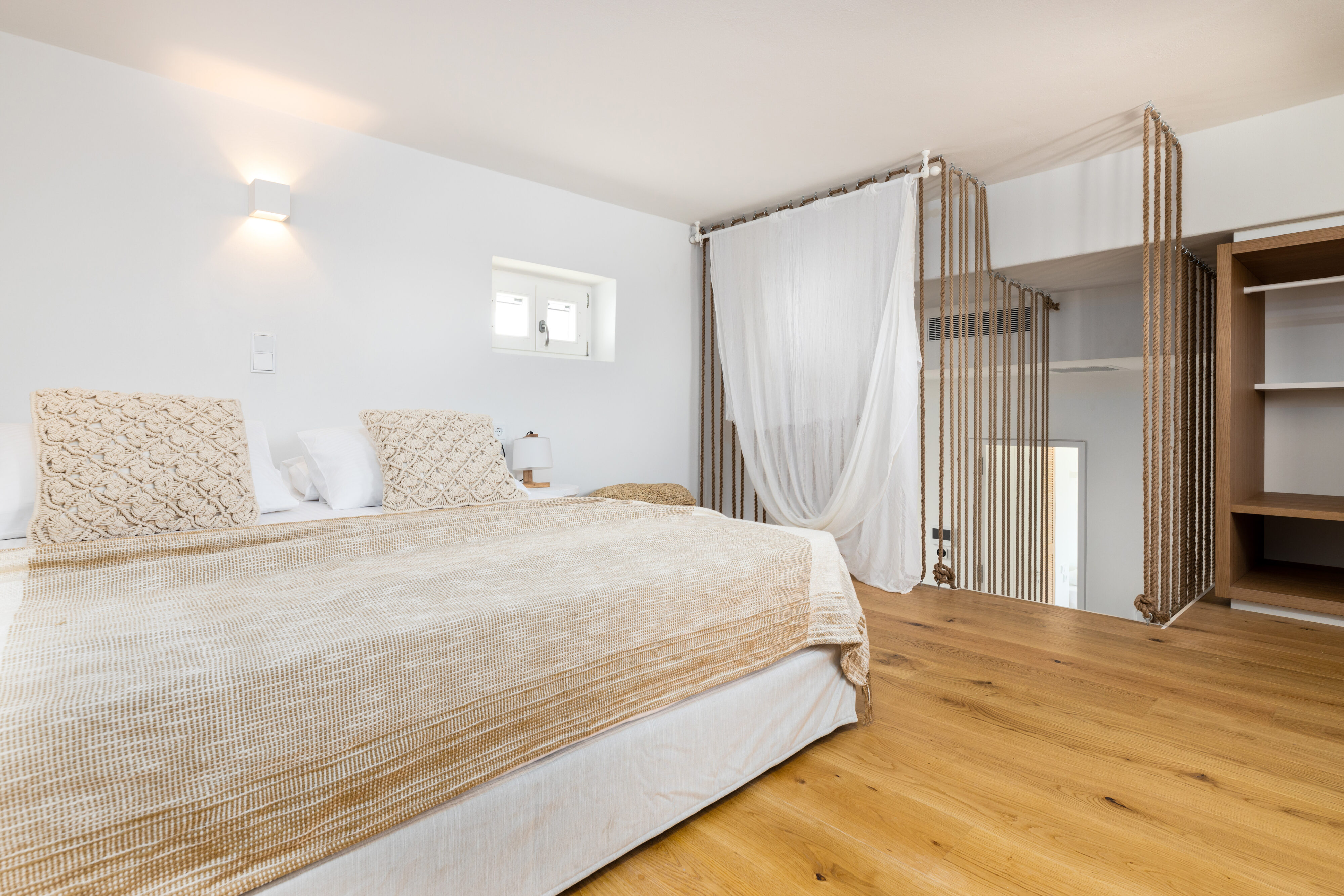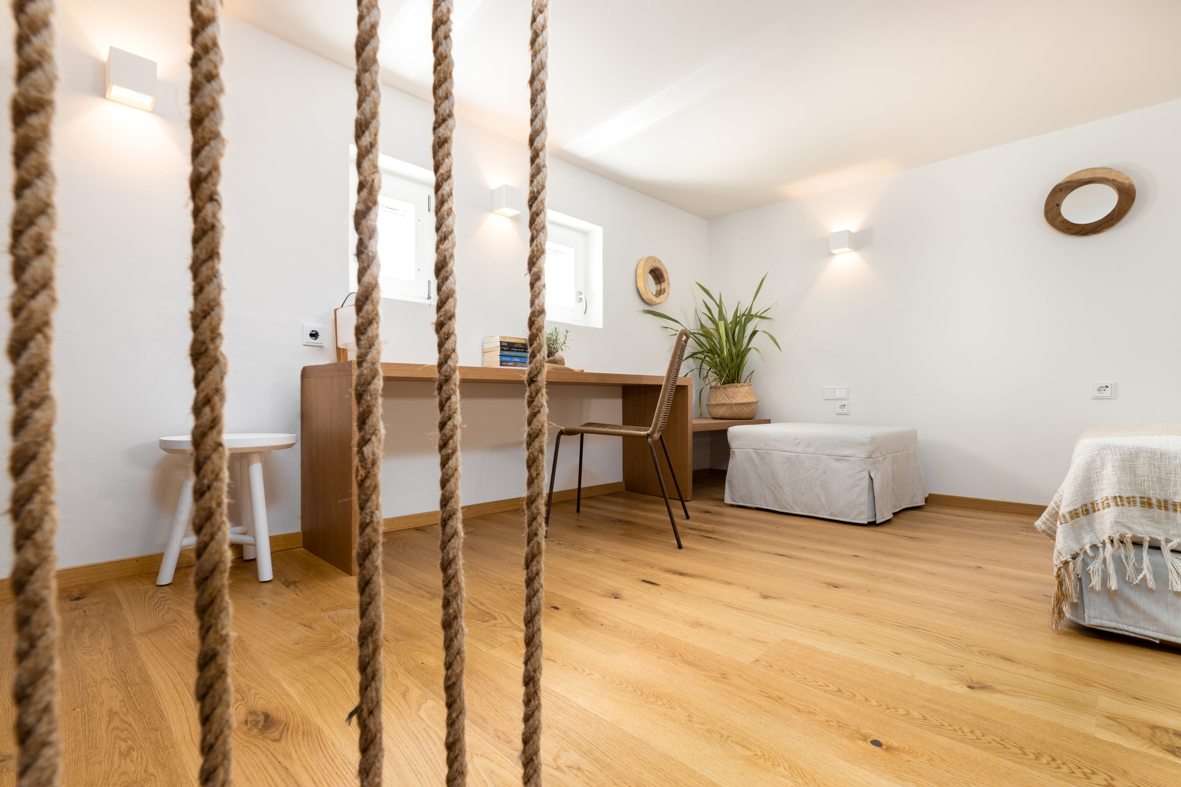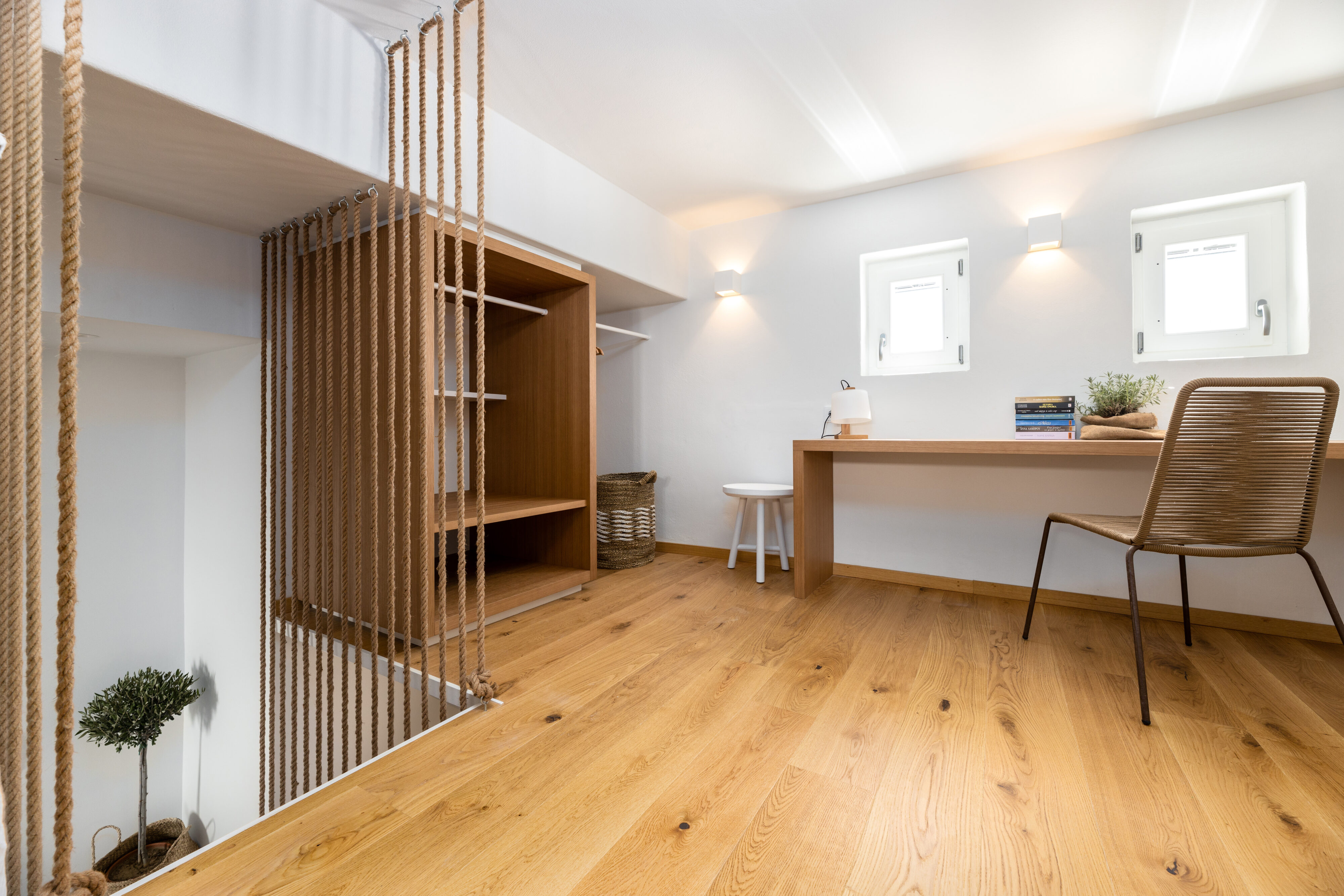 Mezzanine Double bedroom with an extra single bed, guest WC access, long writing desk, sea view