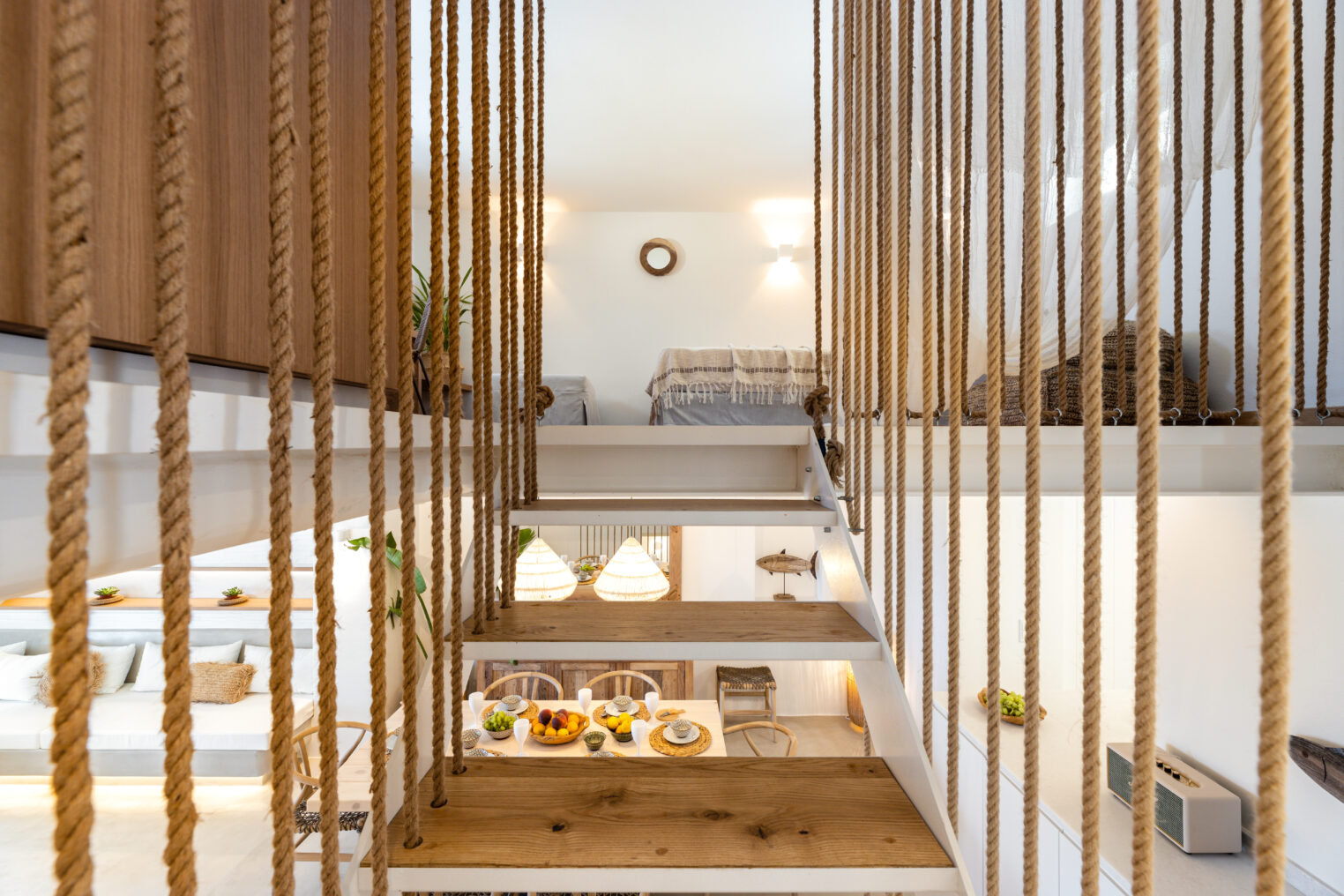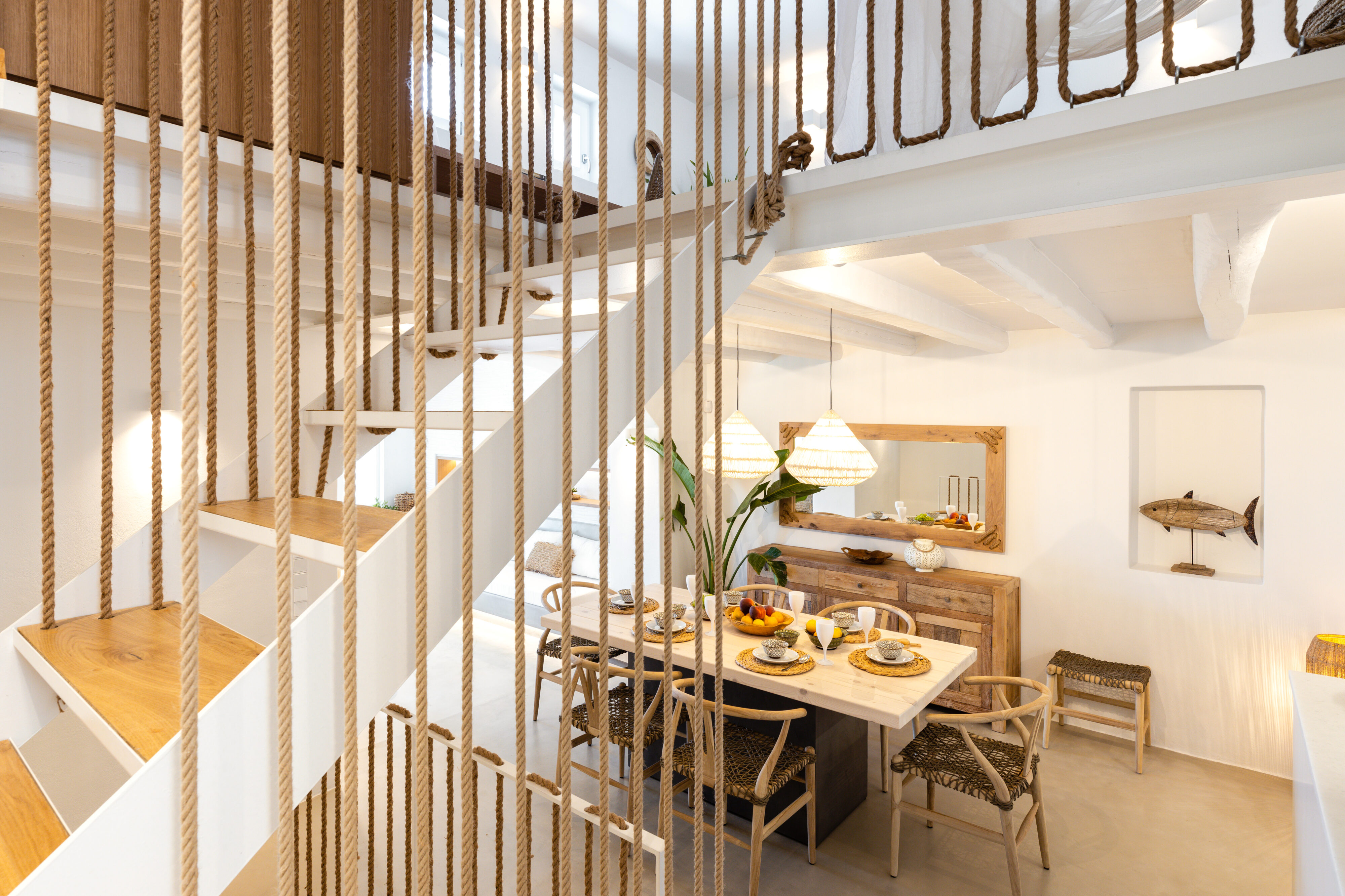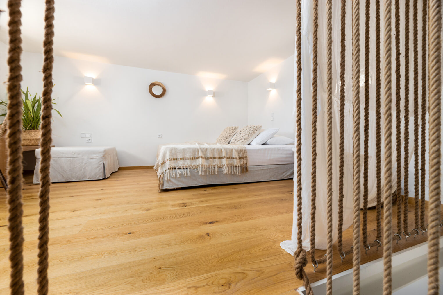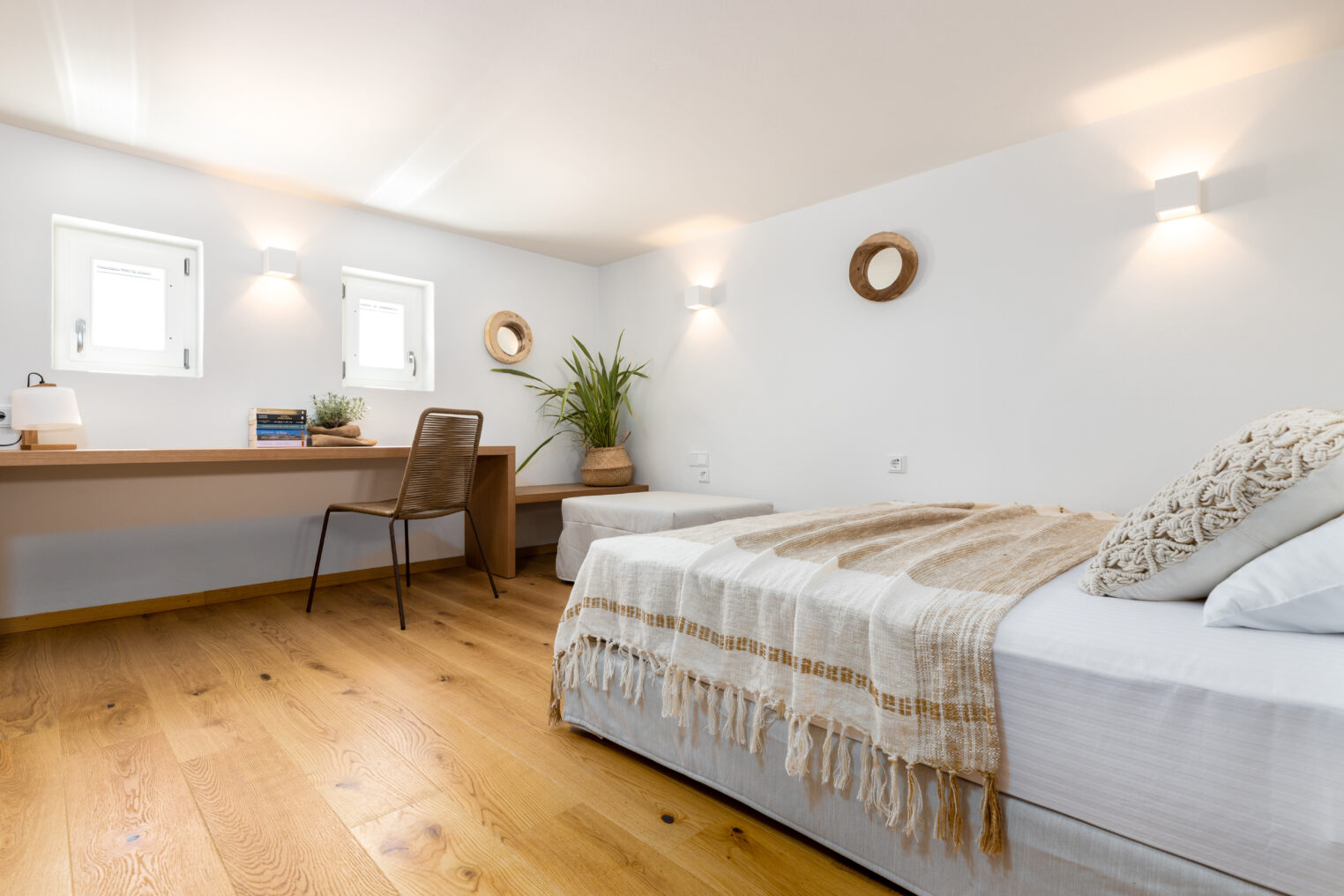 Mezzanine Double bedroom with an extra single bed, guest WC access, long writing desk, sea view