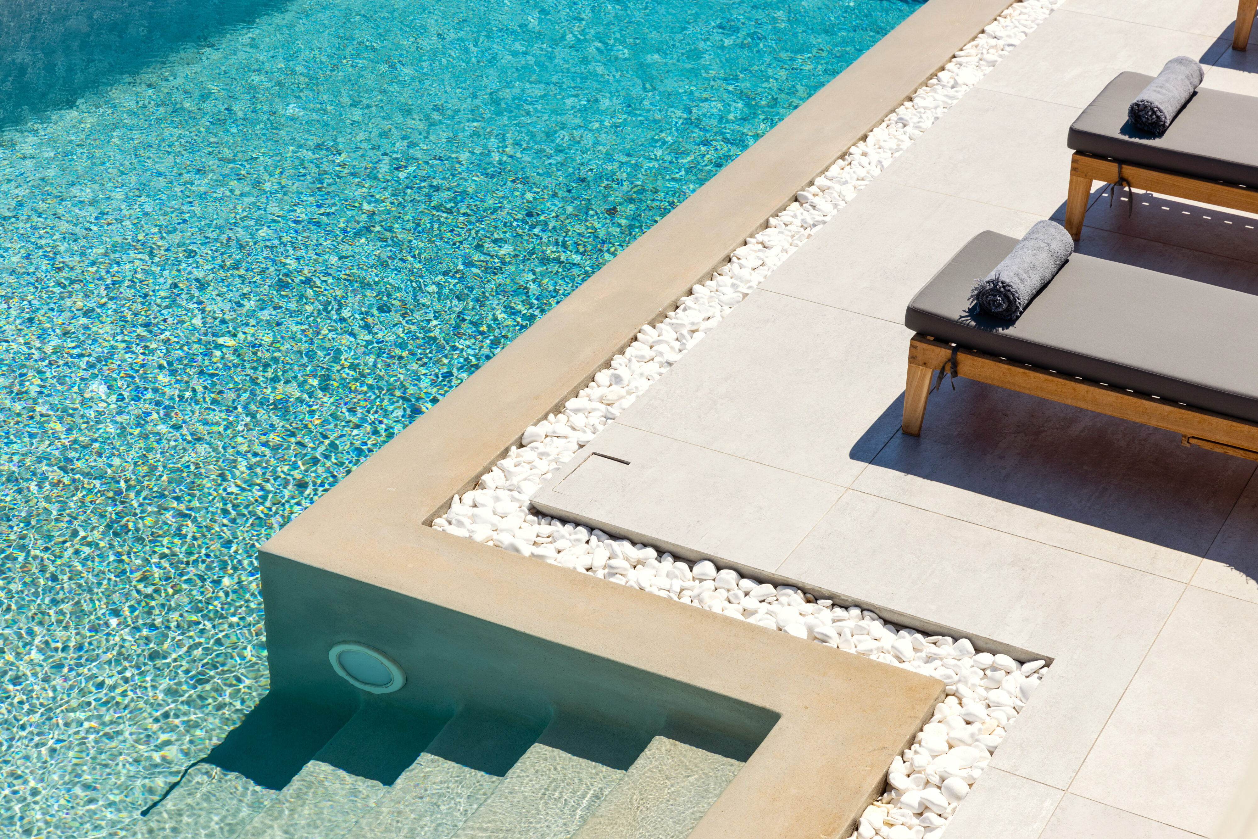 Large swimming pool with sunbeds & shaded lounge area