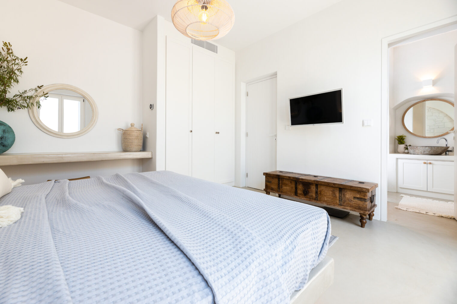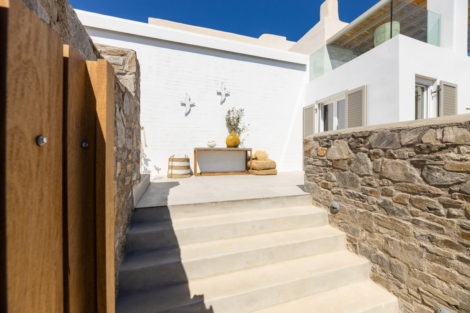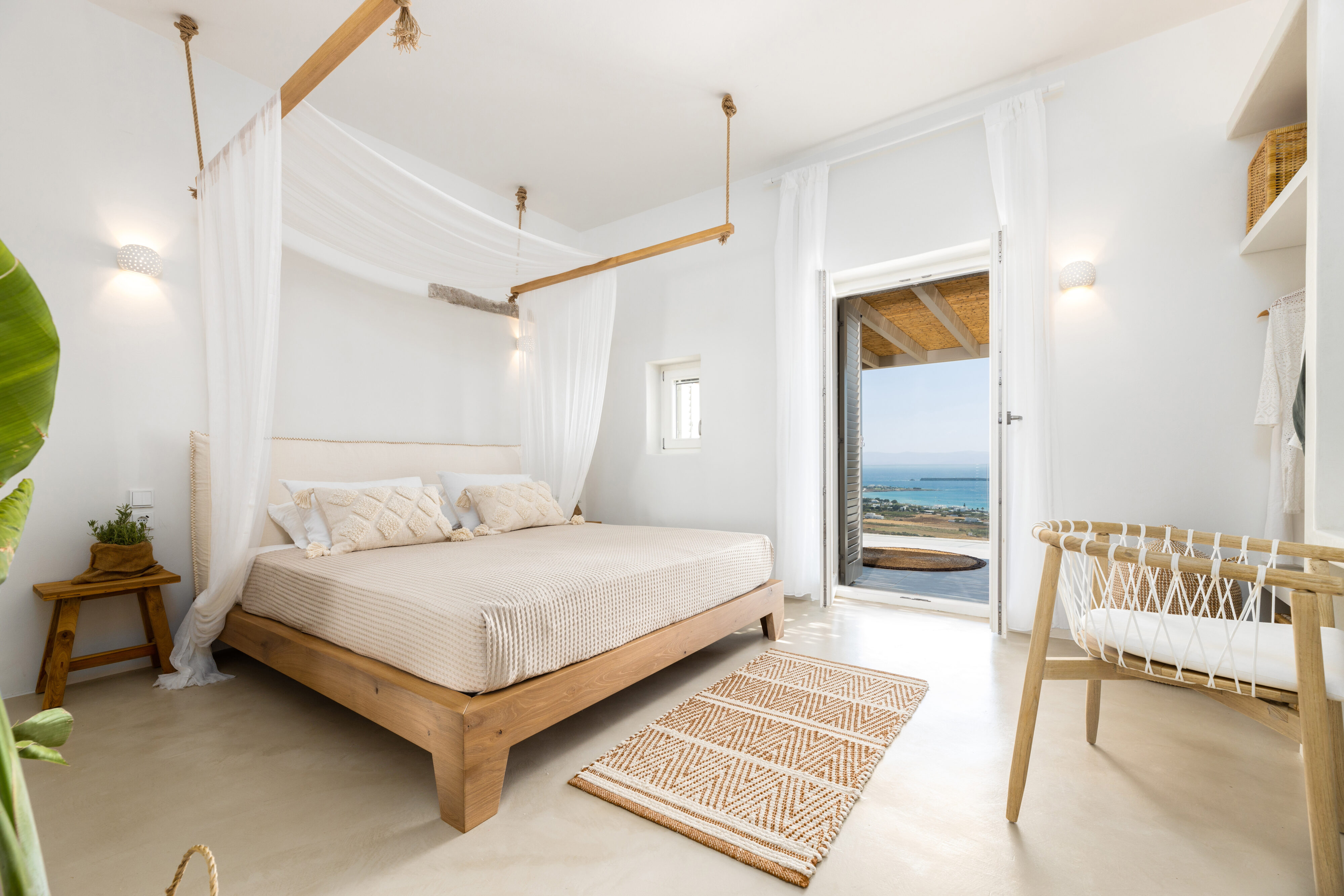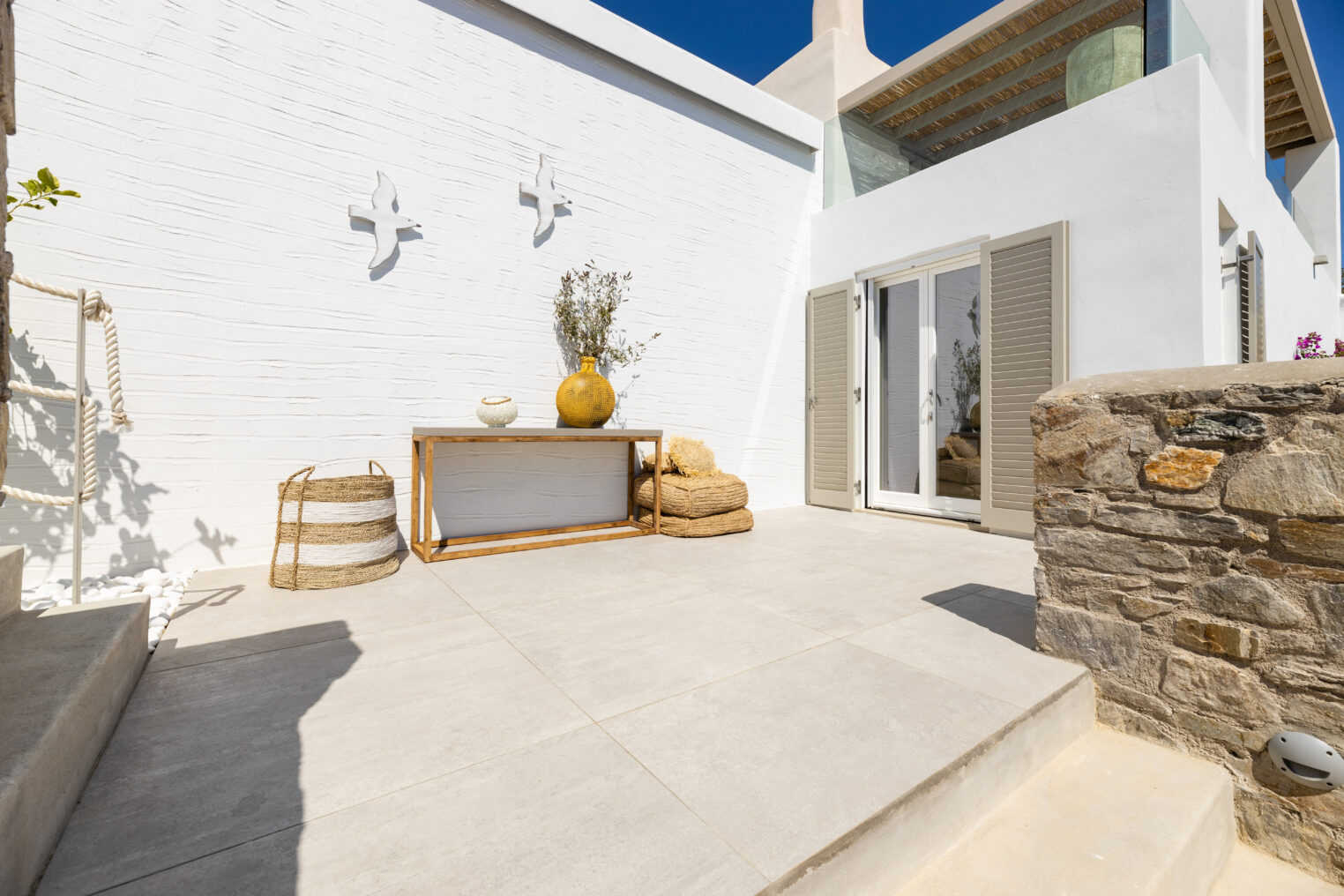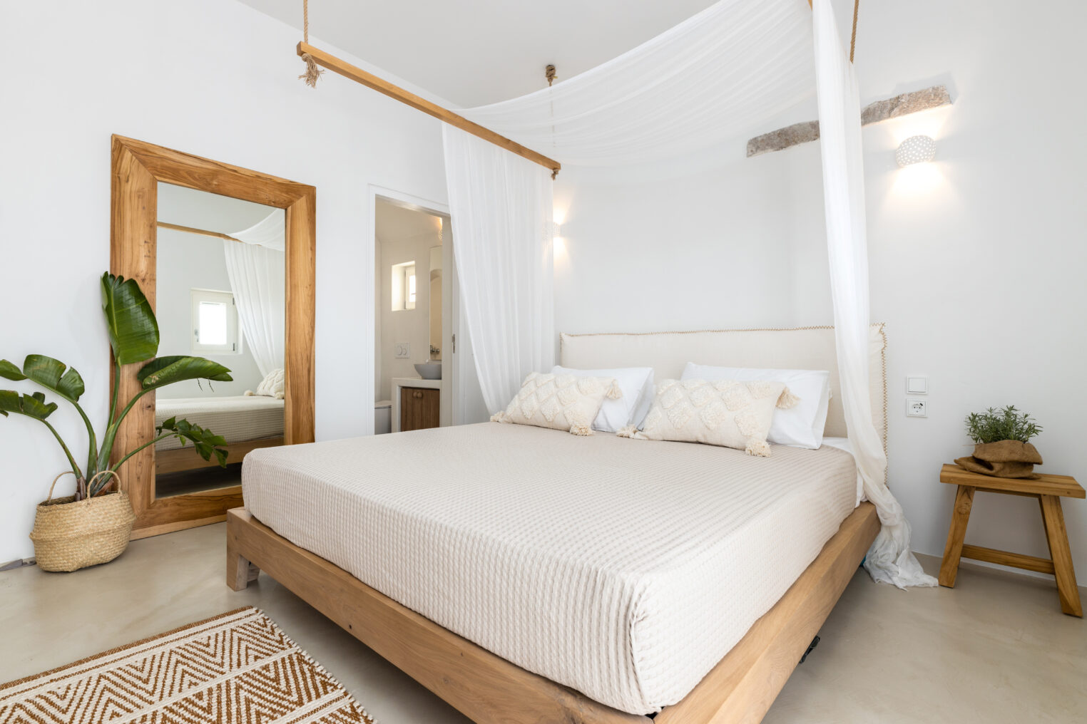 Villa Derfi 2 in Dryos, Paros, for 4 couples or up to 8 friends and family. Enjoy ultimate privacy with one bedroom set apart from the main villa – perfect for moments of calm amid the luxury.