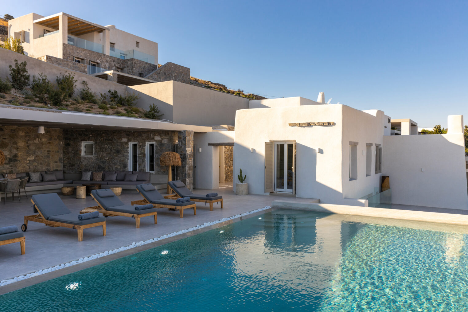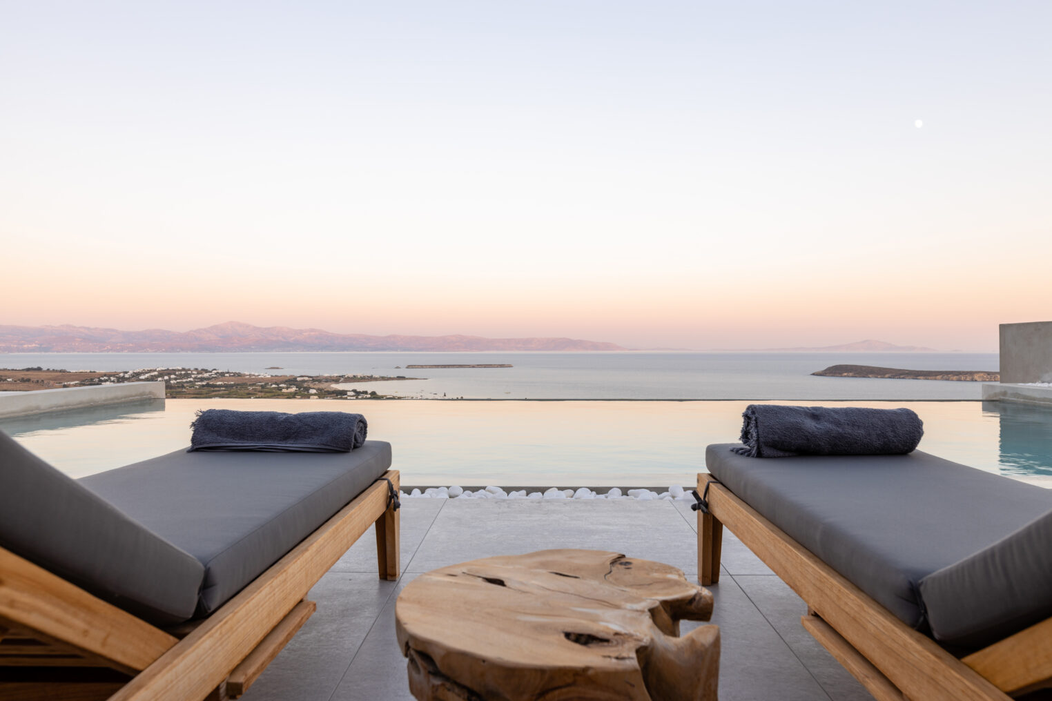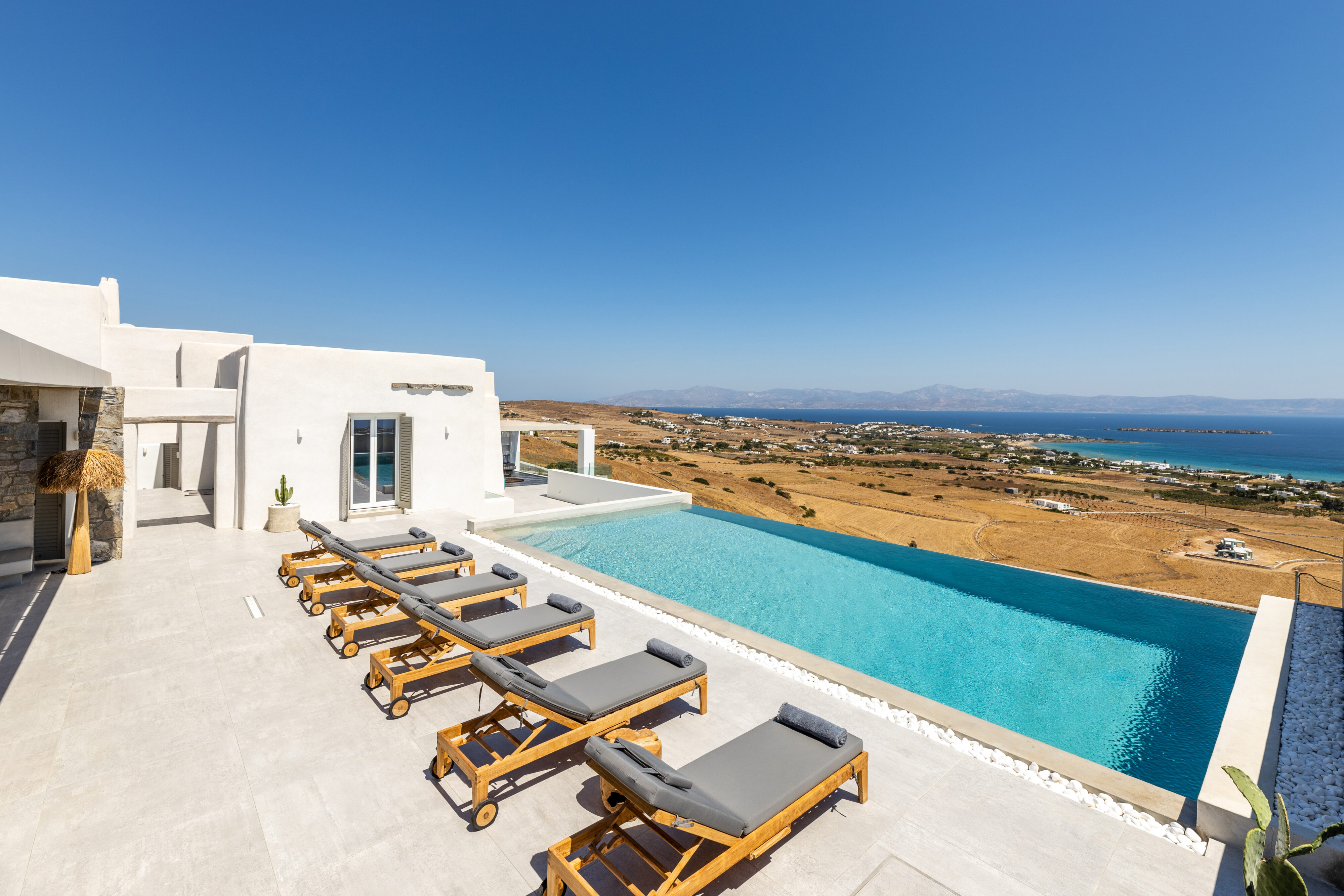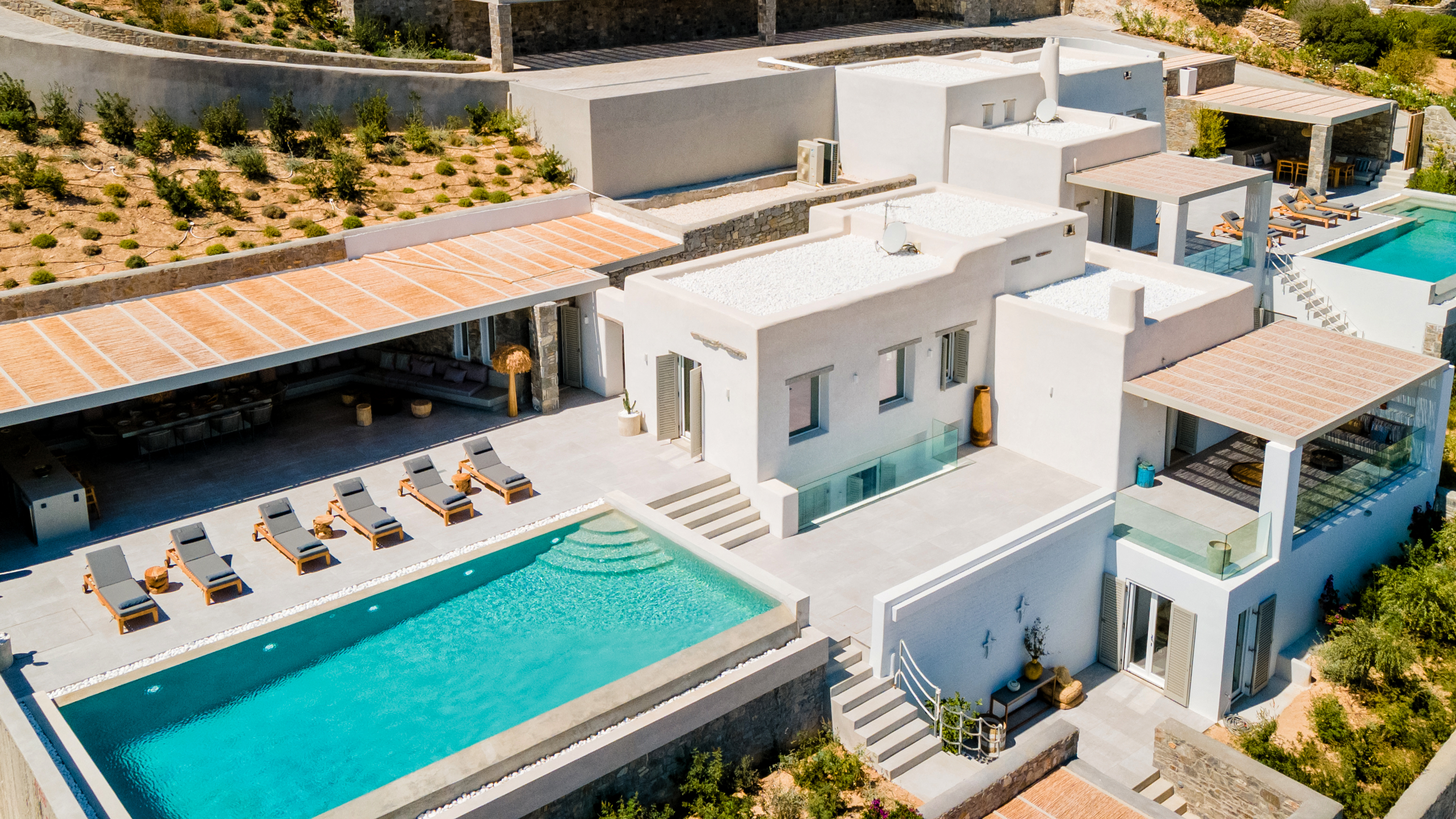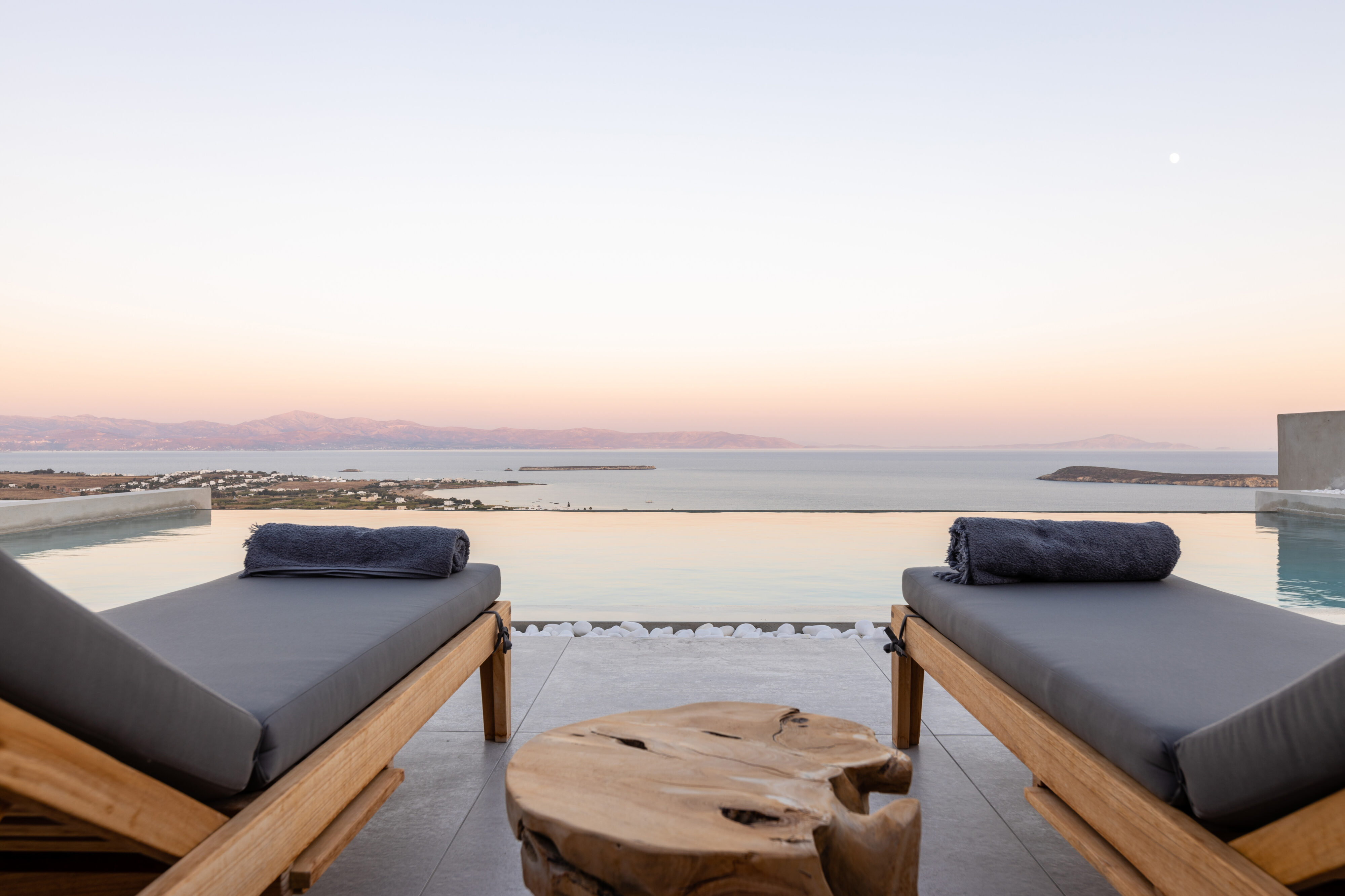Villa Derfi 2 in Dryos, Paros, for 4 couples or up to 8 friends and family. Enjoy ultimate privacy with one bedroom set apart from the main villa – perfect for moments of calm amid the luxury.