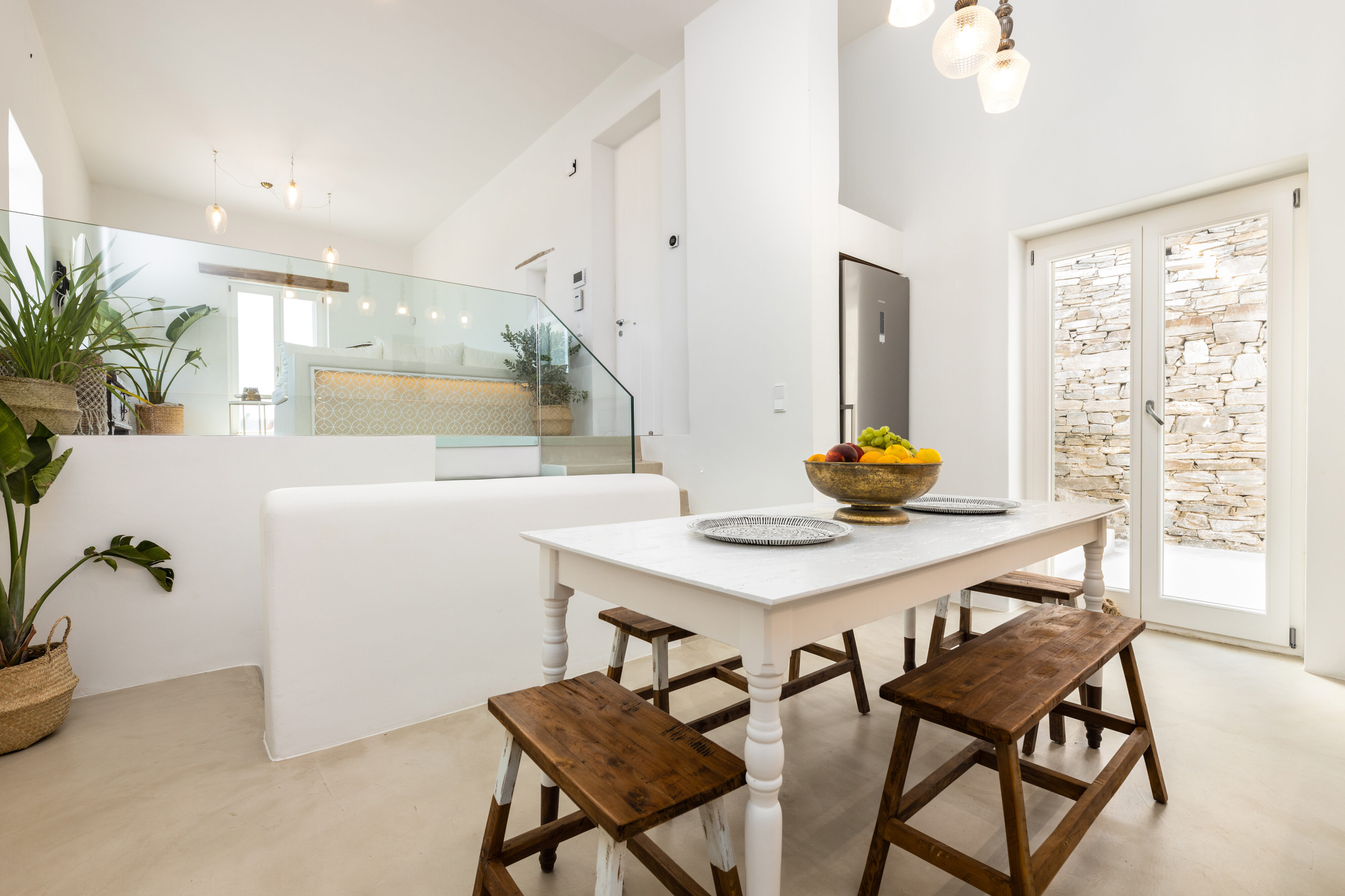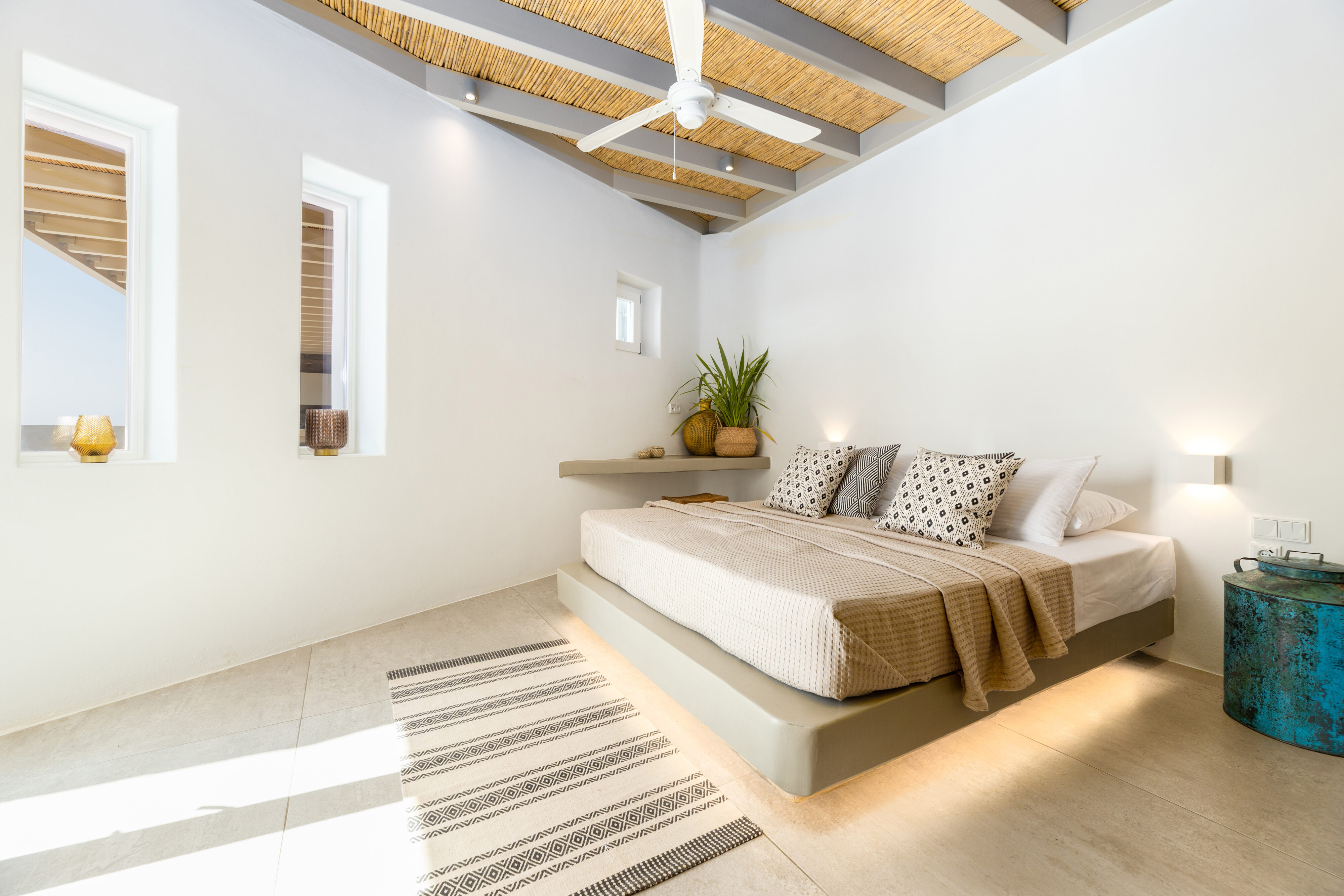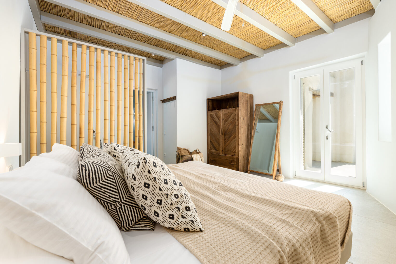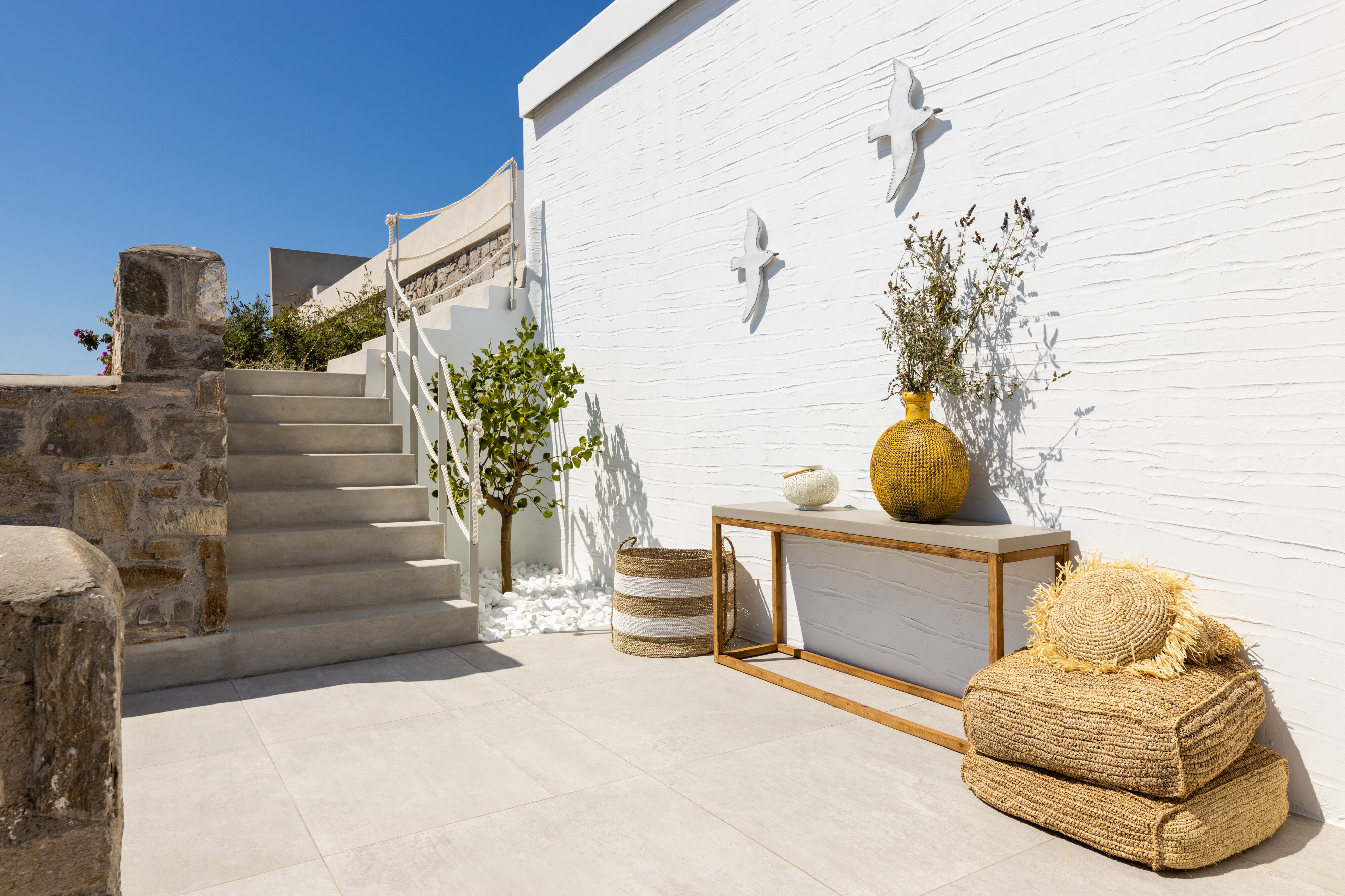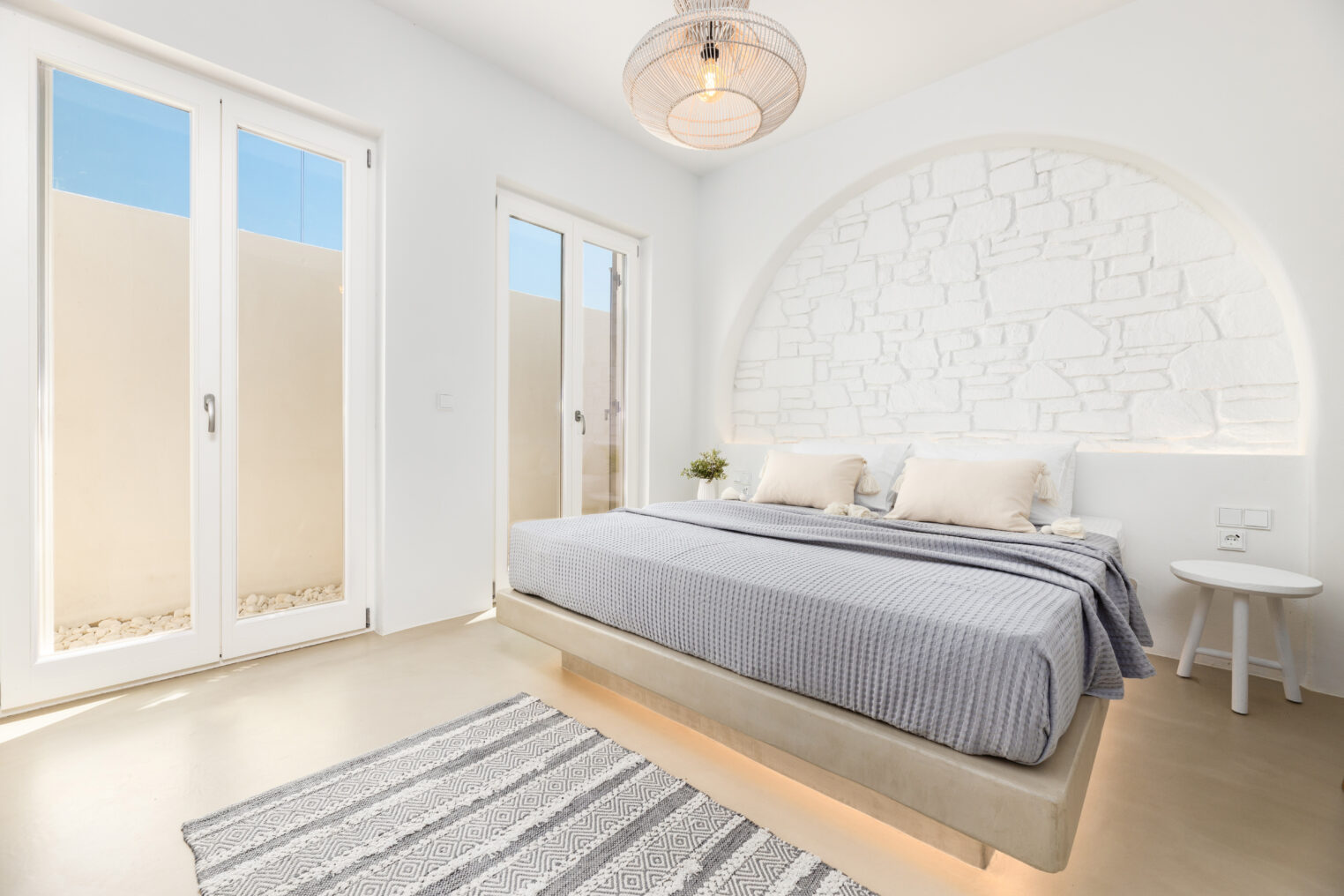 Villa Derfi 2 in Dryos, Paros, for 4 couples or up to 8 friends and family. Enjoy ultimate privacy with one bedroom set apart from the main villa – perfect for moments of calm amid the luxury.