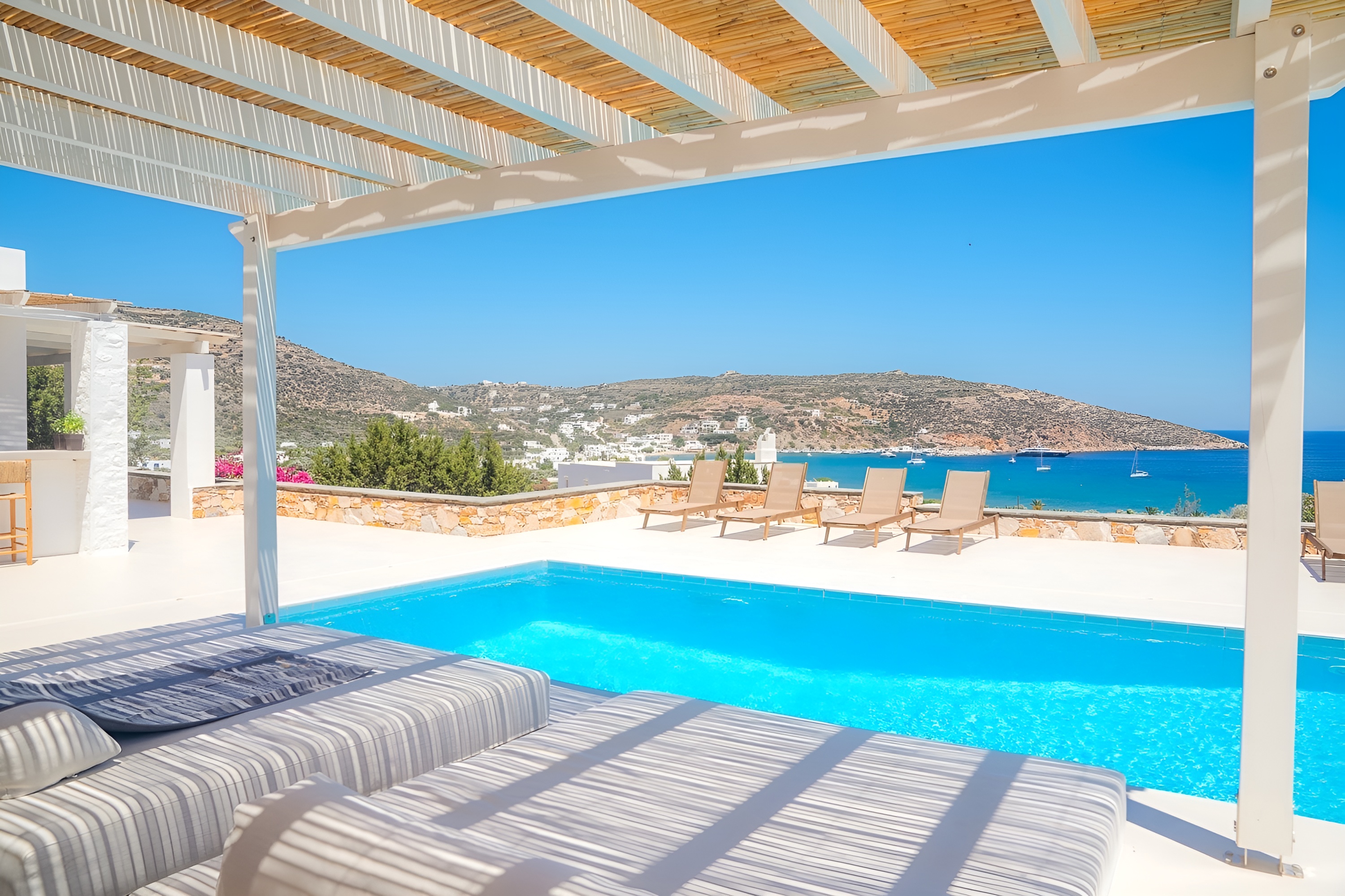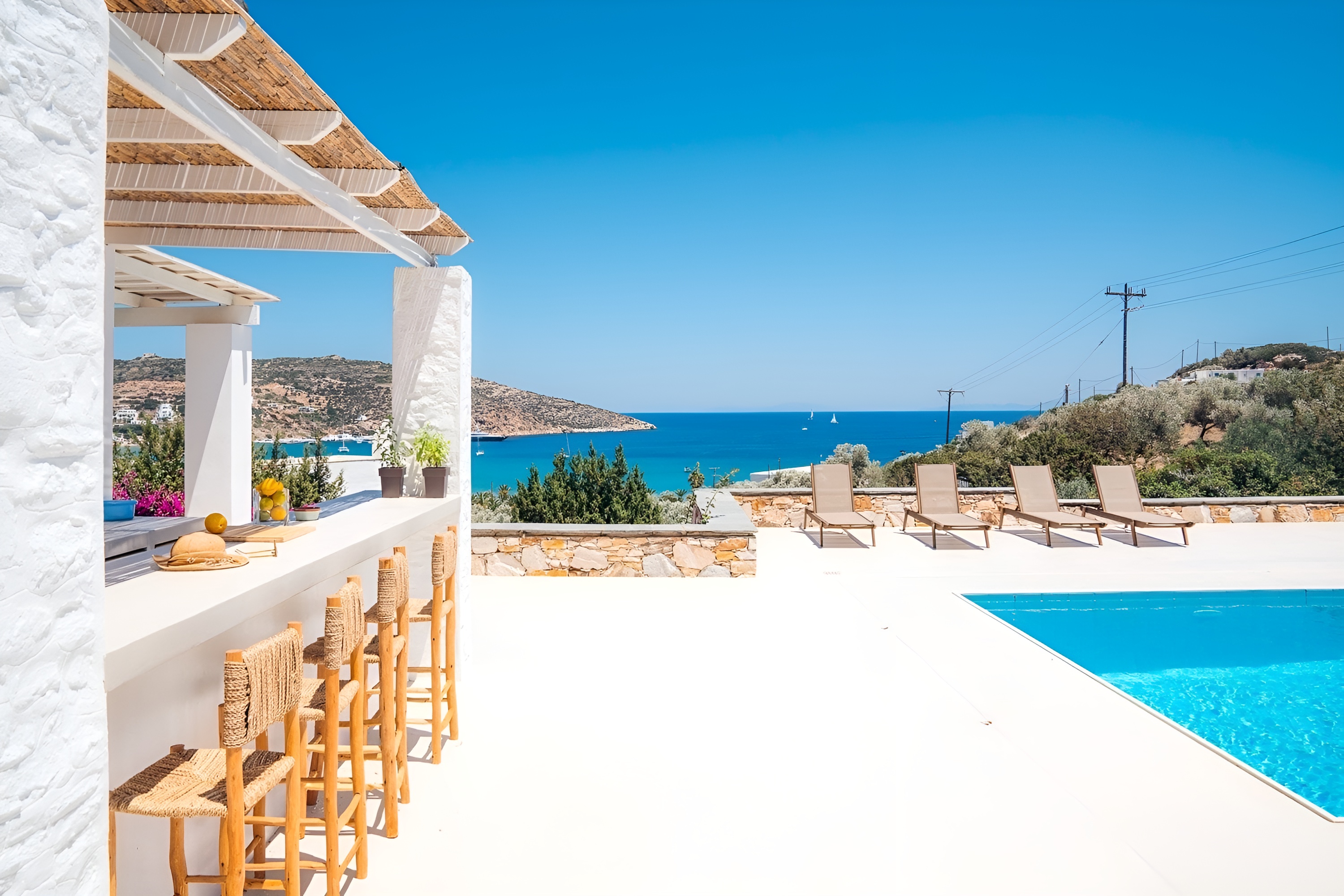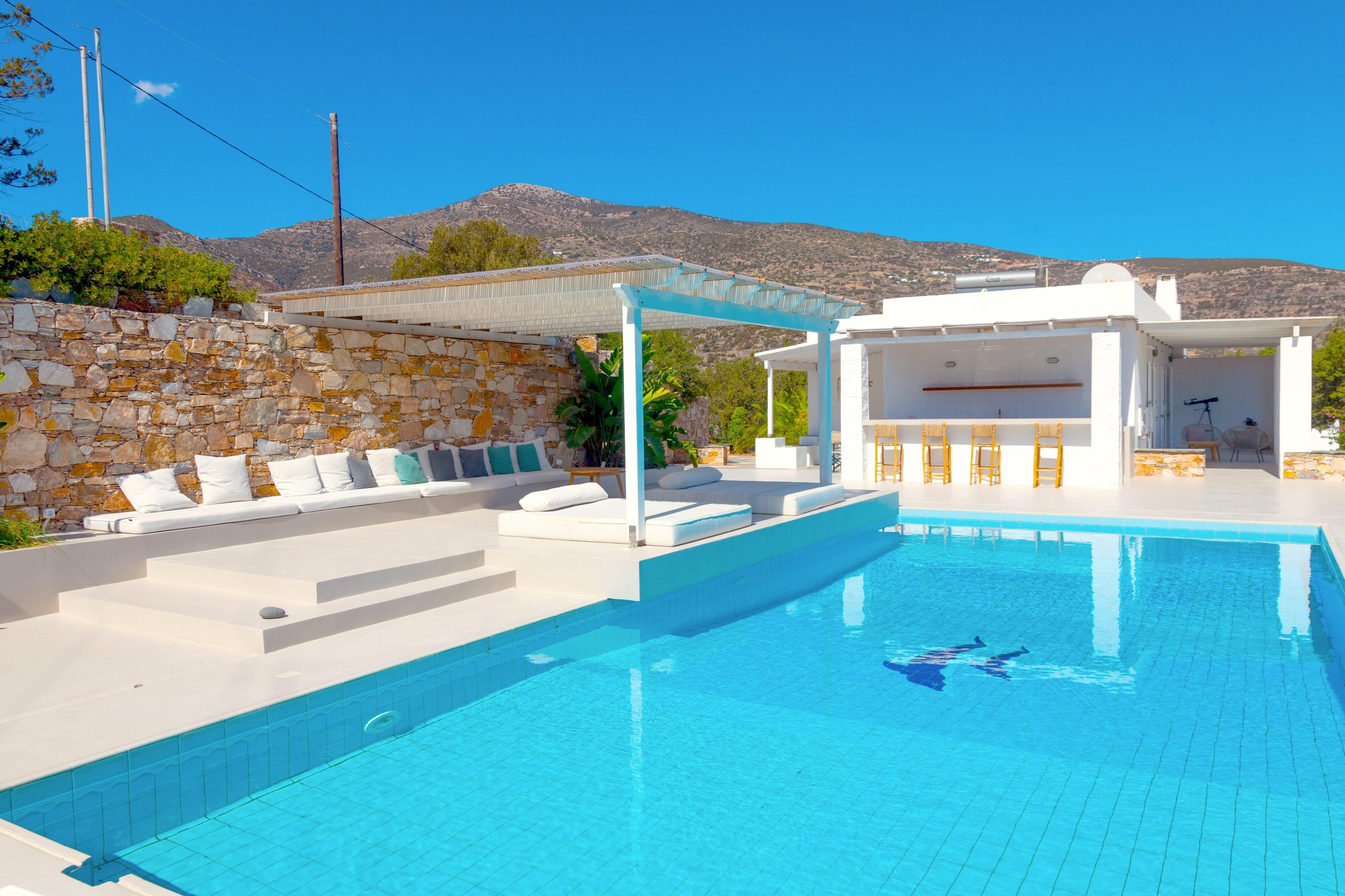 Oliavia Sea View is a 4 – bedroom villa in Platis Gialos, Sifnos, Greece, perfect for up to eight guests seeking elegance and comfort. Nestled in a private location with breathtaking Cycladic sea views, it offers easy access to Platis Gialos beach—just a 7-minute walk or a 2-minute drive away. The villa boasts a spacious stone terrace, a private pool with a bar, a lush Mediterranean garden, fine dining areas, and multiple shaded lounging spaces. A fully equipped kitchen and barbecue ensure a home-like experience with high-end amenities.