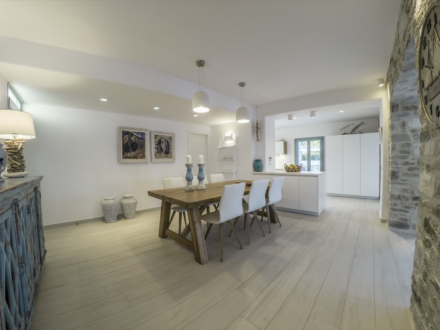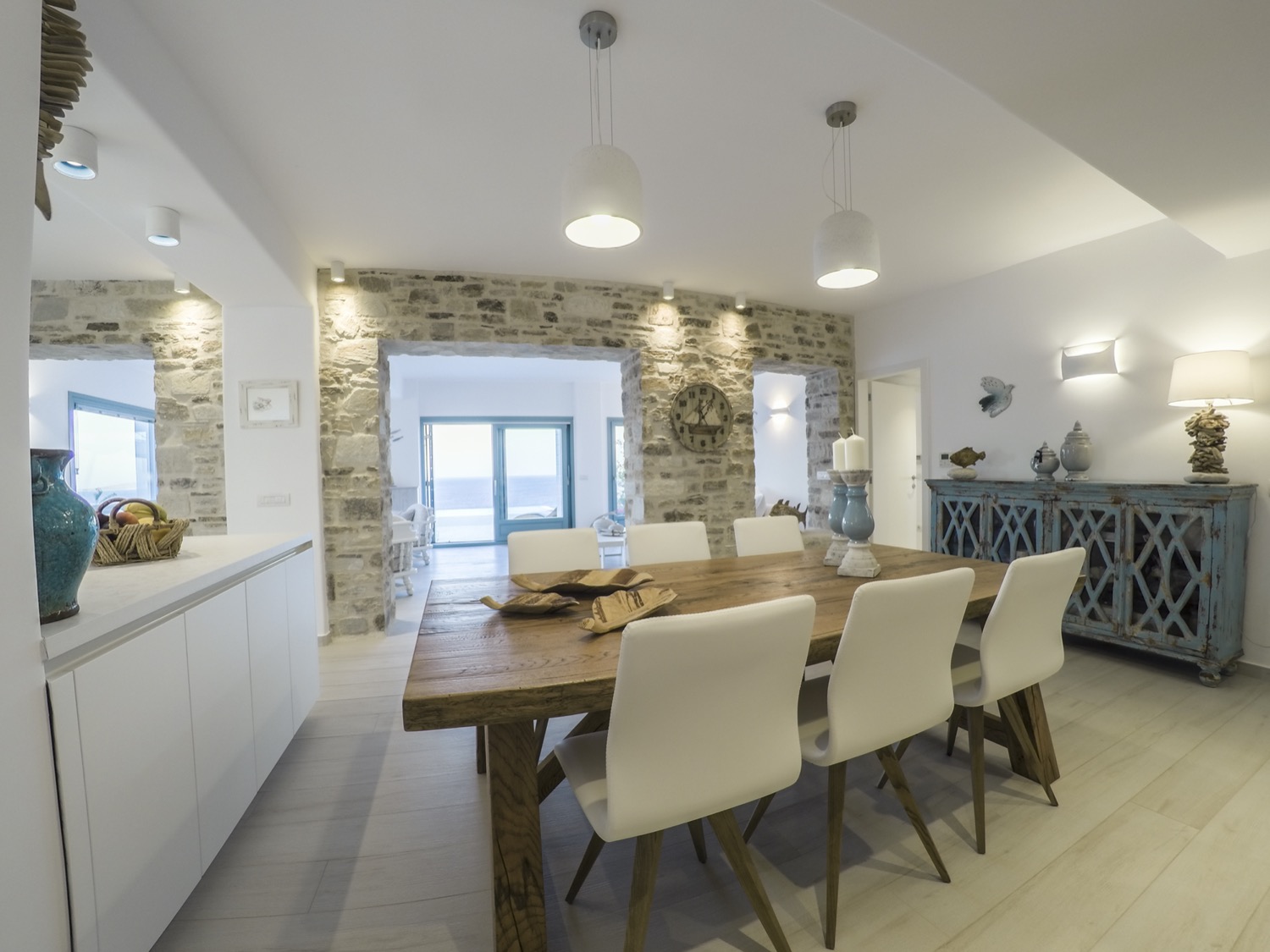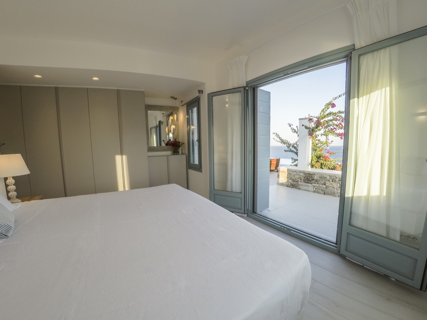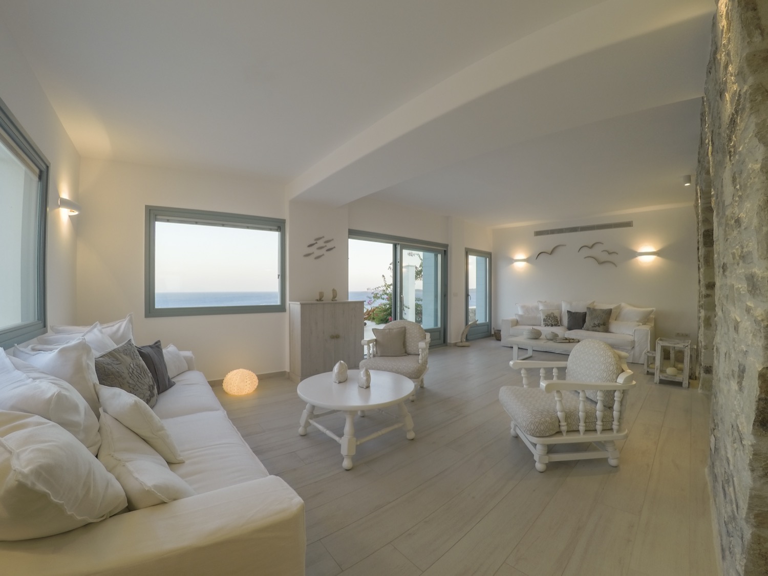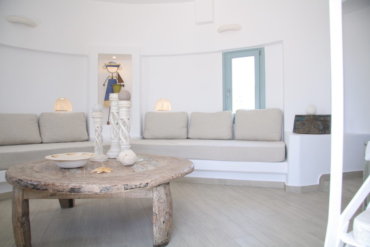 A villa with an adjacent windmill and guesthouse, it captures the essence of Greek summer and pays homage to Cycladic light. An infinity pool sits within tranquil privacy, while a flight of steps leads down to nearby Apantima bay, with its calm waters and Beach House Antiparos.